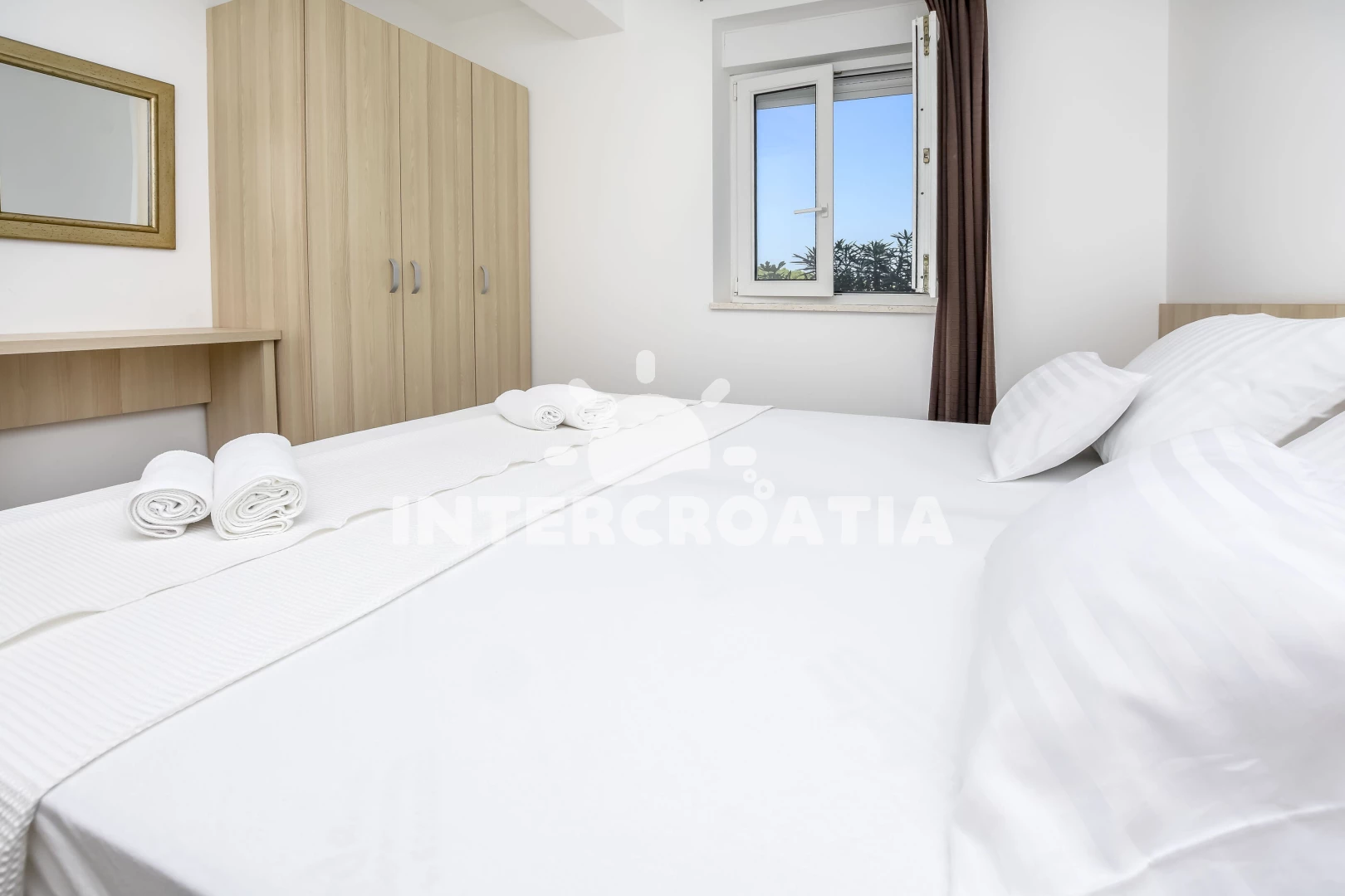 Apartmán (55 m2) s terasou, a výhledem na moře. Nachází se v přízemí objektu. Apartmán má 2 ložnice a je vhodný pro až 4 osoby. Kuchyňská linka je vybavena varnou deskou, troubou, kávovarem, mikrovlnnou troubou, rychlovarnou konvicí, nádobím, lednicí, mrazákem. K dispozici televize se satelitním programem. První ložnice s dvoulůžkem. Druhá ložnice s dvoulůžkem. Koupelna se sprchovým koutem, umyvadlem, WC.
