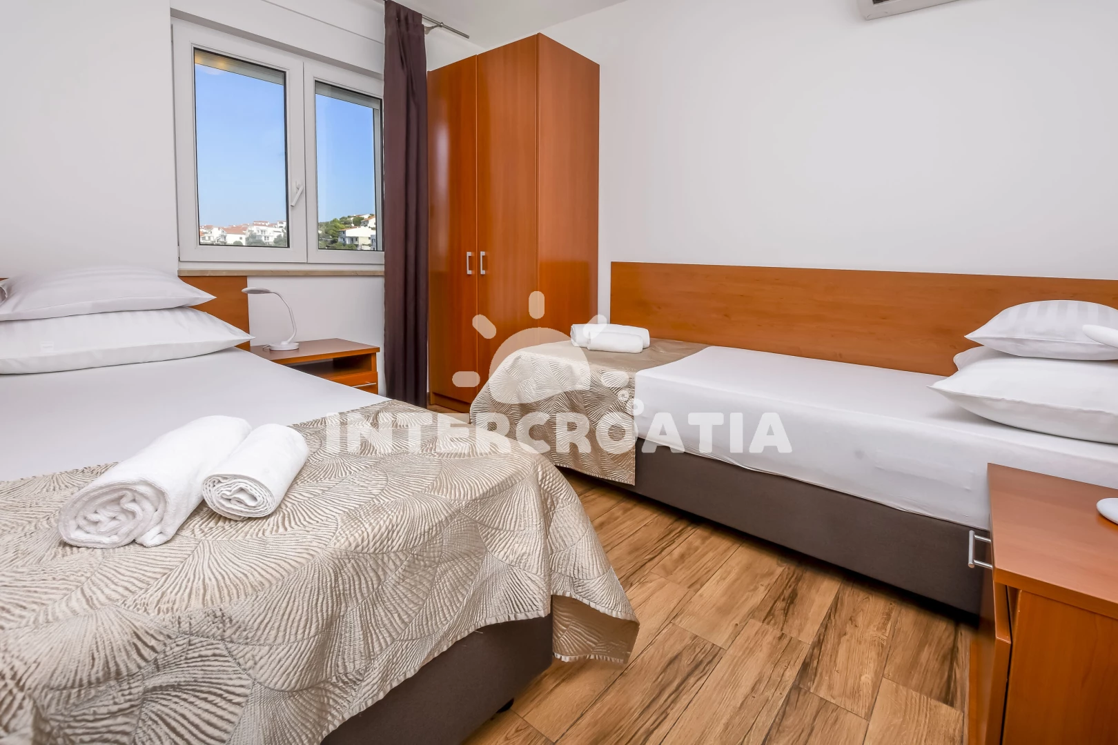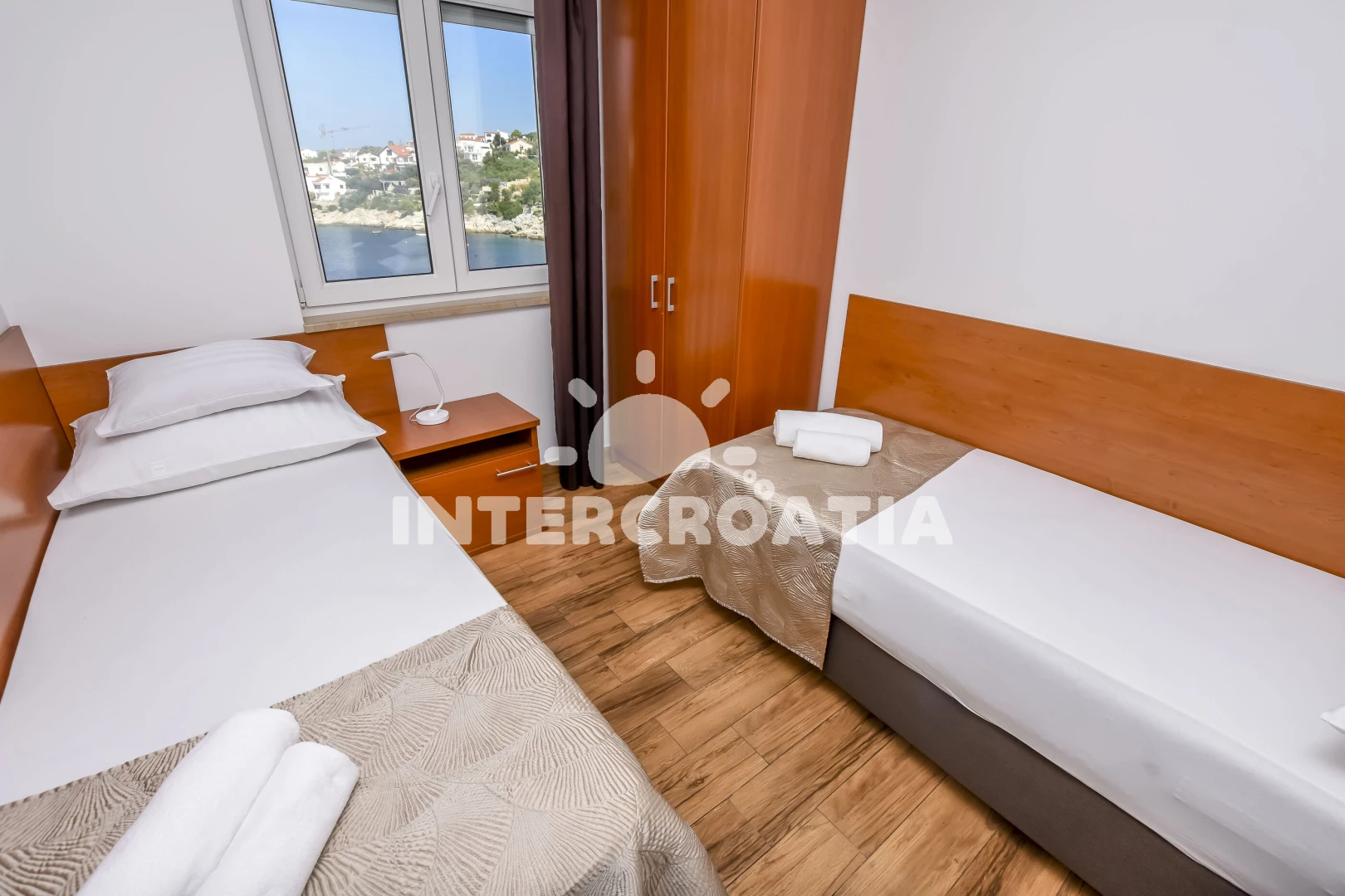 Apartmán (70 m2) s terasou, a výhledem na moře. Nachází se ve 2. patře objektu. Apartmán má 2 ložnice a je vhodný pro až 5 osob. Kuchyňská linka je vybavena varnou deskou, toustovačem, kávovarem, troubou, myčkou na nádobí, mikrovlnnou troubou, rychlovarnou konvicí, nádobím, lednicí, mrazákem. V obývací místnosti je rozložitelná pohovka (extra lůžko pro 1 osobu). K dispozici televize se satelitním programem, žehlička. První ložnice s dvoulůžkem. Druhá ložnice se 2 jednolůžky. Koupelna se sprchovým koutem, umyvadlem, fénem a WC.