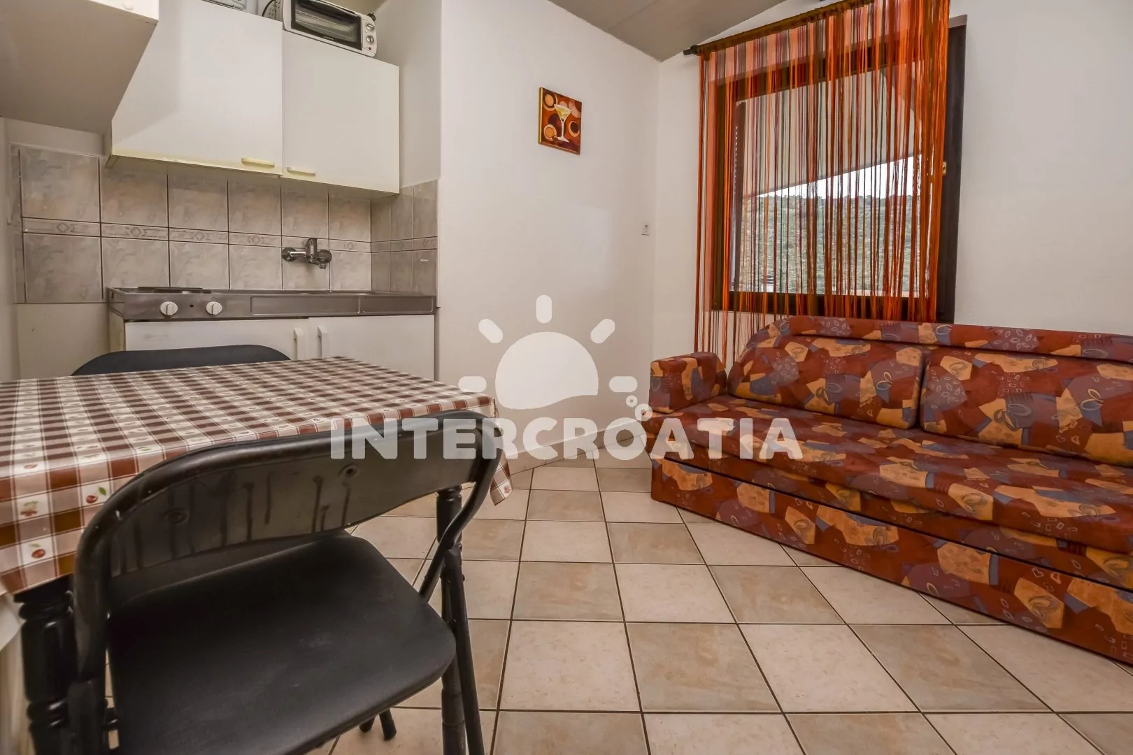 Apartmán (26 m2) typu studio se sdílenou terasou, výhledem na moře a venkovním posezením se nachází v 1. patře domu. Obývací místnost je spojena s kuchyní. Kuchyňská linka je vybavena dvouplotýnkovým…