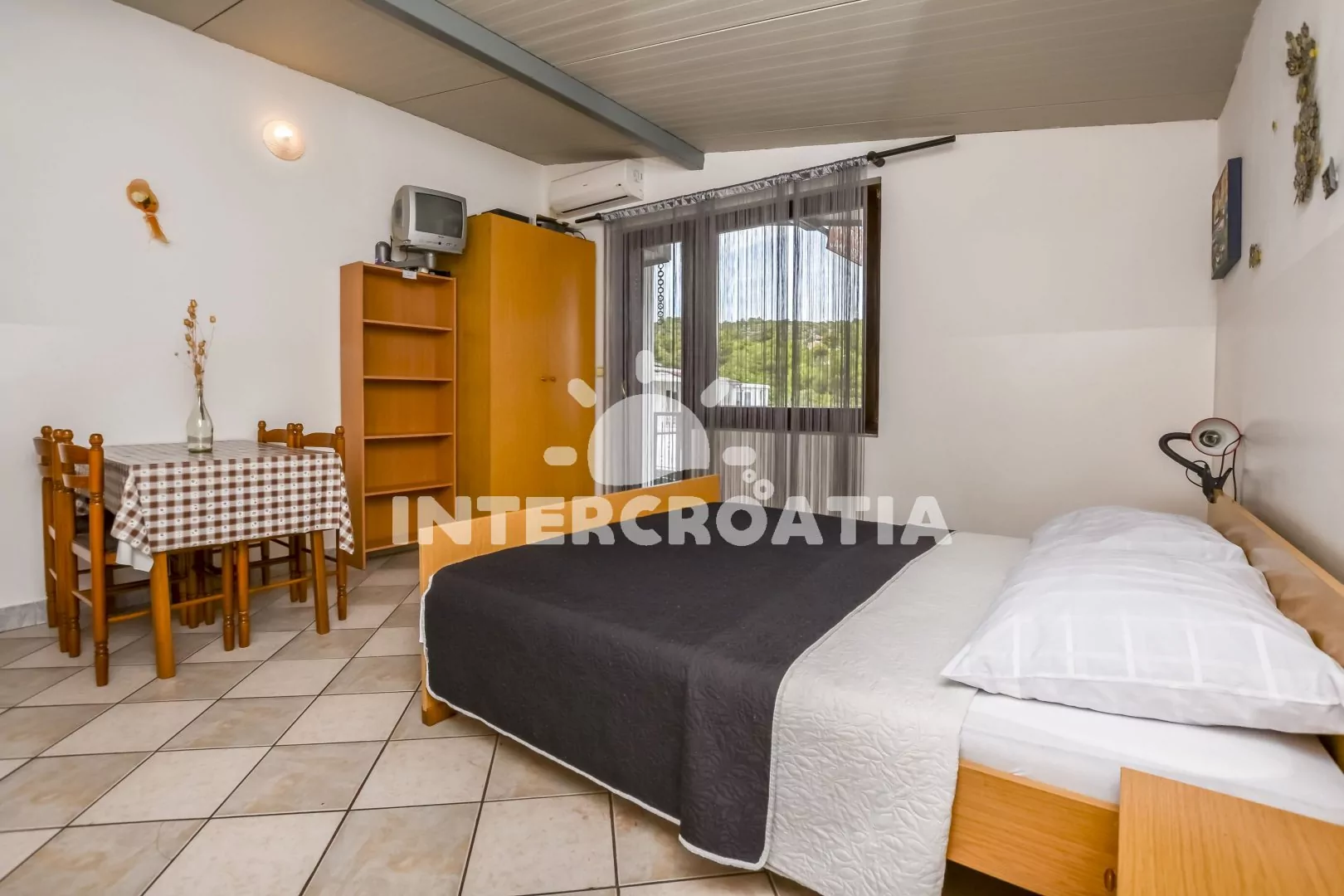 Apartmán (26 m2) typu studio se sdílenou terasou, výhledem na moře a venkovním posezením se nachází v 1. patře domu. Obývací místnost je spojena s kuchyní. Kuchyňská linka je vybavena dvouplotýnkovým vařičem, rychlovarnou konvicí, nádobím a lednicí s mrazákem, na požádání kávovar. Obývací místnost s jídelním stolem, pohovkou, dvoulůžkem, televizí a klimatizací. Koupelna se sprchovým koutem, umyvadlem a wc. Hostům je k dispozici parkování u objektu zdarma.