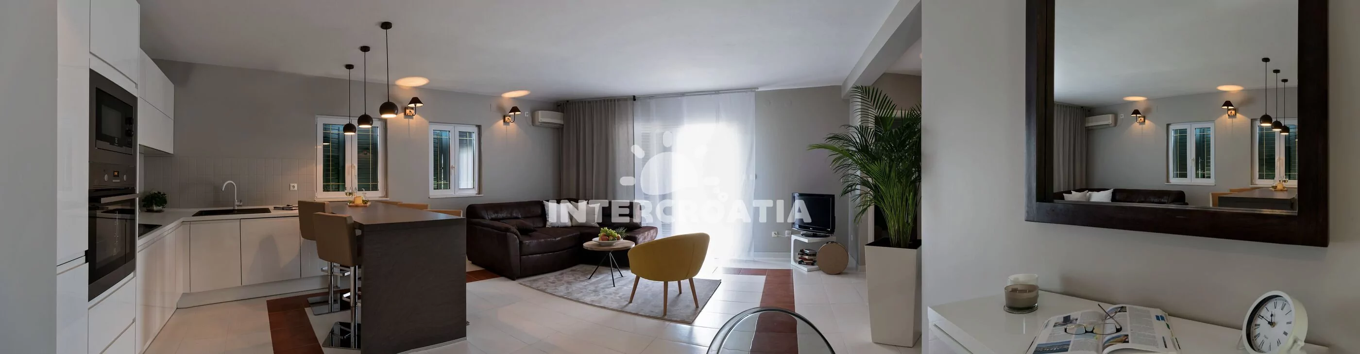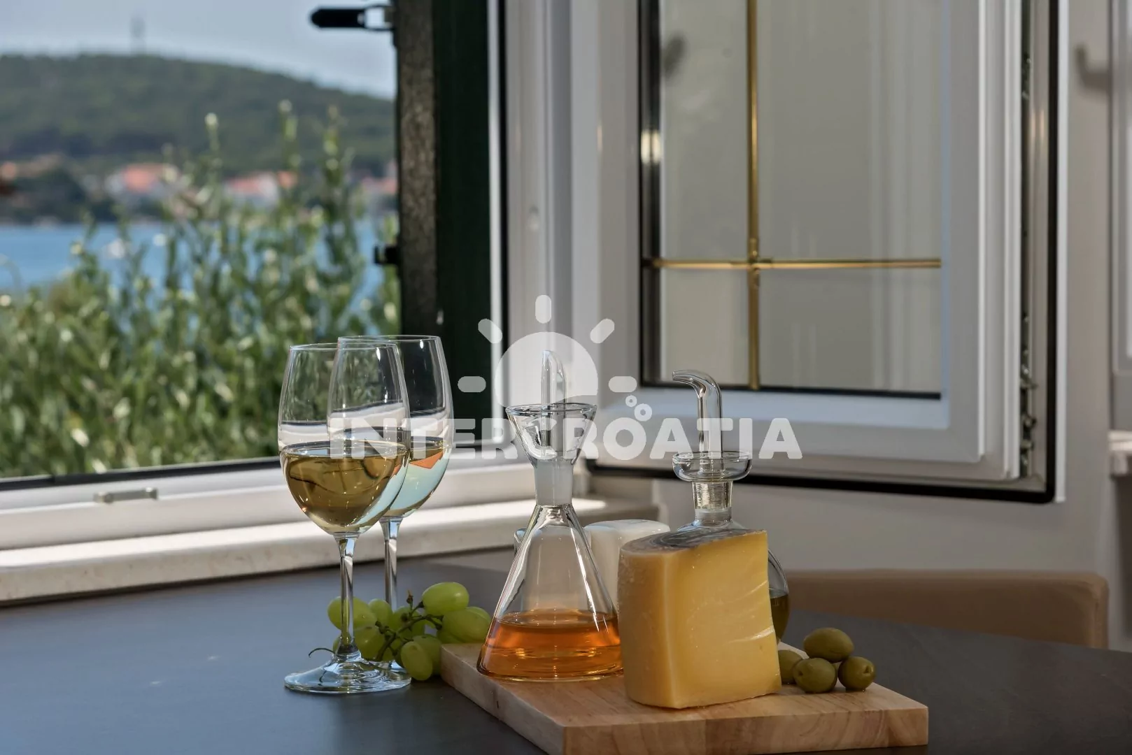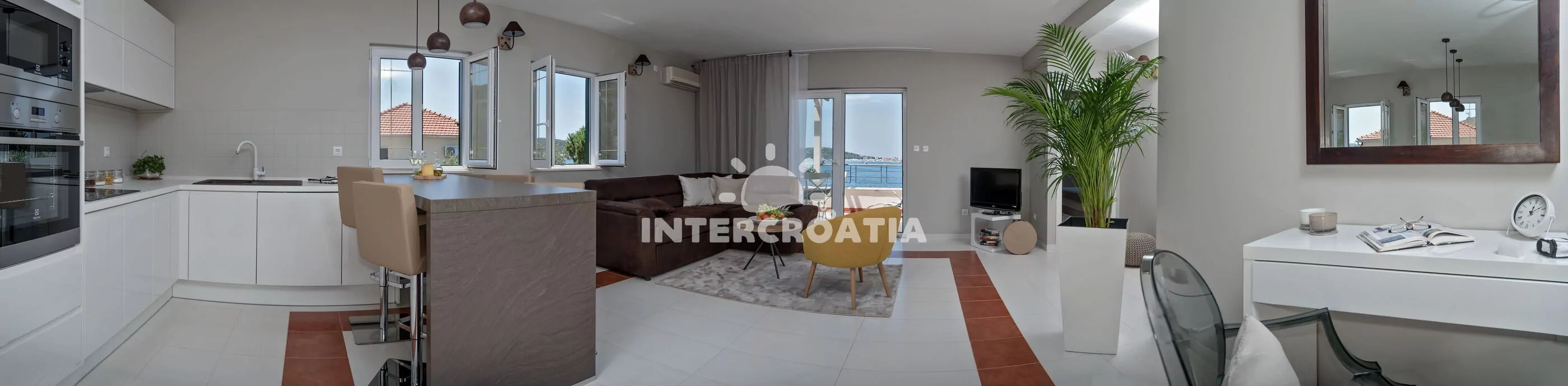 Apartmán (80 m2) s terasou, posezením a výhledem na moře se nachází v 1. patře domu. Apartmán má 2 ložnice a je vhodný pro 4 osoby. Obývací pokoj je spojený s kuchyní. Kuchyňská linka je vybavena varnou deskou, digestoří, vestavěnou troubou, myčkou na nádobí, mikrovlnnou troubou, rychlovarnou konvicí, kávovarem, nádobím a lednicí s mrazákem. Obývací pokoj s jídelním stolem, pohovkou, televizí se satelitním programem, klimatizací a vstupem na terasu. První ložnice s dvoulůžkem. Druhá ložnice se dvěma jednolůžky. Koupelna se sprchovým koutem, umyvadlem, fénem, pračkou a wc. Hostům je k dispozici parkování u objektu zdarma.