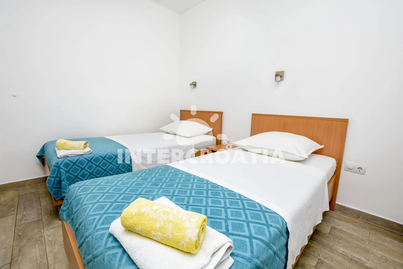 Apartmán (55 m2) s terasou, venkovním posezením, částečným výhledem do dvora a na moře se nachází v přízemí domu. Apartmán má 2 ložnice a je vhodný pro až 5 osob. Obývací pokoj je spojený s kuchyní. Kuchyňská linka je vybavena varnou deskou, digestoří, vestavěnou troubou, rychlovarnou konvicí, nádobím a lednicí s mrazákem. Obývací pokoj s jídelním stolem, pohovkou (rozložitelná na extra lůžko pro 1 osobu), televizí se satelitním programem, klimatizací a vstupem na terasu. První ložnice s jedním dvoulůžkem. Druhá ložnice se dvěma jednolůžky. Koupelna se sprchovým koutem, umyvadlem, fénem, pračkou a wc. Hostům je k dispozici parkování u objektu zdarma.