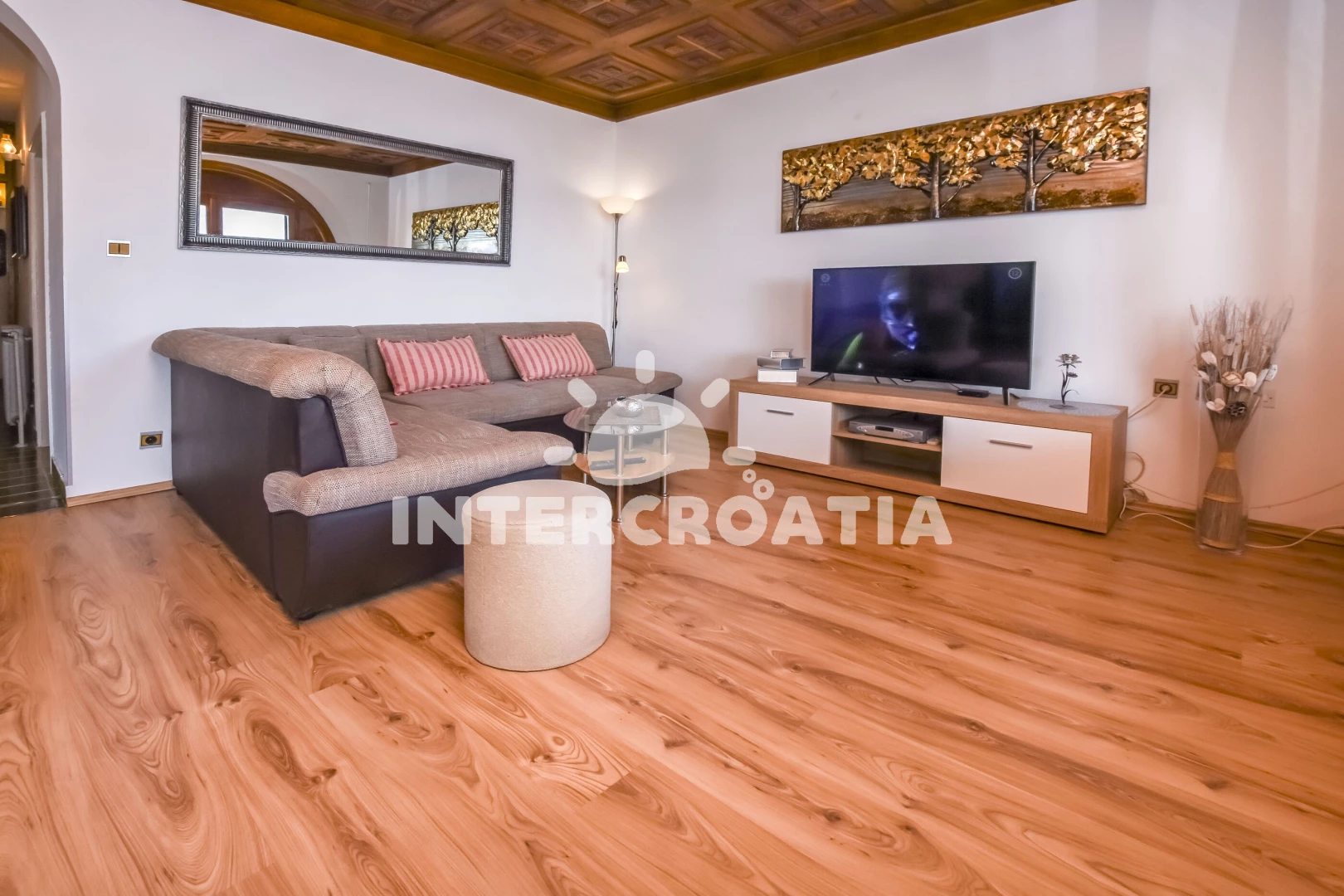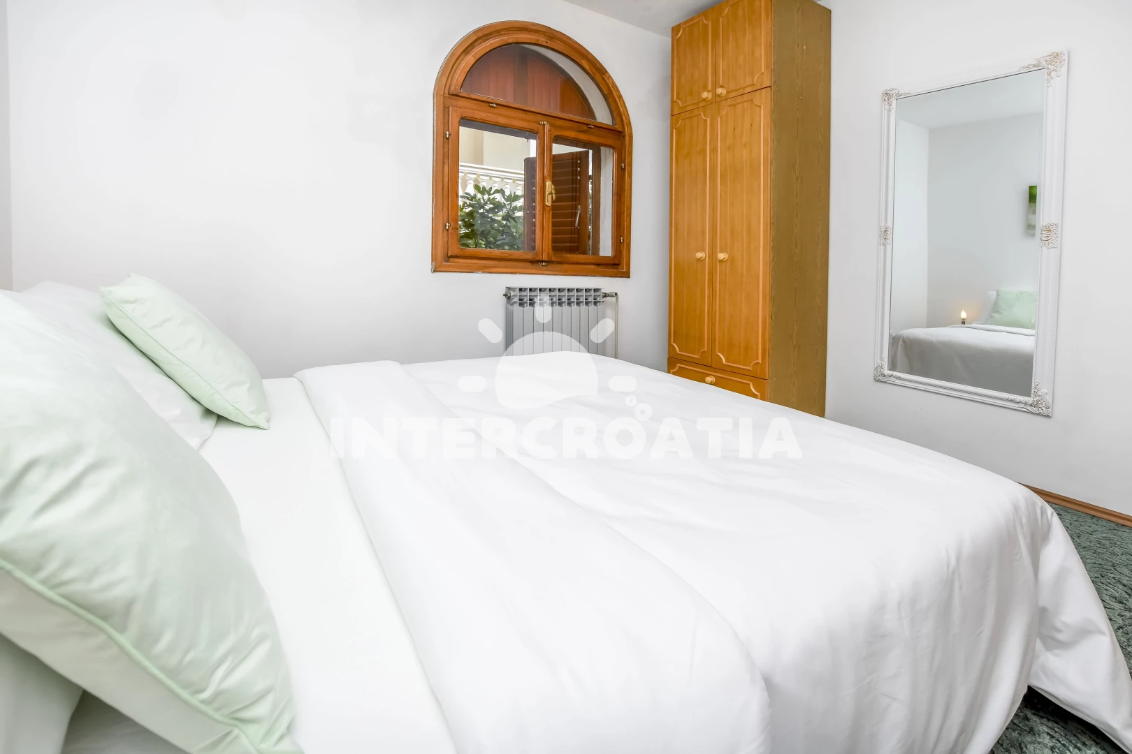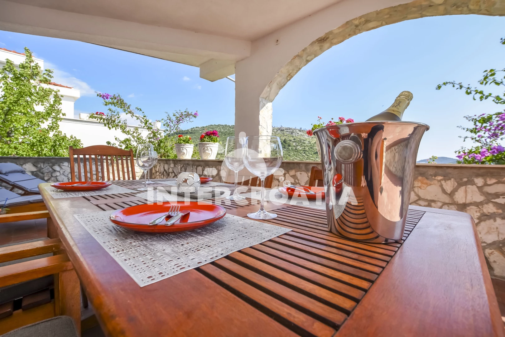 Apartmán (80 m2) s terasou, posezením a výhledem na moře se nachází v 1. patře domu. Apartmán má 2 ložnice, 2 koupelny a je vhodný pro až 4 osoby. Obývací pokoj je spojený s kuchyní. Kuchyňská linka je vybavena varnou deskou, digestoří, vestavěnou troubou, myčkou na nádobí, rychlovarnou konvicí, kávovarem, mikrovlnnou troubou, nádobím a lednicí s mrazákem. Obývací pokoj s jídelním stolem, pohovkou, televizí, klimatizací a vstupem na terasu. První ložnice s dvoulůžkem. Druhá ložnice s dvoulůžkem. Dvě koupelny se sprchovým koutem, umyvadlem a wc. Hostům je k dispozici parkování u objektu zdarma.
