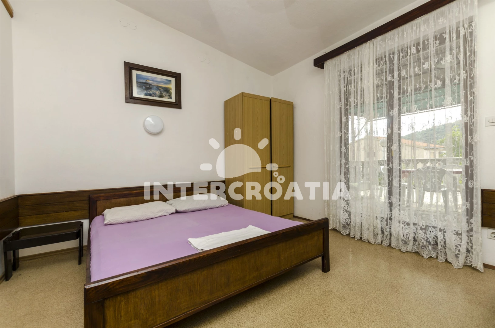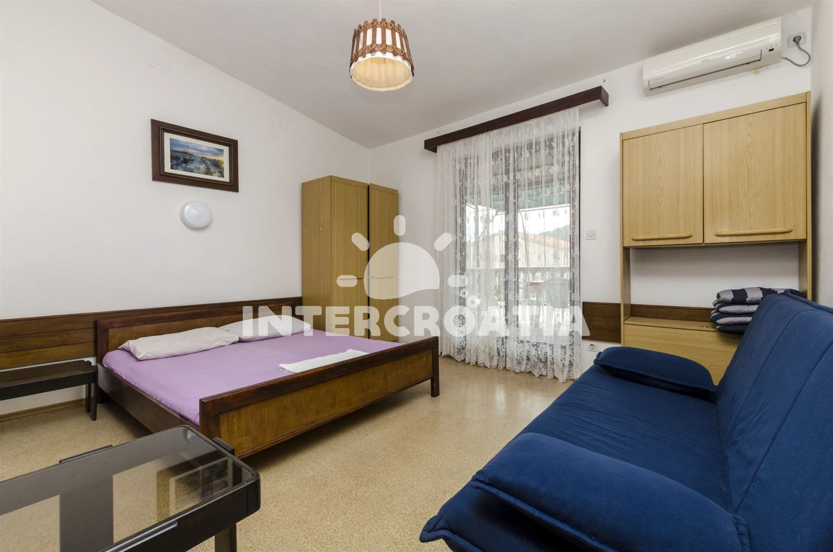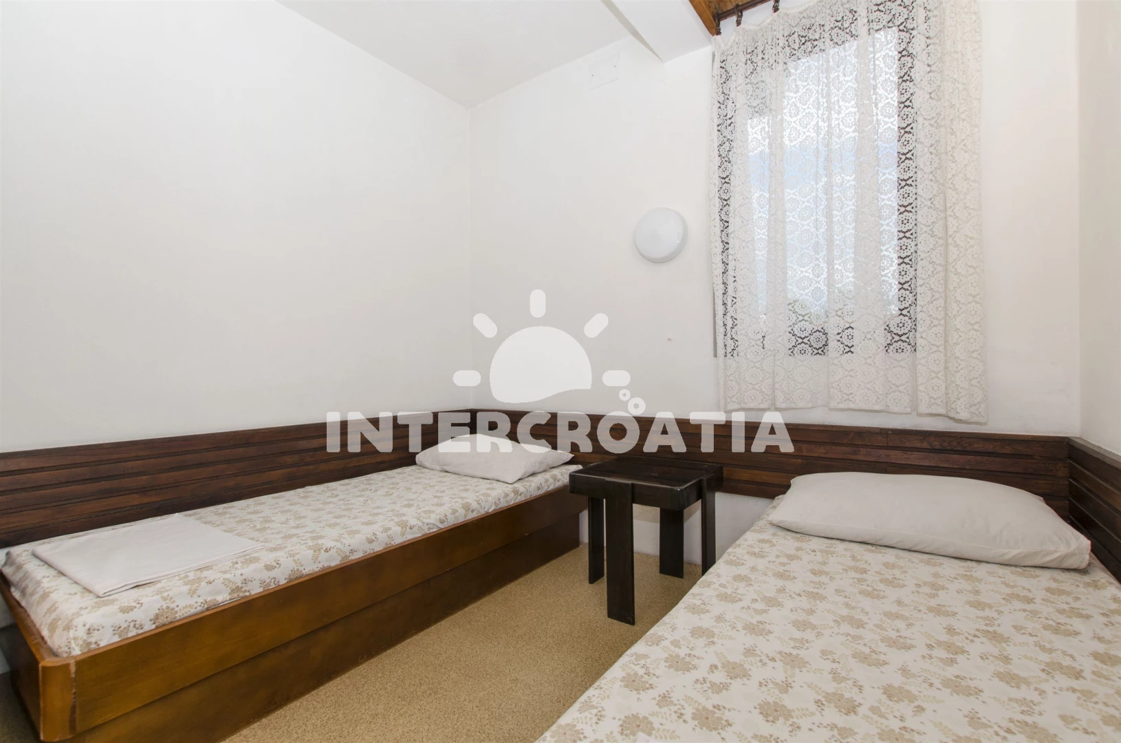 Apartmán (60 m2) s terasou a venkovním posezením se nachází ve 2. patře domu. Apartmán má 2 ložnice a je vhodný pro až 4 osoby. Kuchyň s jídelním stolem a kuchyňskou linkou. Kuchyňská linka je vybavena sporákem s troubou, rychlovarnou konvicí, mikrovlnnou troubou, toustovačem, nádobím a lednicí s mrazákem. První ložnice s dvoulůžkem, pohovkou, televizí se satelitním programem, klimatizací a vstupem na terasu. Druhá ložnice se dvěma jednolůžky. Koupelna se sprchovým koutem, umyvadlem a wc. Hostům je k dispozici parkování u objektu zdarma.