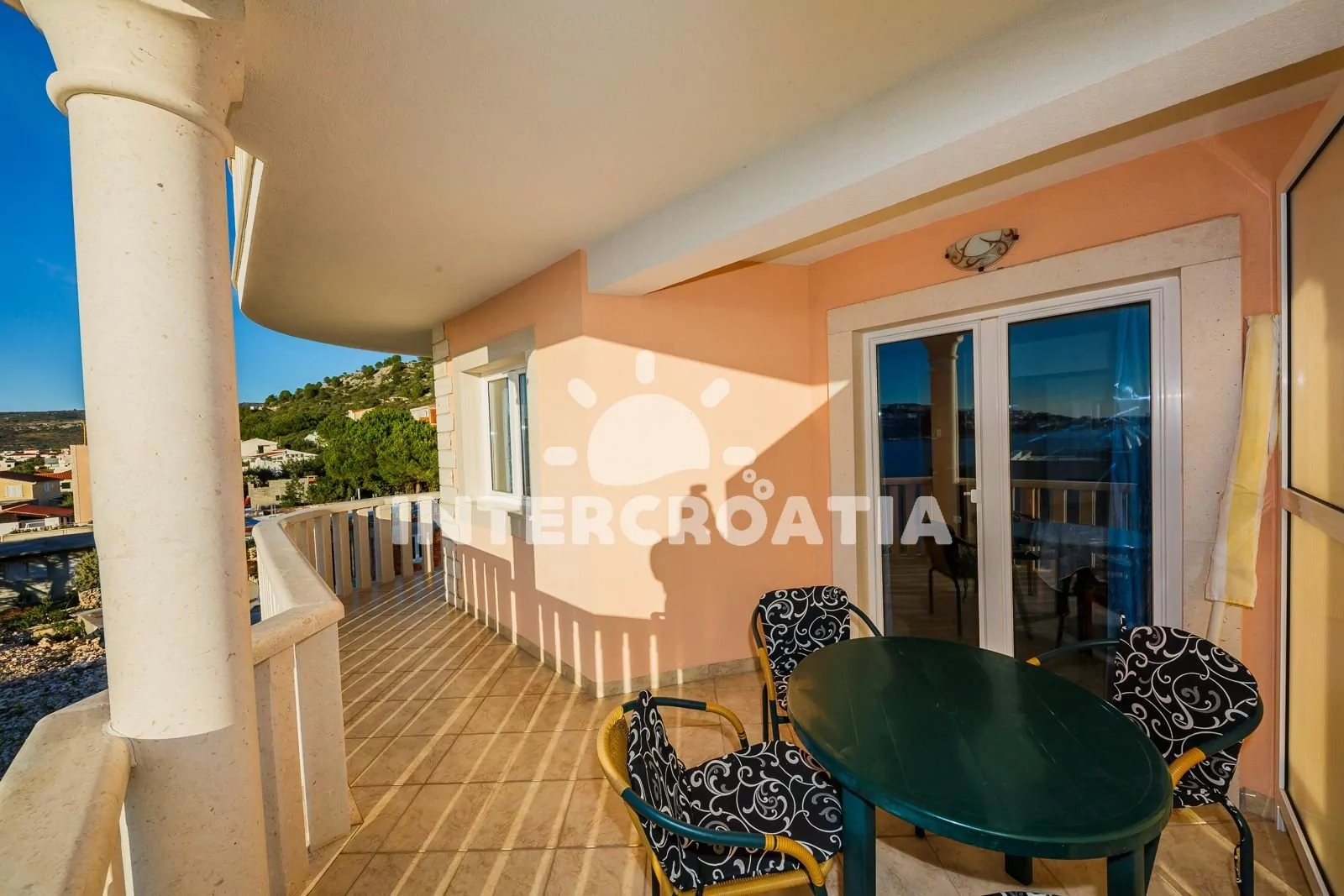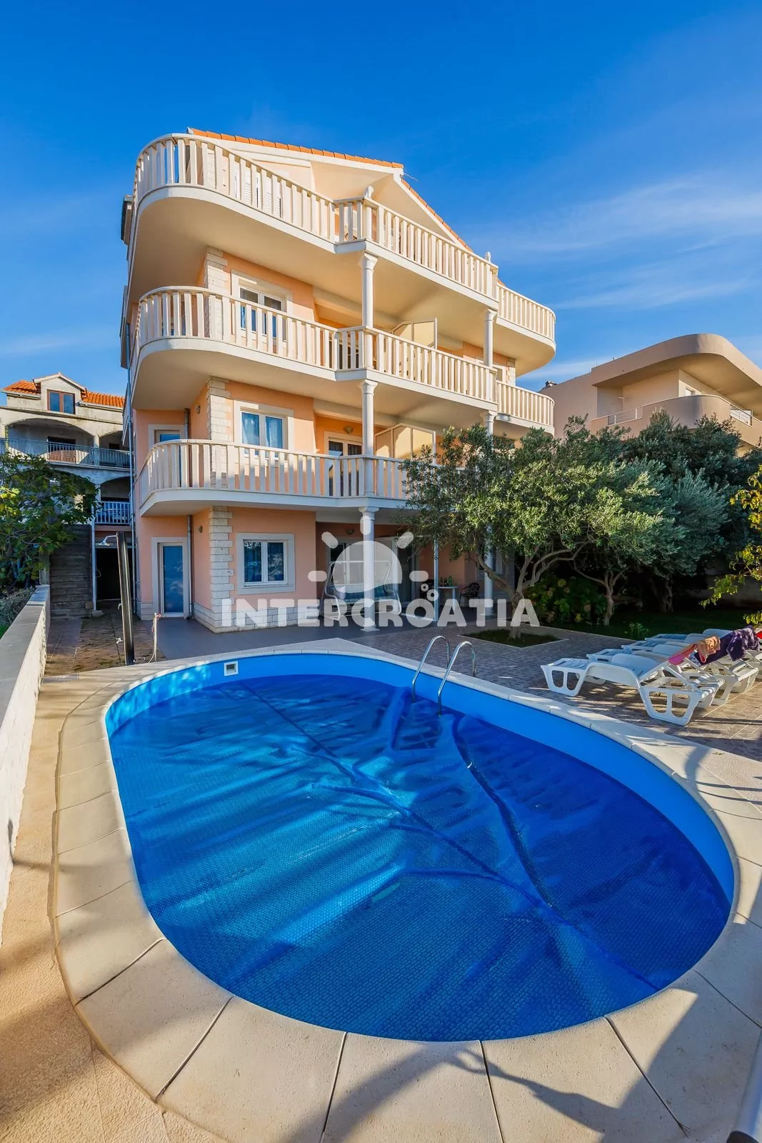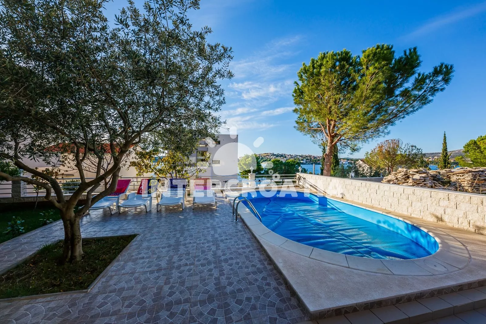 Volně stojící apartmánová vila s terasou, posezením, zapuštěným bazénem a překrásným výhledem na moře.