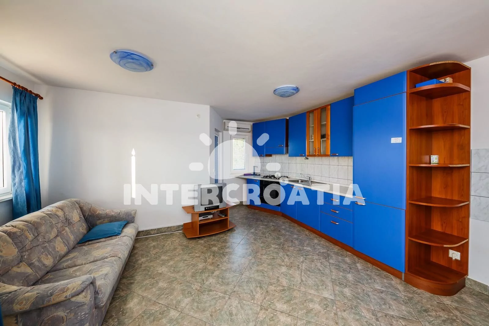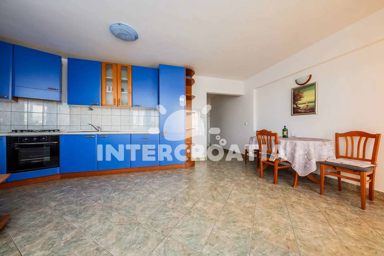 Příjemně vybavený dvoupokojový apartmán s terasou, ze které je výhled na moře a přilehlou lagunu, nacházející se v 1. patře domu. Vstup, obývací místnost spojená s kuchyňským koutem. Kuchyňská linka…