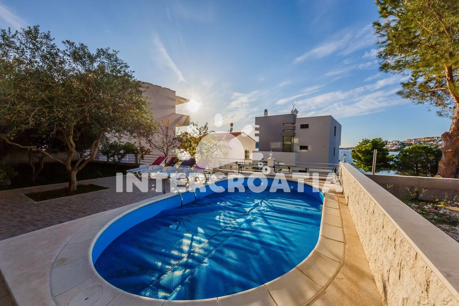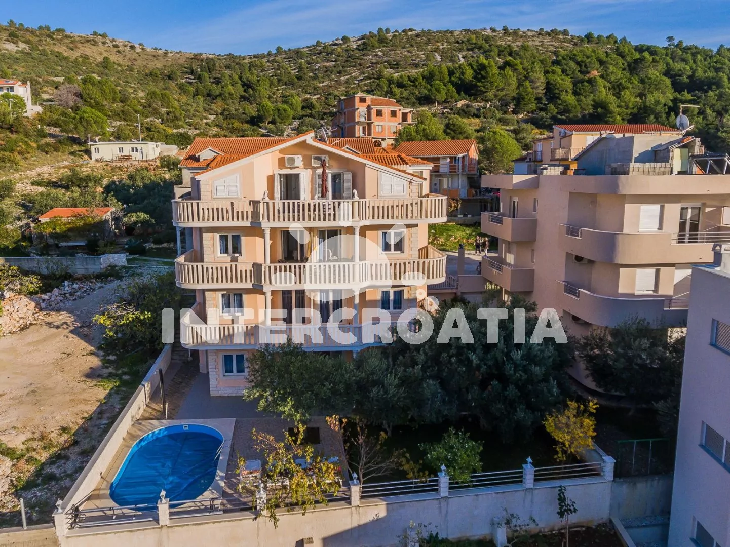 Třípodlažní apartmánová vila s terasou, posezením, zapuštěným bazénem a překrásným výhledem na moře.