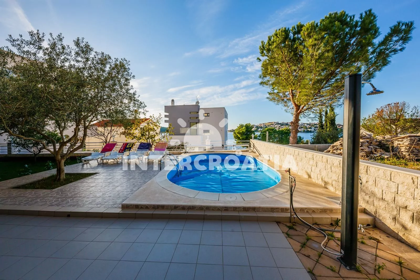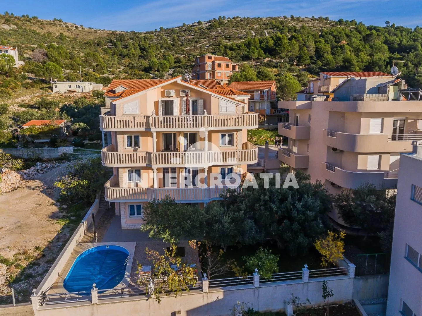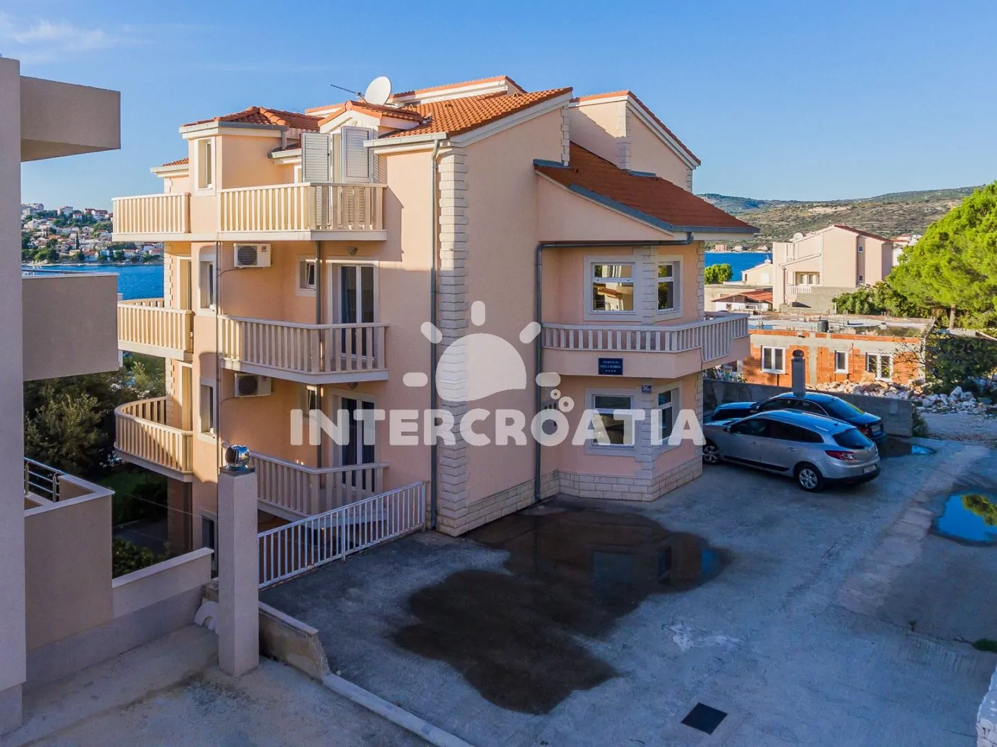 Třípatrová apartmánová vila s terasou, posezením, zapuštěným bazénem a překrásným výhledem na moře.