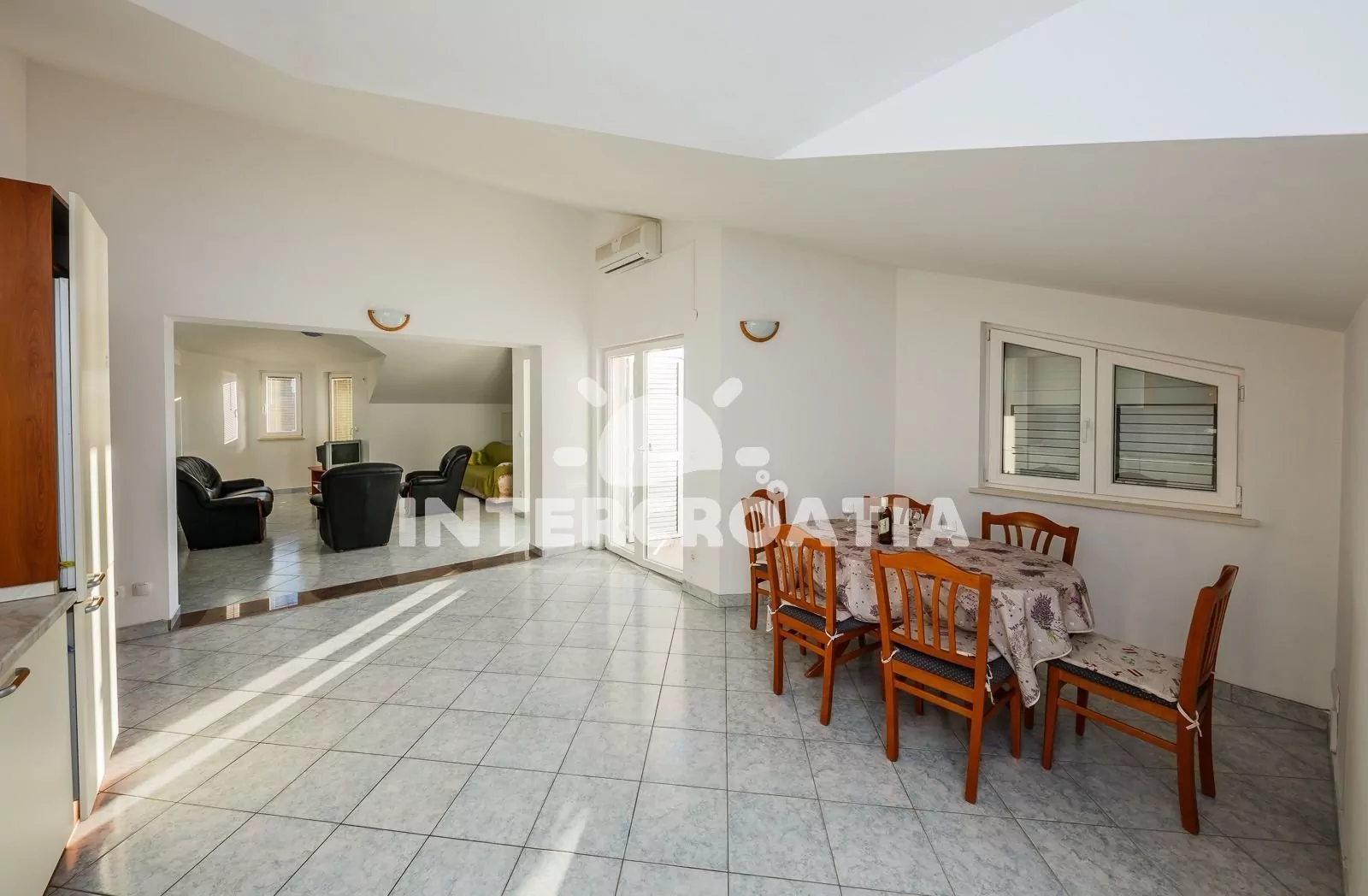 Příjemně vybavený dvoupokojový apartmán s terasou, ze které je výhled na moře a přilehlou lagunu, nacházející se v 3. patře domu. Vstup, obývací místnost spojená s kuchyňským koutem. Kuchyňská linka…