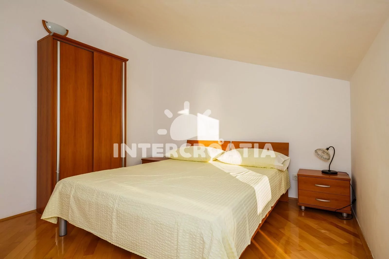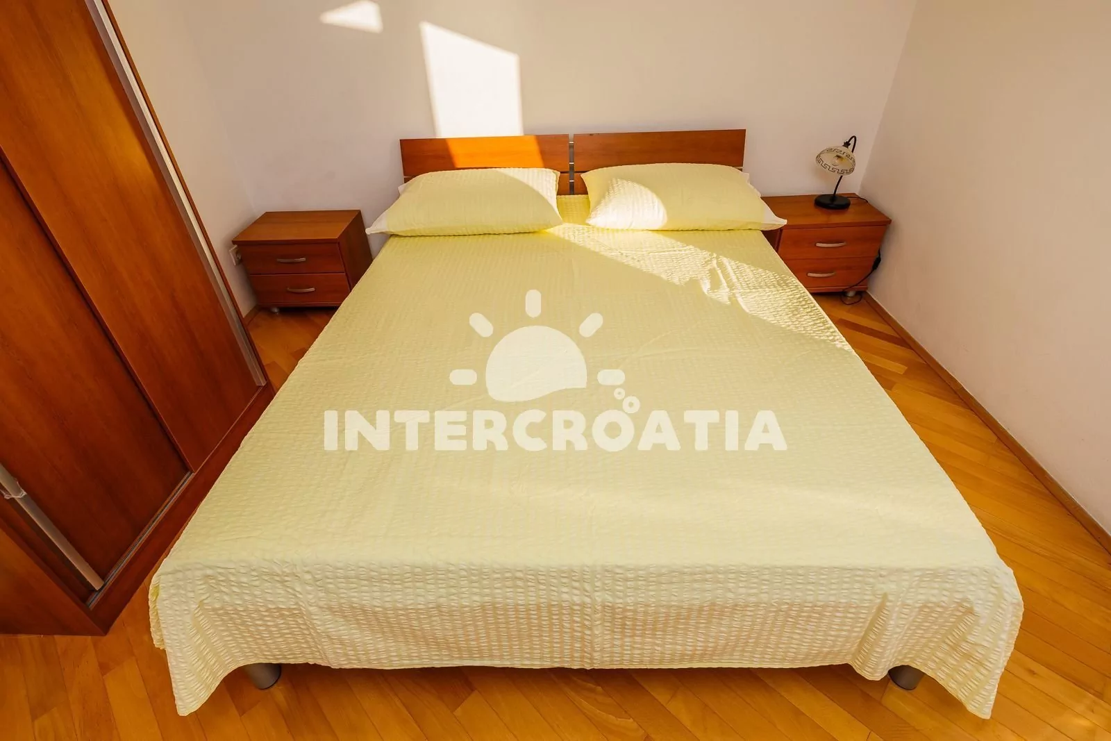 Příjemně vybavený dvoupokojový apartmán s terasou, ze které je výhled na moře a přilehlou lagunu, nacházející se v 3. patře domu. Vstup, obývací místnost spojená s kuchyňským koutem. Kuchyňská linka s varnou deskou, troubou, kávovarem, rychlovarnou konvicí, lednicí a nádobím. Obývací pokoj s jídelním stolem pro 4 osoby, pohovkou (rozložitelná na extra lůžko pro 2 osoby) a televizí se satelitem. Z obývacího pokoje je vstup na terasu. Dvě ložnice, každá s dvoulůžkem. Koupelna se sprchovým koutem, umyvadlem a wc. Hosté mají k dispozici společný zapuštěný bazén a gril. Parkování u objektu.