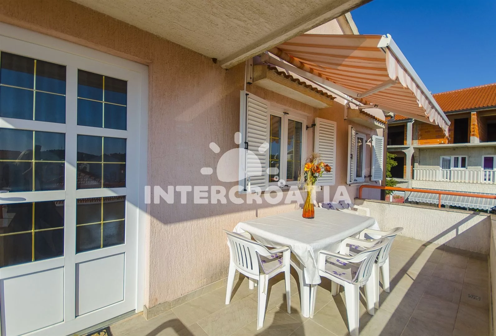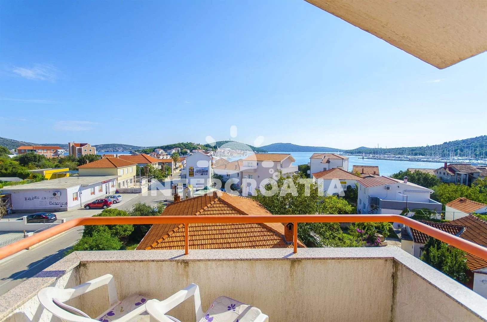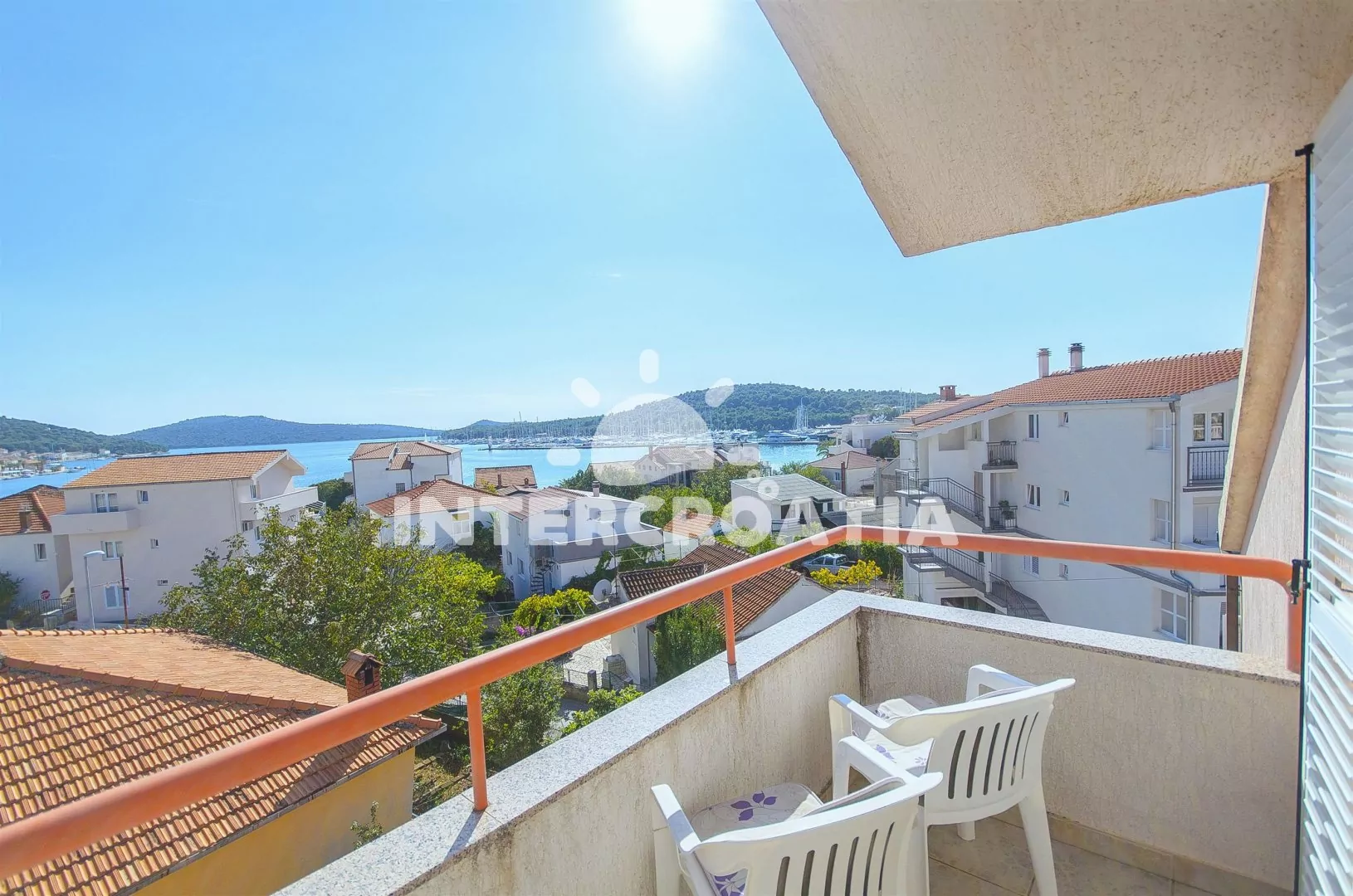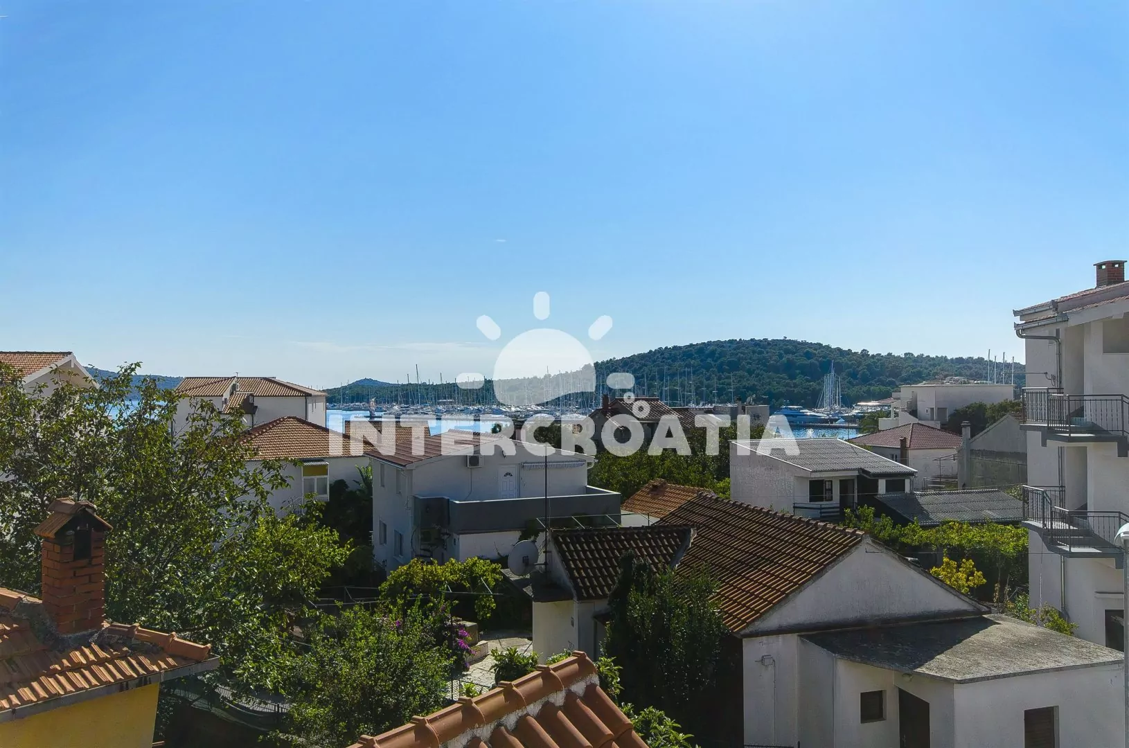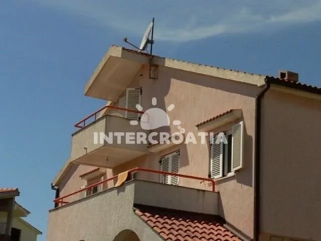 Dvoupatrový apartmánový dům s terasou s posezením, výhledem na moře a marinu, poloha blízko pláže i centra obce.