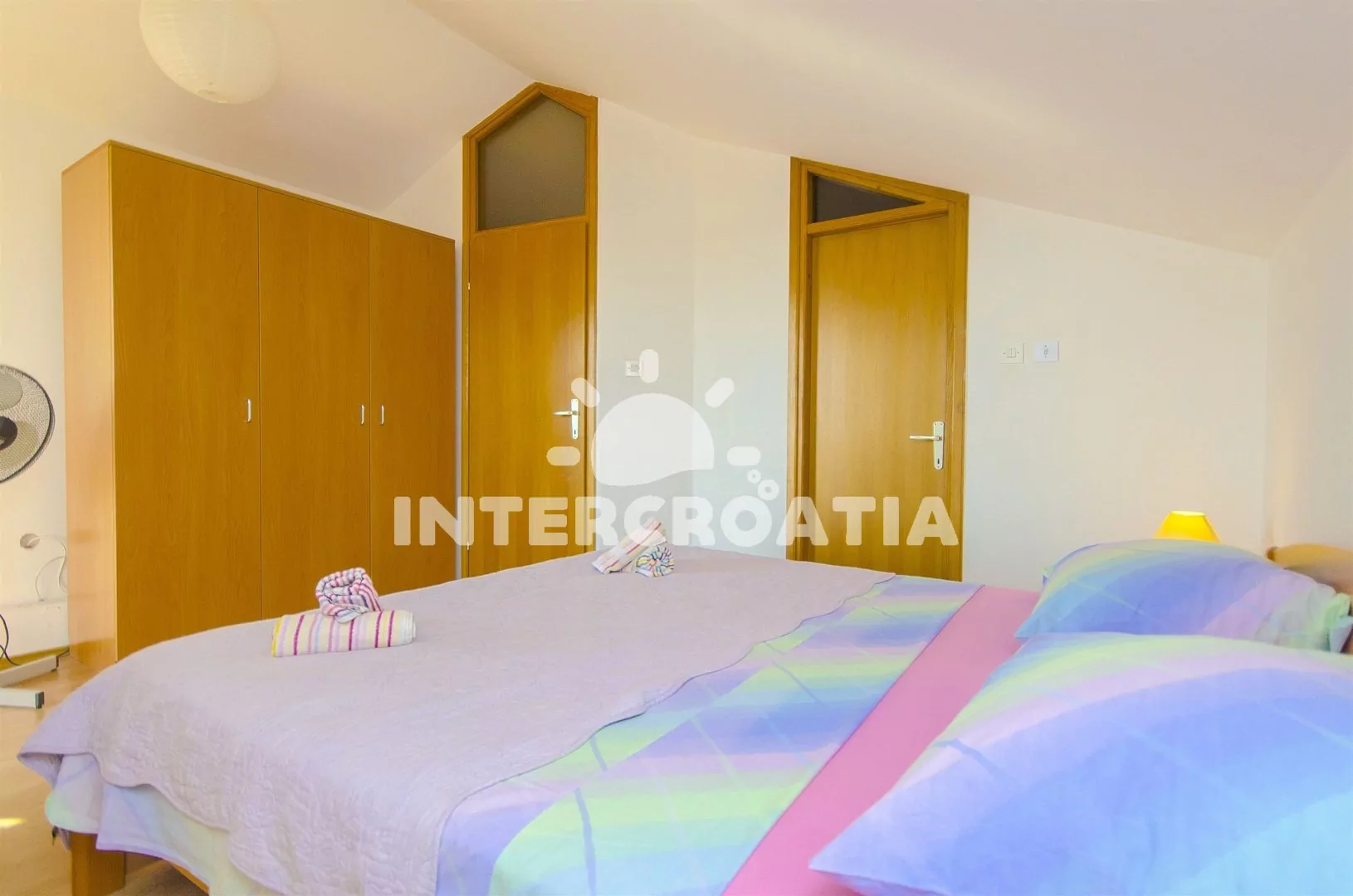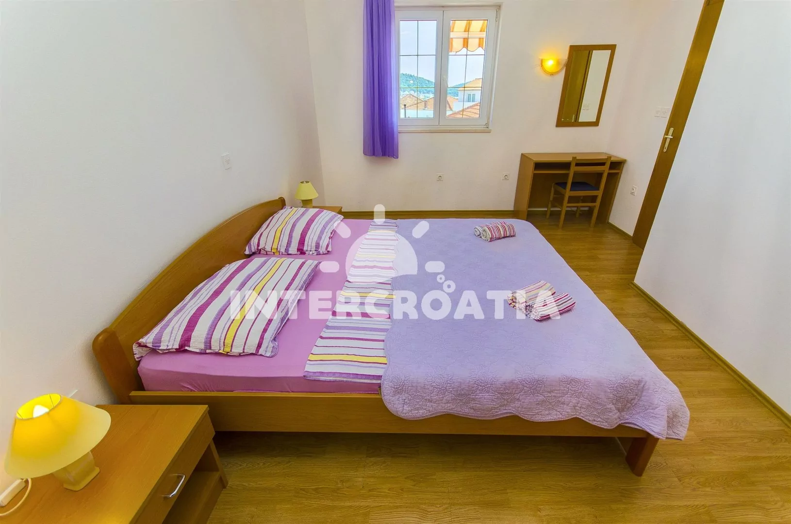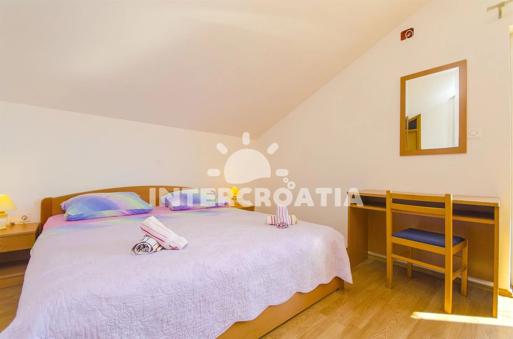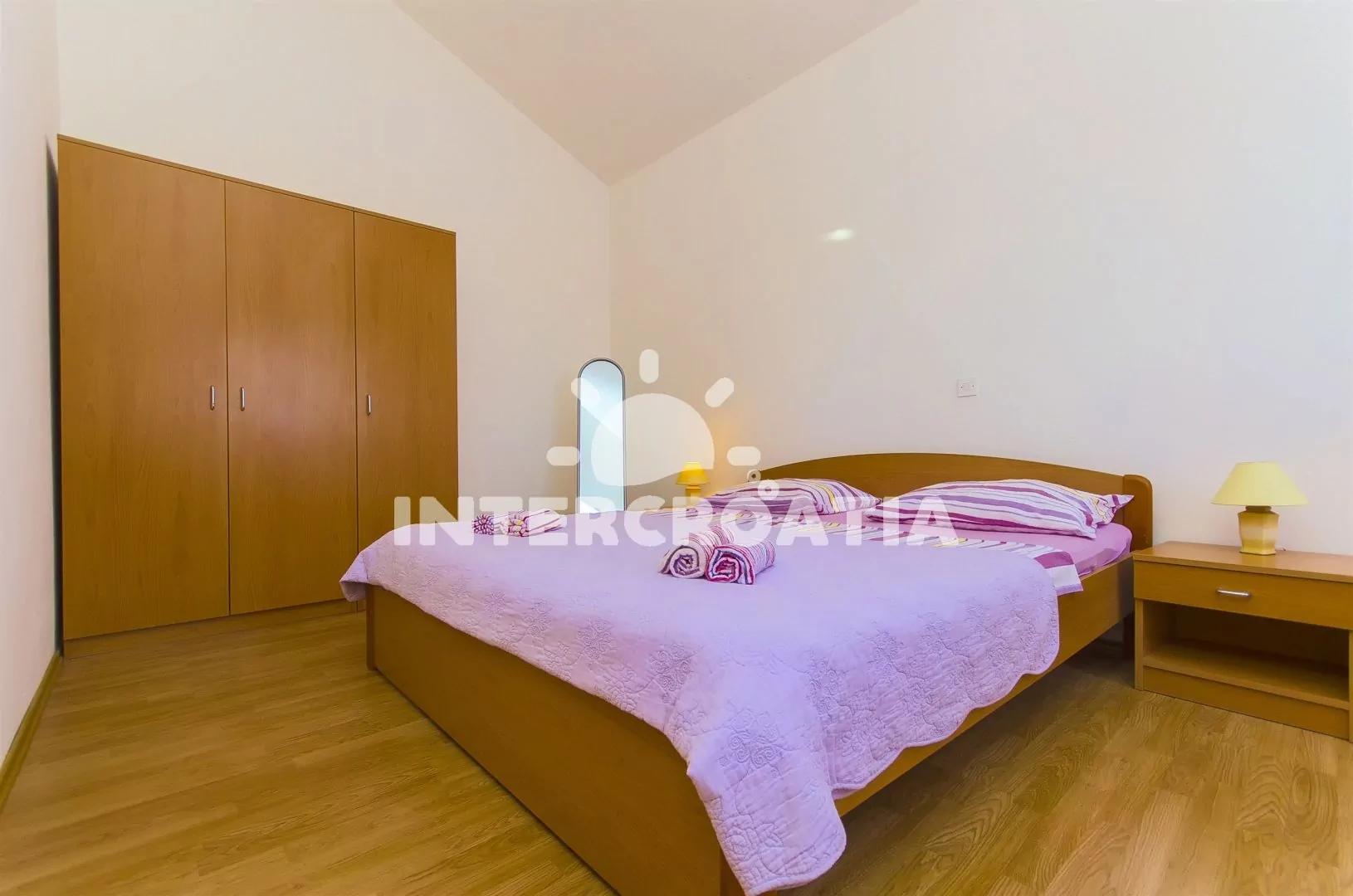 Prostorný a pohodlně zařízený apartmán s dvěma koupelnami (masážní vana) a terasou s výhledem na moře, nacházející se v 2. patře domu. Vstup, obývací místnost spojená s kuchyní. Kuchyňská linka se sklokeramickou varnou deskou, troubou, lednicí s mrazákem, nádobím, kávovarem a myčkou na nádobí. V obývacím pokoji jídelní stůl pro 6 osob, sedací souprava (rozložitelná na extra lůžko pro 2 osoby) a LCD televize se satelitem. V podkroví dvě ložnice, každá s dvoulůžkem. První koupelna s masážní vanou, umyvadlem, wc a pračkou. Druhá koupelná se sprchovým koutem, umyvadlem a wc. Třetí samostatné wc. Hosté mají k dispozici terasu s posezením a balkon. Parkování u objektu.