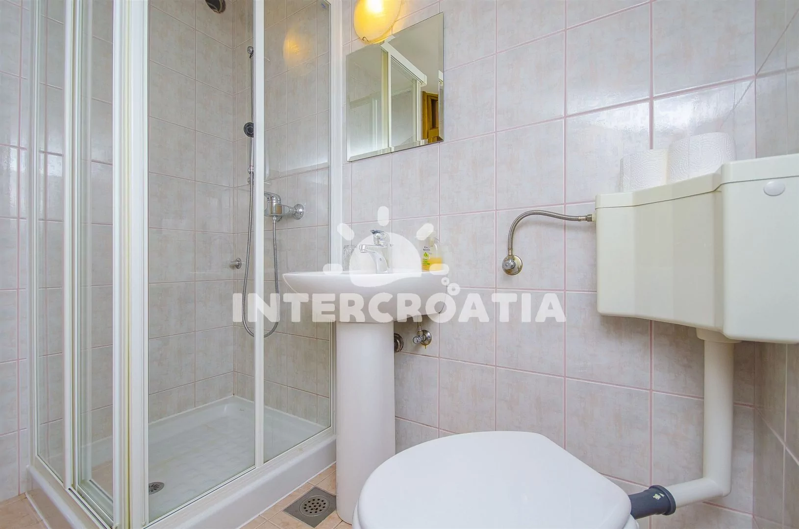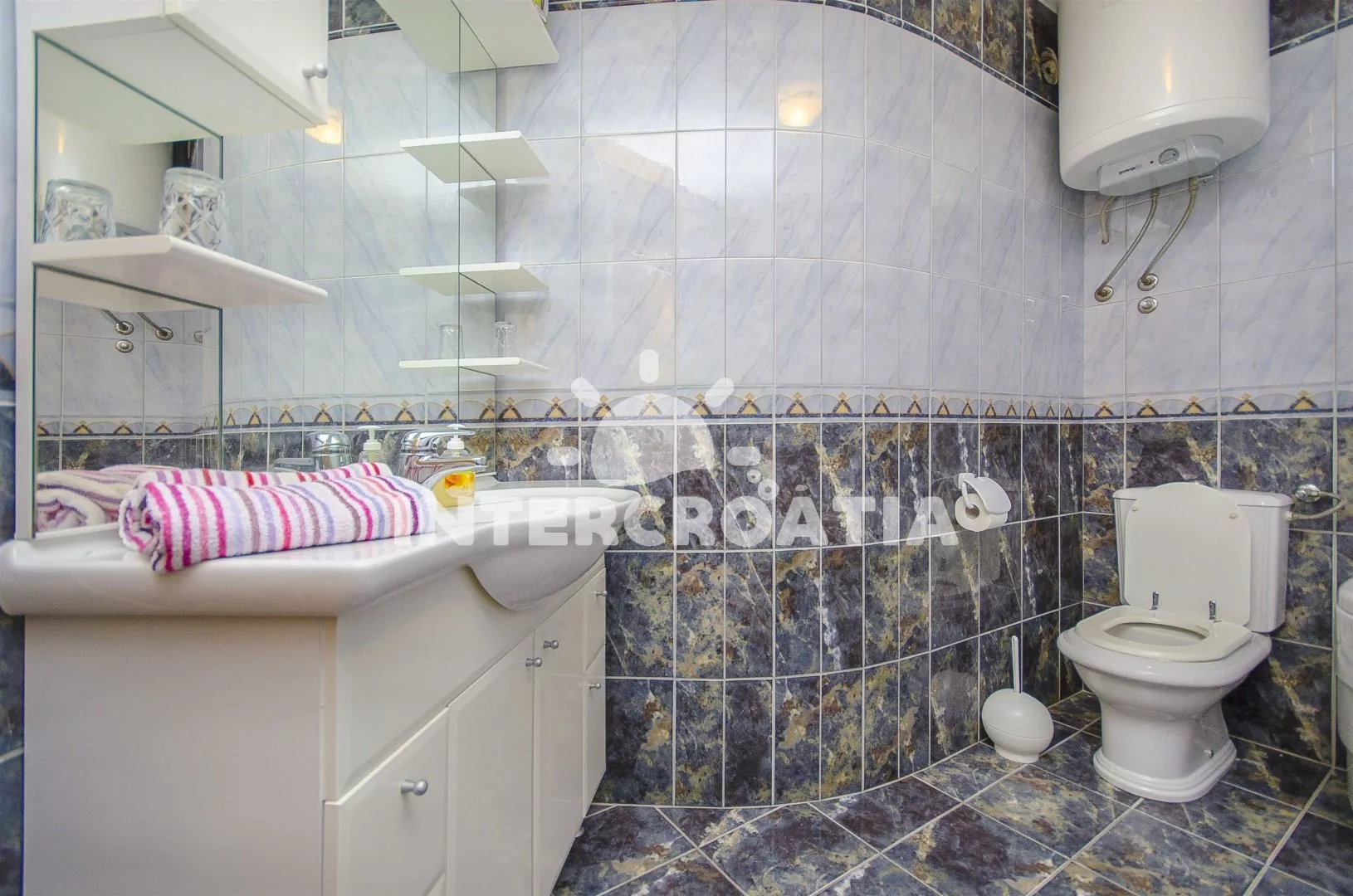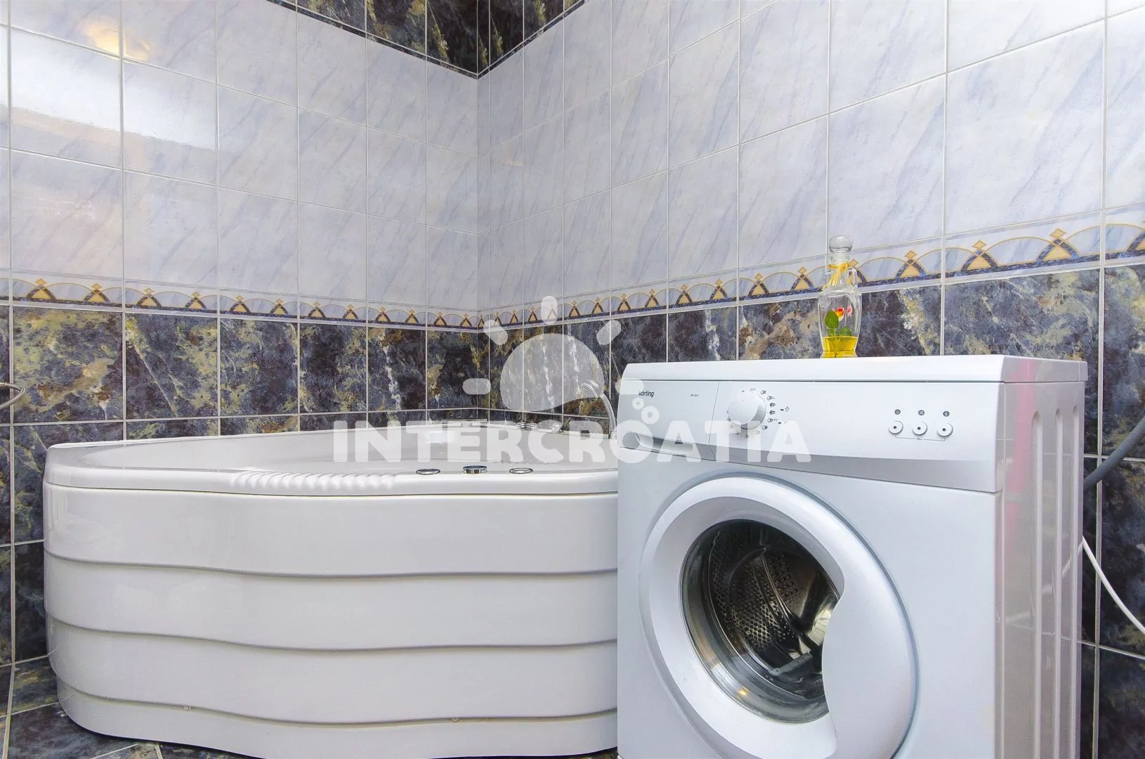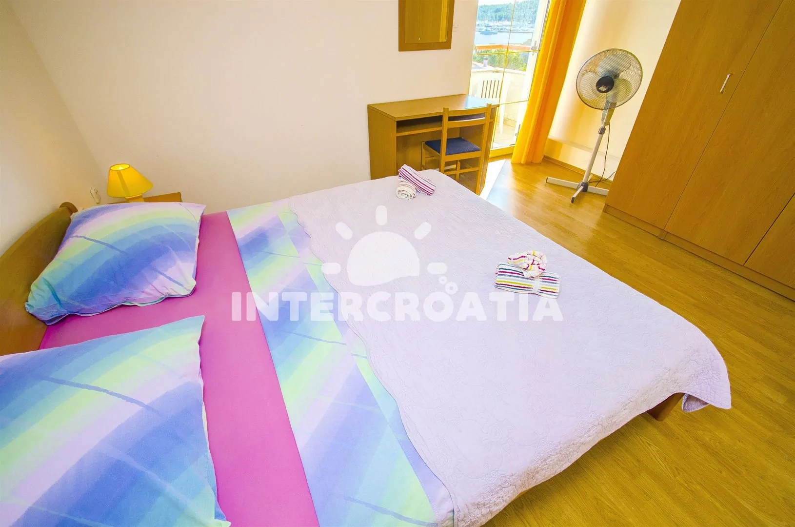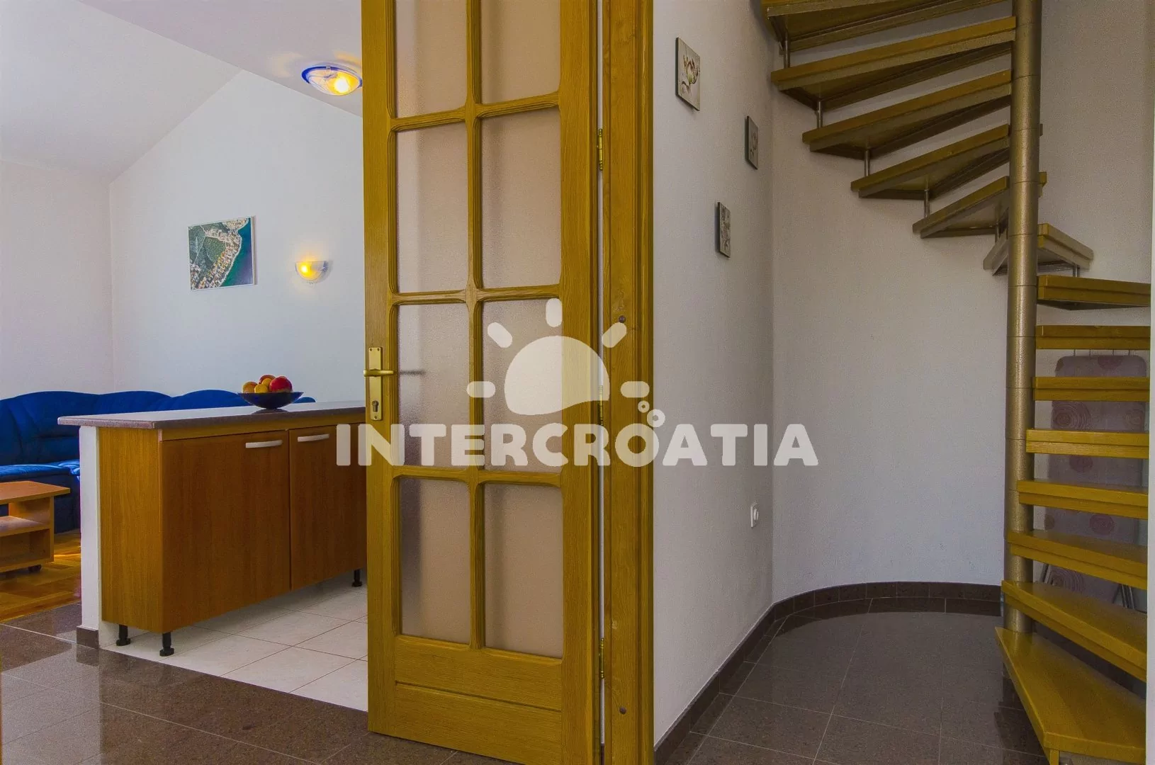 Prostorný a pohodlně zařízený apartmán s dvěma koupelnami (masážní vana) a terasou s výhledem na moře, nacházející se v 2. patře domu. Vstup, obývací místnost spojená s kuchyní. Kuchyňská linka se sklokeramickou varnou deskou, troubou, lednicí s mrazákem, nádobím, kávovarem a myčkou na nádobí. V obývacím pokoji jídelní stůl pro 6 osob, sedací souprava (rozložitelná na extra lůžko pro 2 osoby) a LCD televize se satelitem. V podkroví dvě ložnice, každá s dvoulůžkem. První koupelna s masážní vanou, umyvadlem, wc a pračkou. Druhá koupelná se sprchovým koutem, umyvadlem a wc. Třetí samostatné wc. Hosté mají k dispozici terasu s posezením a balkon. Parkování u objektu.