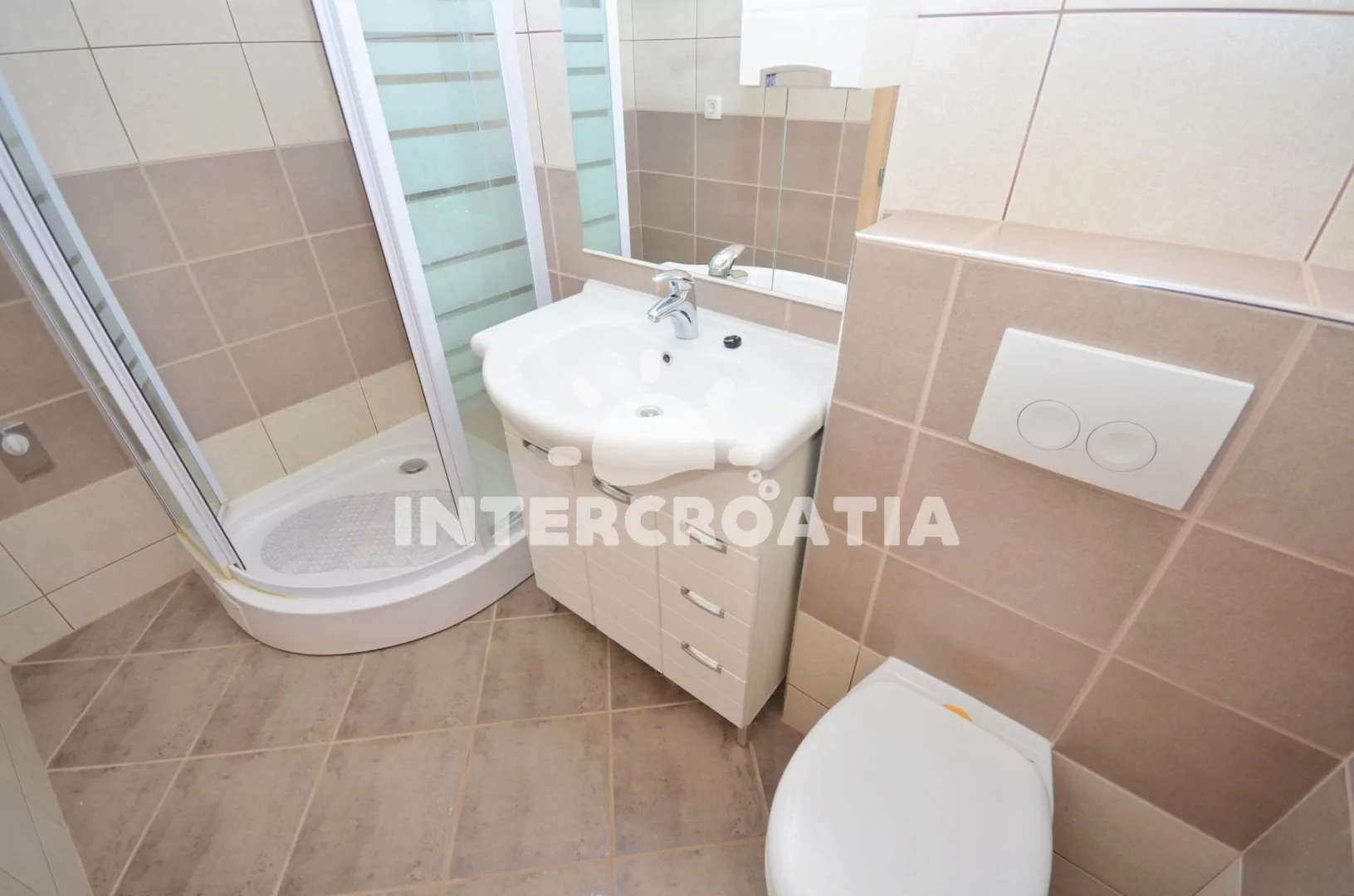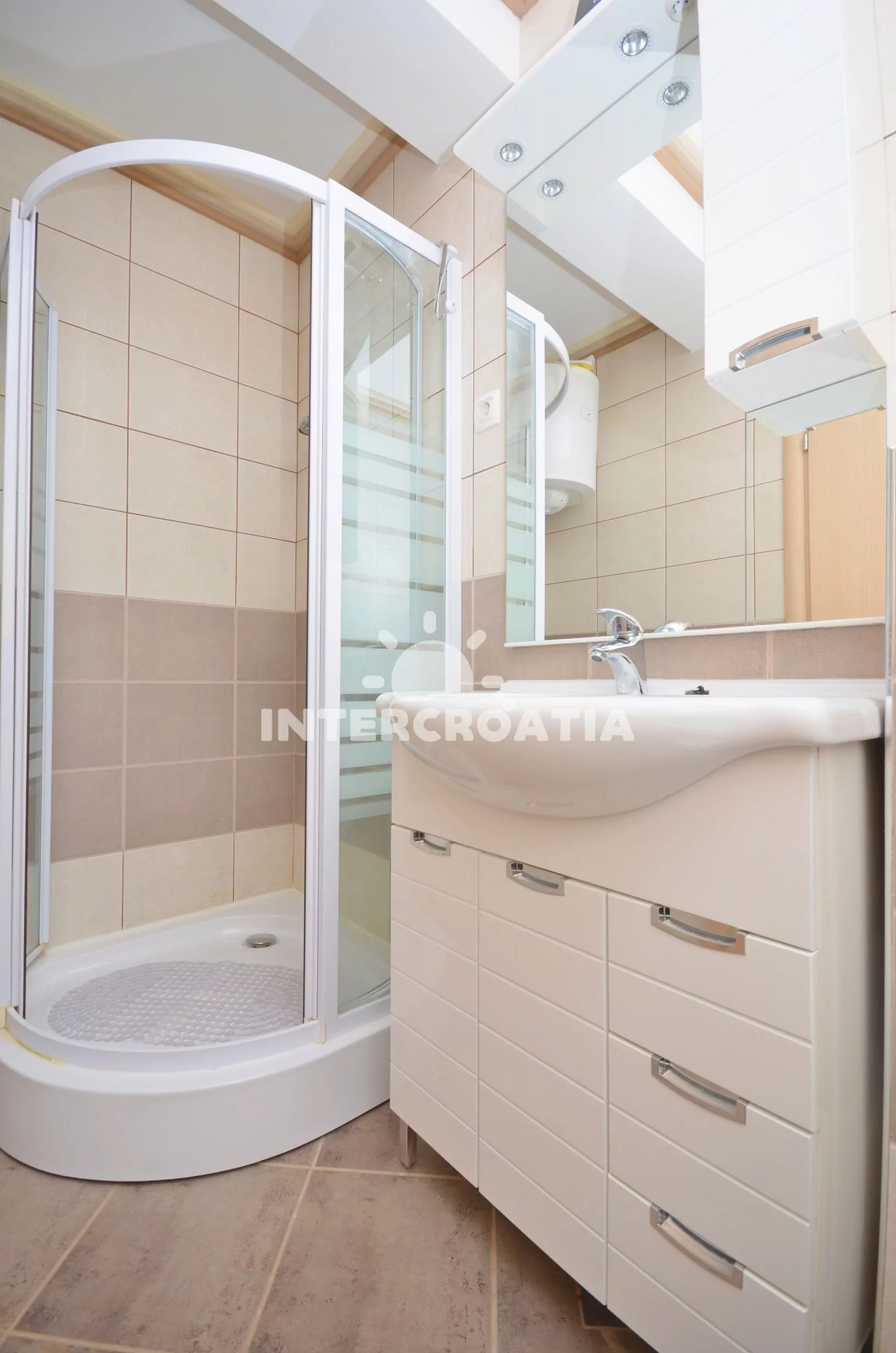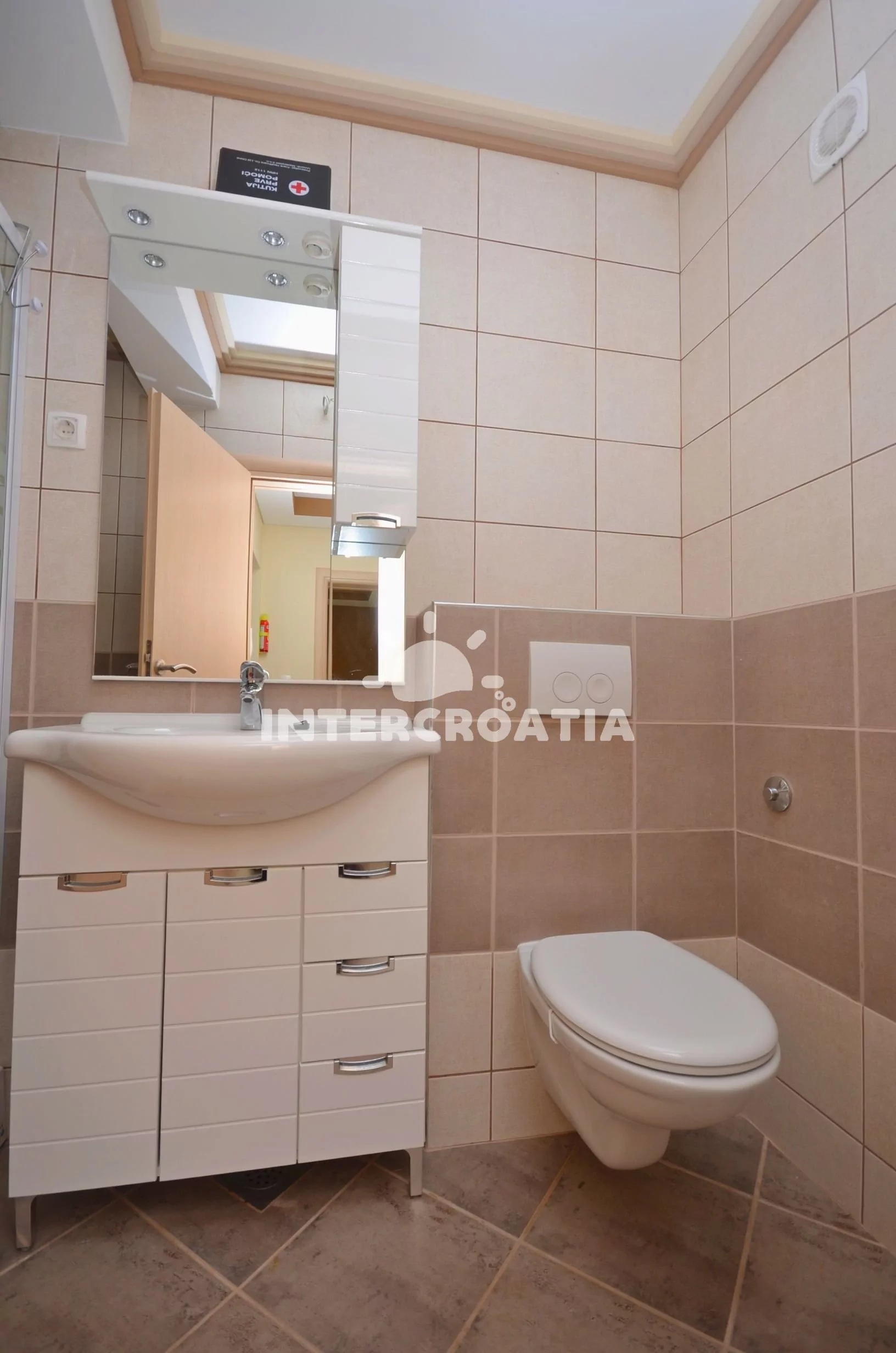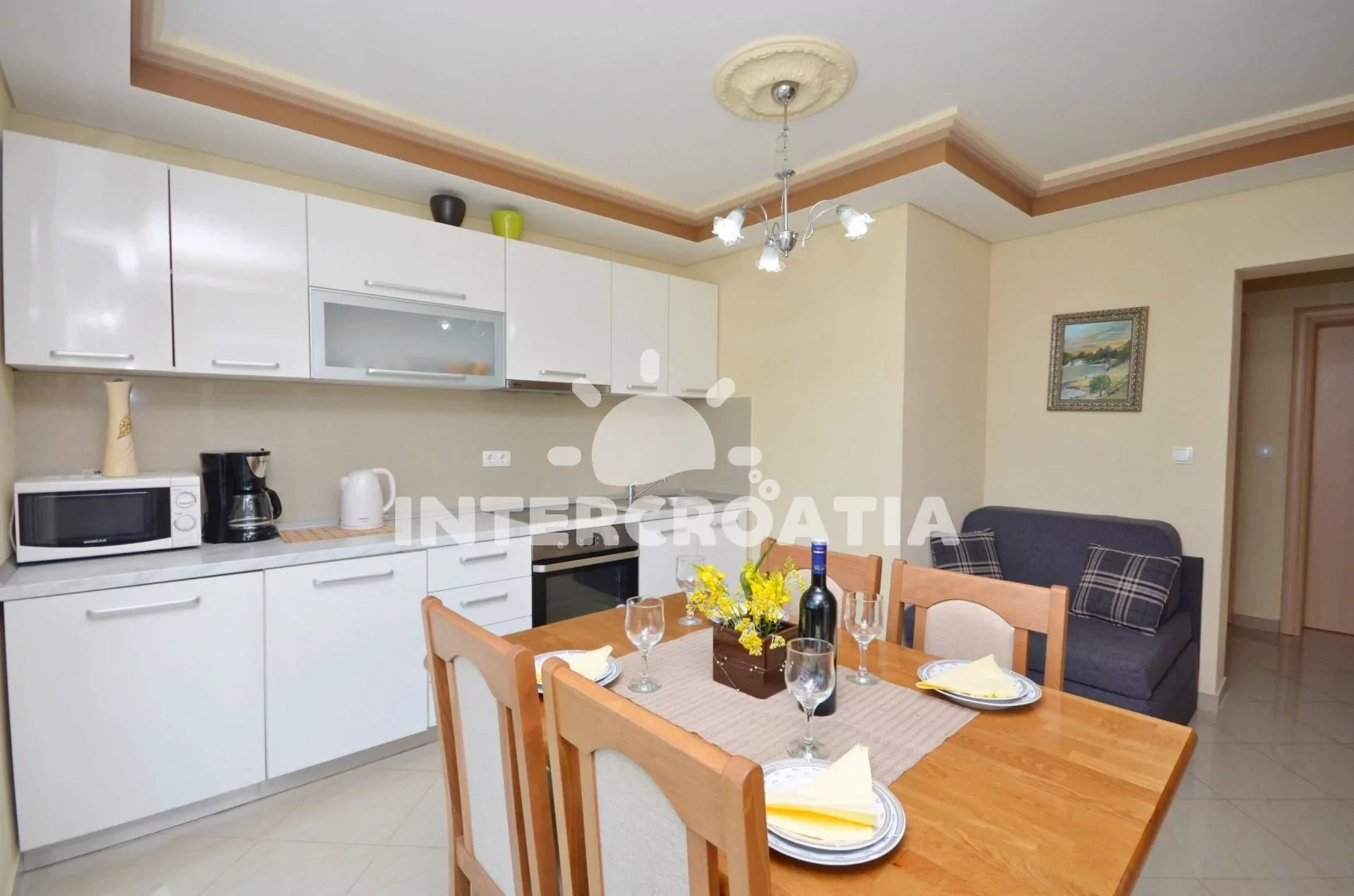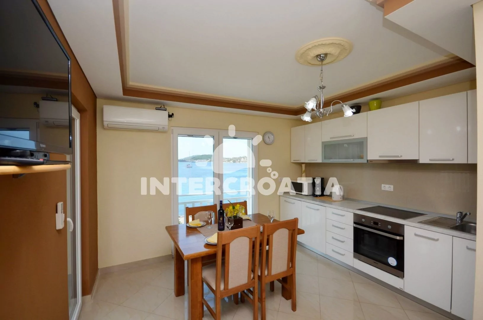 Nadstandardně zařízený apartmán s terasou s posezením a výhledem na moře, nacházející se v 1.patře domu. Vstup, obývací pokoj spojený s kuchyní. Kuchyňská linka se sklokeramickou varnou deskou,…