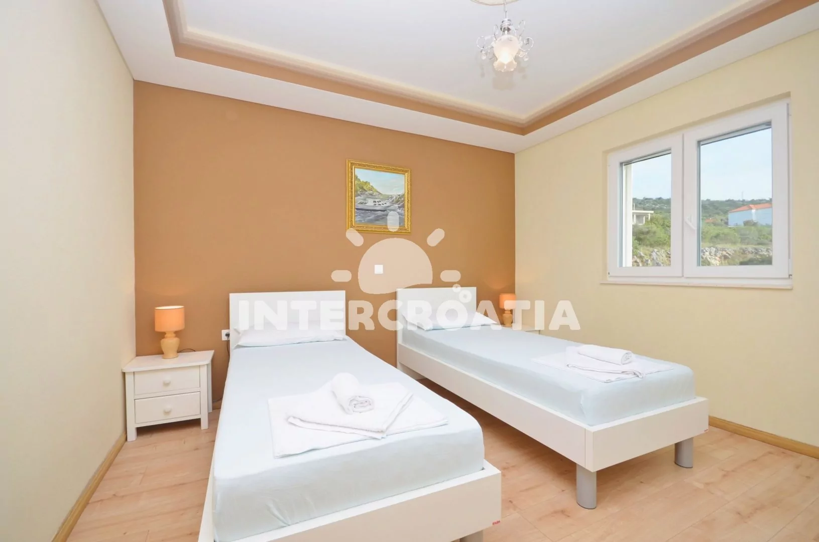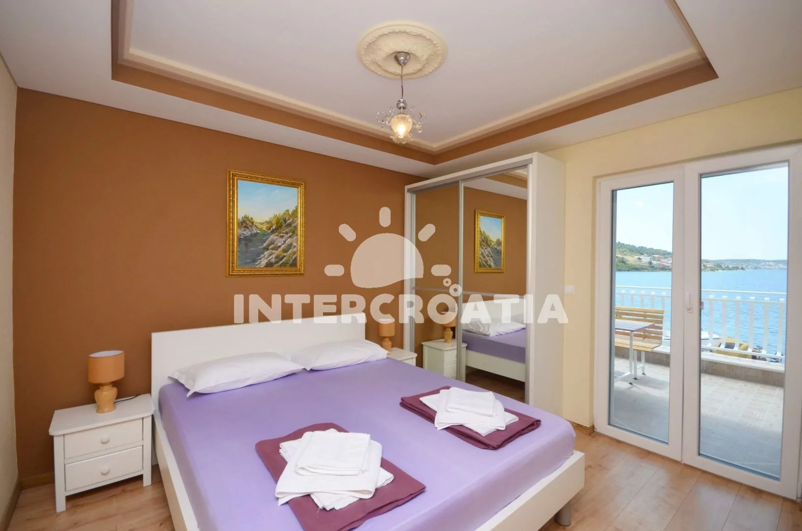 Nadstandardně zařízený apartmán s terasou s posezením a výhledem na moře, nacházející se v 1.patře domu. Vstup, obývací pokoj spojený s kuchyní. Kuchyňská linka se sklokeramickou varnou deskou, troubou, mikrovlnnou troubou, lednicí s mrazákem, rychlovarnou konvicí a nádobím. V obývací místnosti dále jídelní stůl pro 4 osoby, pohovka a televize se satelitem. První ložnice s dvoulůžkem. Druhá ložnice s dvěma jednolůžky. Koupelna se sprchovým koutem, umyvadlem a wc. Hosté mají k dispozici terasu s posezením a dále společné kryté posezení s grilem. Parkování u objektu.