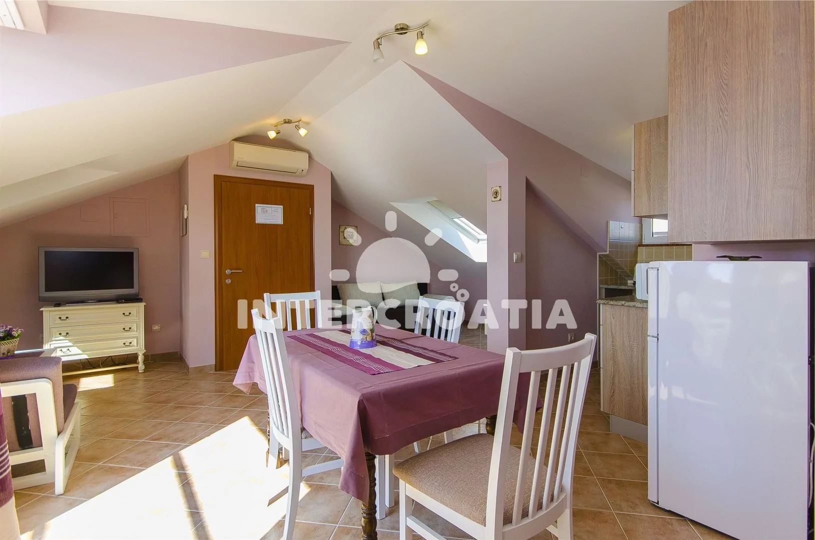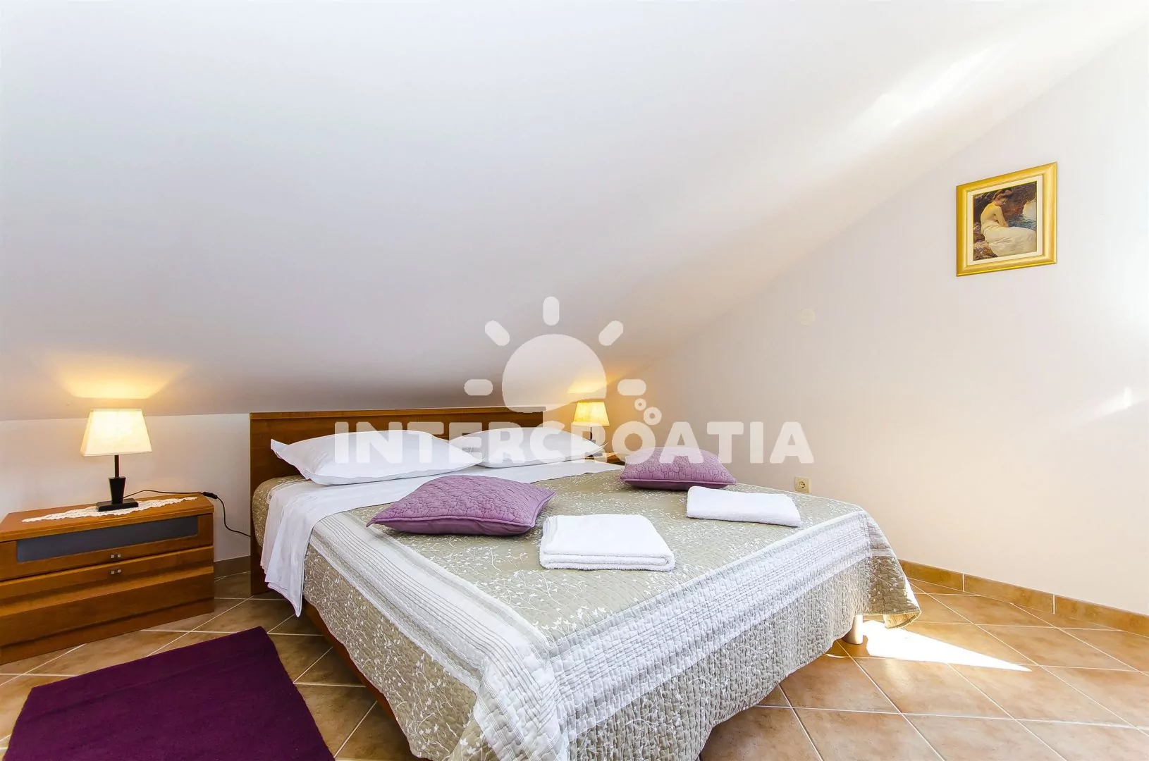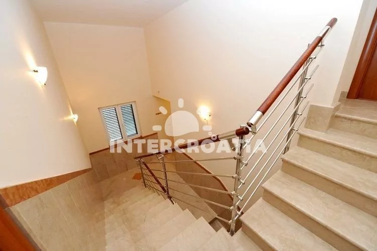 Luxusní třípokojový apartmán s terasou, nacházející se v 2. patře domu. Obývací místnost spojená s kuchyní. Kuchyňská linka se sklokeramickou varnou deskou, mikrovlnnou troubou, lednicí s mrazákem, rychlovarnou konvicí a nádobím. V obývací místnosti jídelní stůl pro 4 osoby, pohovka a LCD televize se satelitem. První ložnice s dvoulůžkem. Druhá ložnice s dvěma jednolůžky. Koupelna se sprchovým koutem, umyvadlem a wc. Hosté mají k dispozici terasu s posezením. Parkování u objektu.
