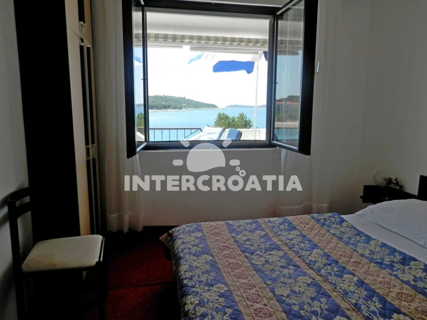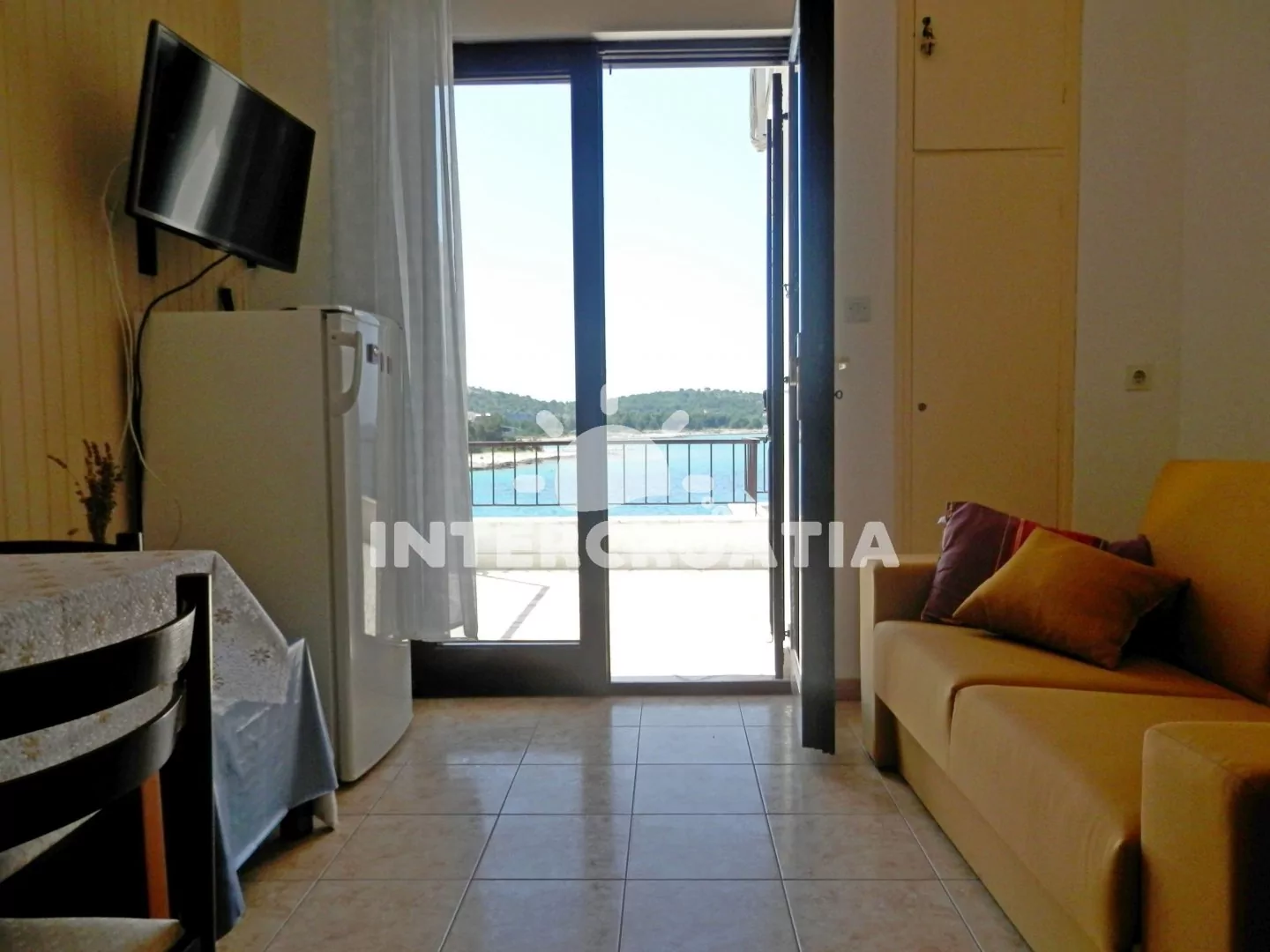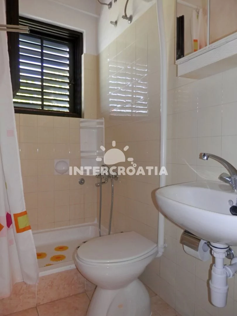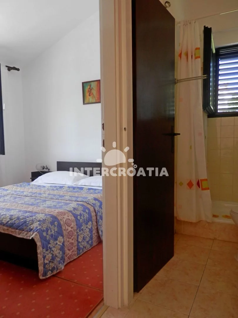 Apartmán se nachází v prvním patře, disponuje výhledem na moře, terasou a posezením je vhodný pro 2 až 3 osoby. Obývací pokoj je spojený s kuchyní. Kuchyňská linka je vybavena sporákem, digestoří, troubou, rychlovarnou konvicí, kávovarem, nádobím a lednicí s mrazákem. Obývací pokoj s jídelním stolem pro 3 osoby, televizí se satelitním programem, rozložitelnou pohovkou (extra lůžko pro 1 osobu) a vstupem na terasu. Ložnice je vybavena jedním dvoulůžkem. Koupelna se sprchovým koutem, umyvadlem, fénem a wc. Hostům je k dispozici a parkování u objektu zdarma.