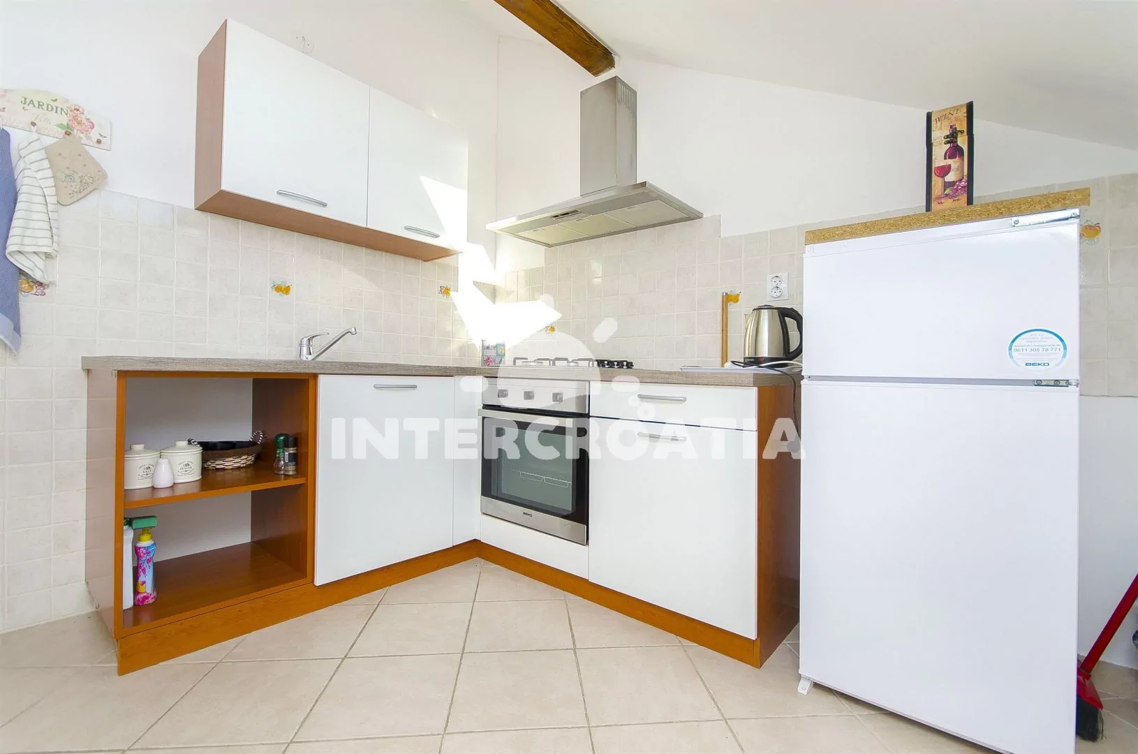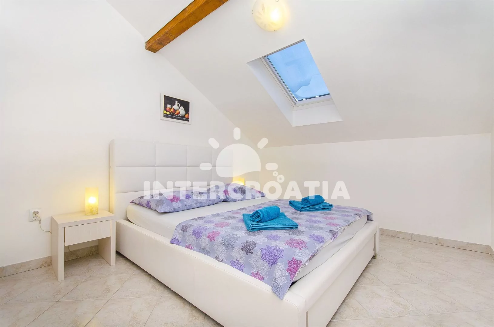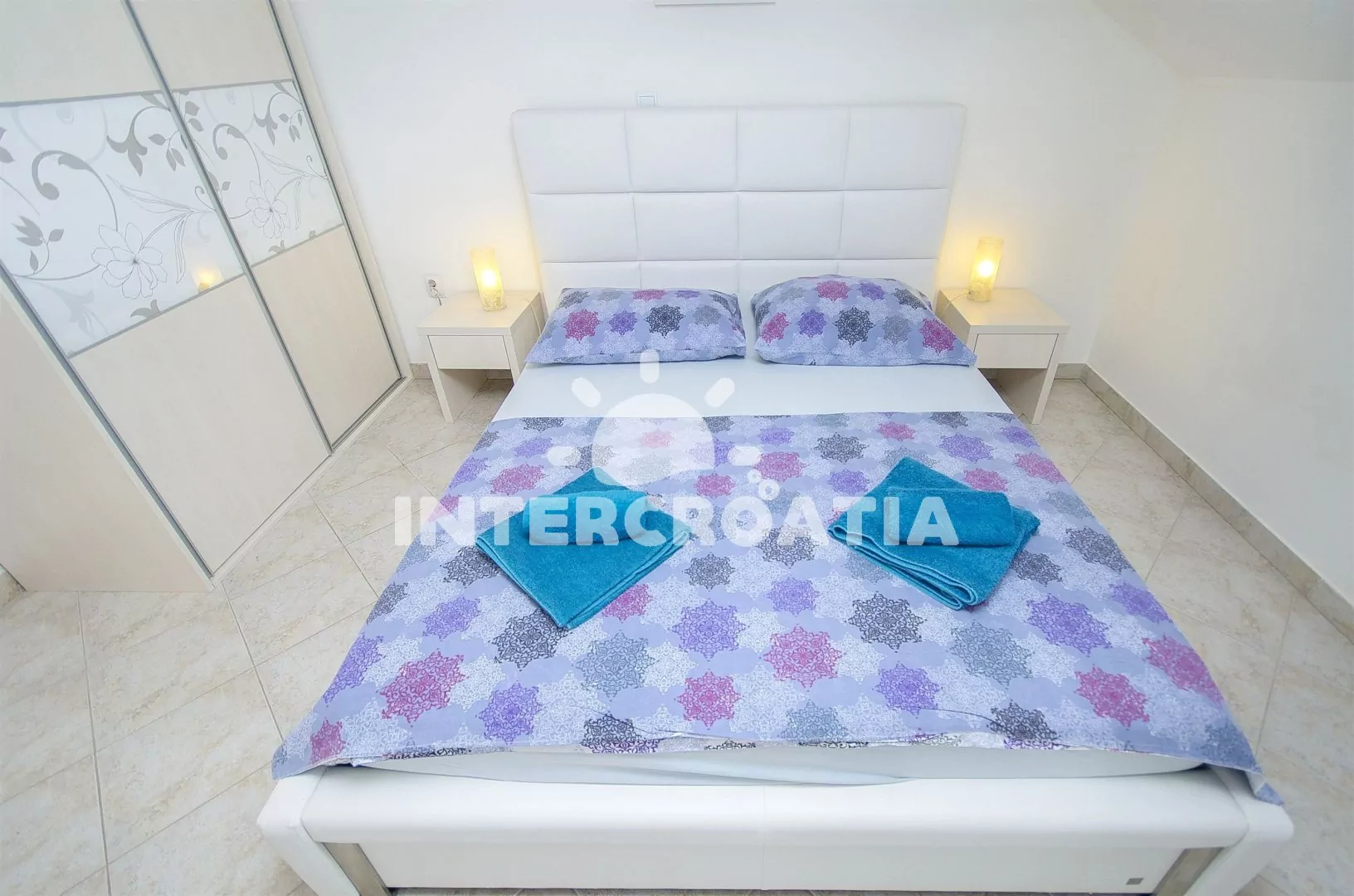 Velmi hezky vybavený apartmán (60 m2) s vlastním balkonem a výhledem na moře. Nachází se v druhém patře vilky a je vhodný pro 4 až 6 osob. Vstup: velká místnost rozdělena na tři části, obývací pokoj, kuchyňský kout a jídelna se vstupy do ložnic, koupelny a na balkon. Kuchyňská linka je vybavena sporákem, digestoří, troubou, rychlovarnou konvicí, nádobím a lednicí s mrazákem, dále jídelní stůl pro 6 osob a klimatizace. Obývací pokoj s pohovkou (rozložitelná na extra lůžko pro 2 osoby), televizí se satelitním programem a WiFi připojením. První i druhá ložnice je vybavena vždy s jedním dvoulůžkem a šatní skříní. Koupelna se sprchovým koutem, umyvadlem, fénem a wc.