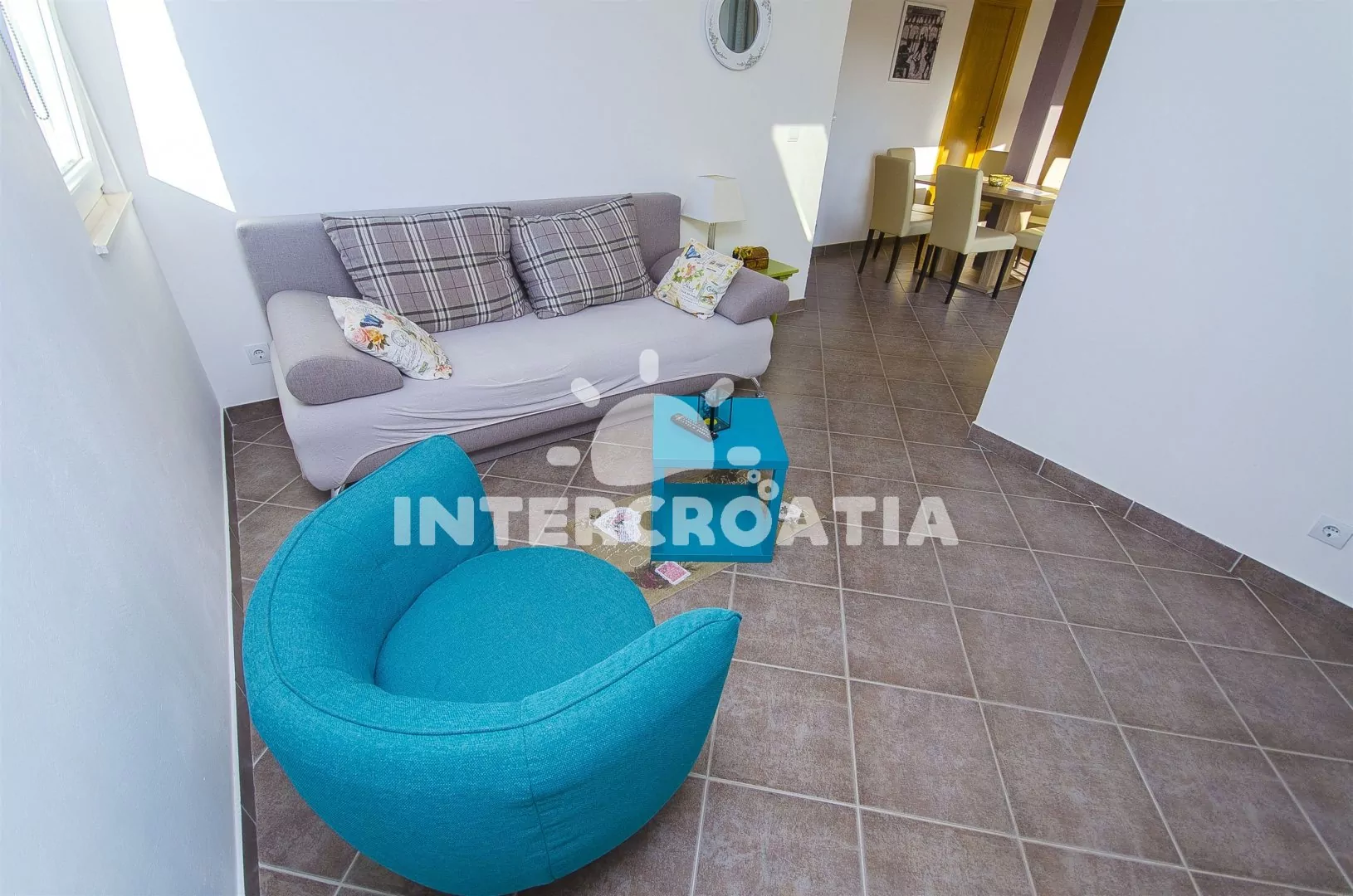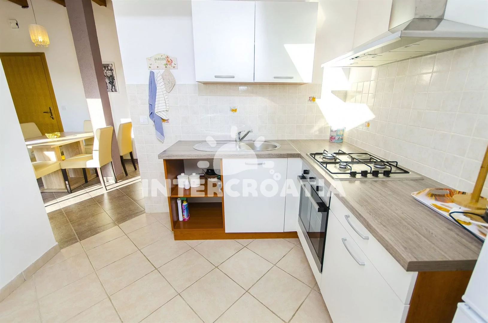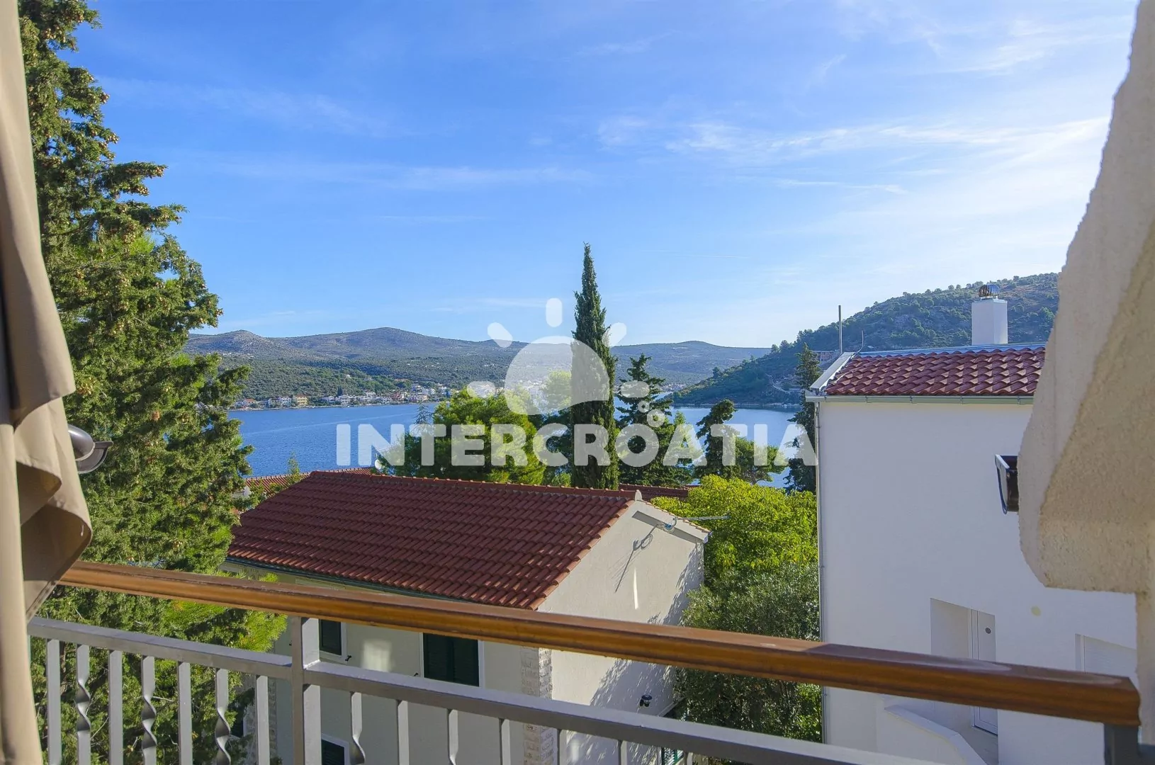 Velmi hezky vybavený apartmán (60 m2) s vlastním balkonem a výhledem na moře. Nachází se v druhém patře vilky a je vhodný pro 4 až 6 osob. Vstup: velká místnost rozdělena na tři části, obývací pokoj, kuchyňský kout a jídelna se vstupy do ložnic, koupelny a na balkon. Kuchyňská linka je vybavena sporákem, digestoří, troubou, rychlovarnou konvicí, nádobím a lednicí s mrazákem, dále jídelní stůl pro 6 osob a klimatizace. Obývací pokoj s pohovkou (rozložitelná na extra lůžko pro 2 osoby), televizí se satelitním programem a WiFi připojením. První i druhá ložnice je vybavena vždy s jedním dvoulůžkem a šatní skříní. Koupelna se sprchovým koutem, umyvadlem, fénem a wc.