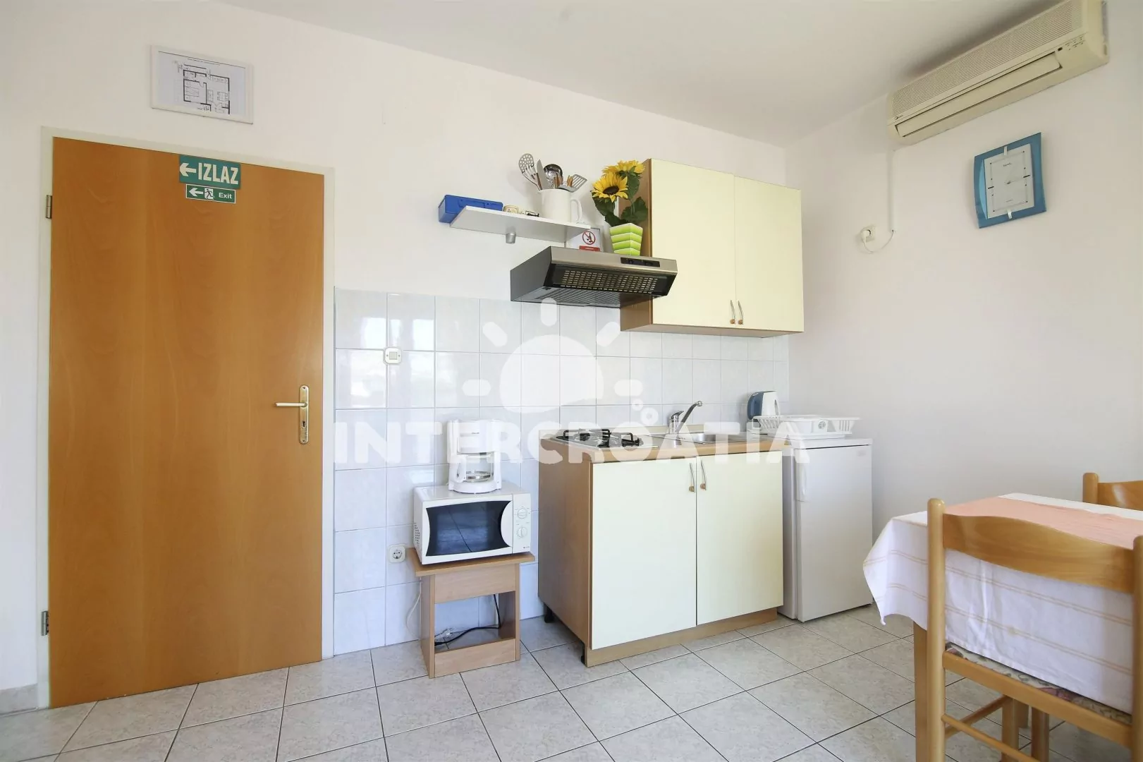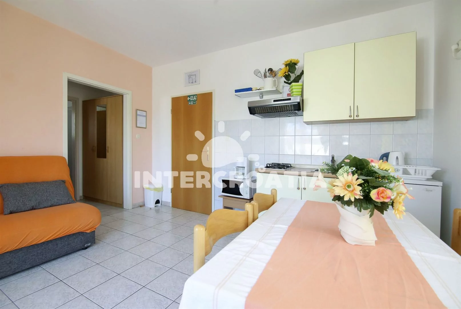 Vzdálenosti: Moře a pláž 150 m, centrum, restaurace, půjčovna kol 500 m, potápění 1,5 km, lékárna, přístav, veřejná doprava, supermarket, tenis, venkovní bazén 800 m, banka, směnárna 1 km, ambulance, pošta 1,2 km, bar 100 m, čerpací stanice, diskotéka 7 km, muzeum 21 km, letiště 25 km, trajekt 50 km.