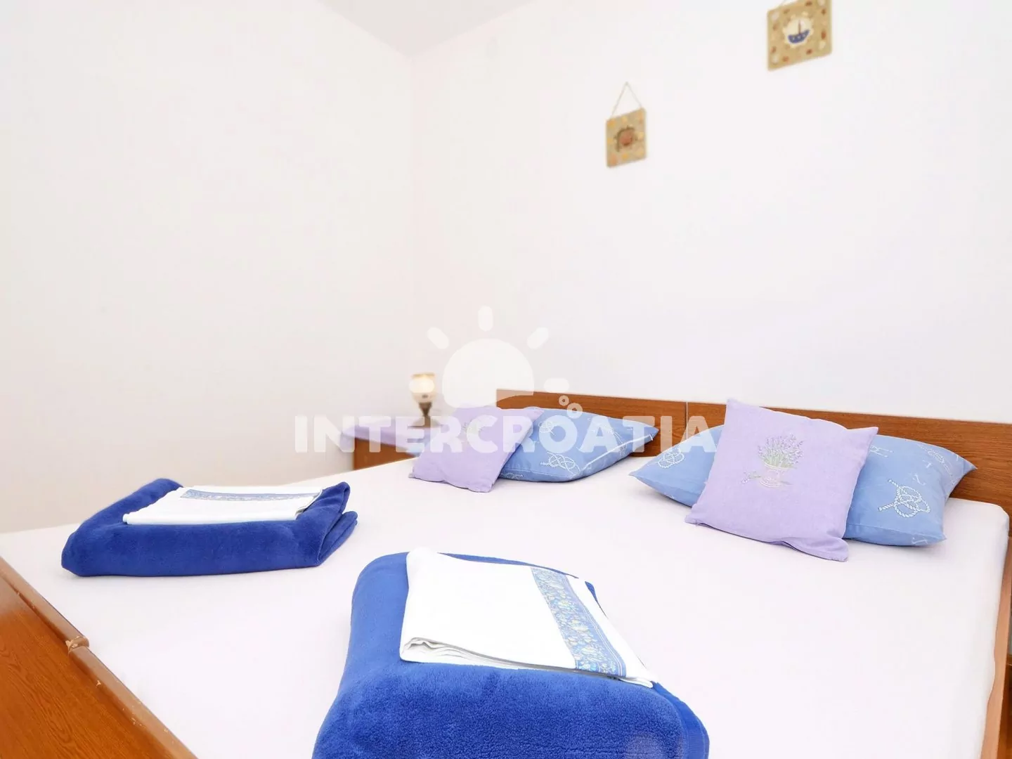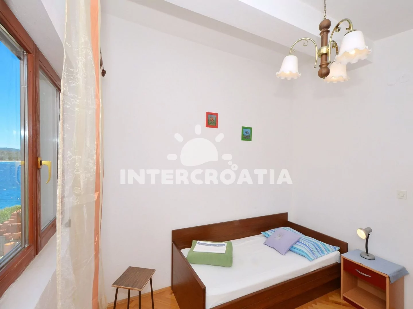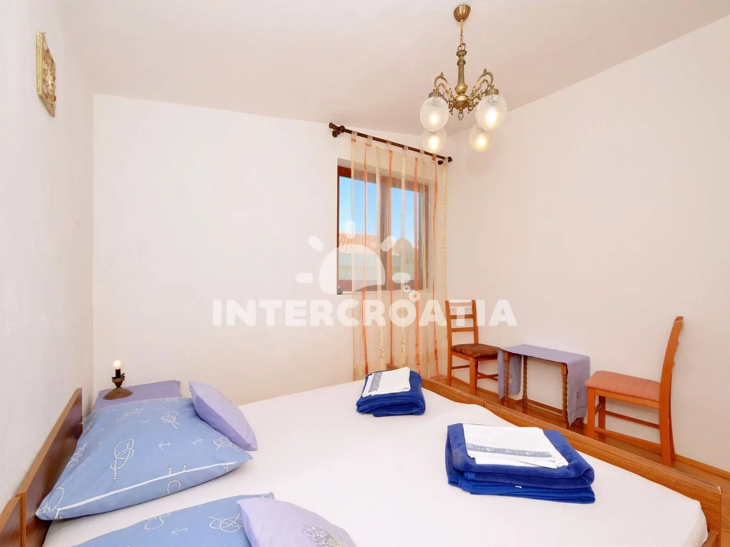 Apartmán s vlastním balkonem, dvěma ložnicemi a výhledem na moře je vhodný pro 4 osoby. Apartmán se nachází v druhém patře domu. Obývací pokoj je spojený s kuchyní. Kuchyňská linka je vybavena sporákem, troubou, rychlovarnou konvicí, nádobím a lednicí s mrazákem. Obývací pokoj s jídelním stolem pro 4 osoby, pohovkou, televizí se satelitním programem a vstupem na balkon. První ložnice s jedním dvoulůžkem. Druhá ložnice s dvěma jednolůžky. Koupelna se sprchovým koutem, umyvadlem a wc. Hosté mají k dispozici parkování u objektu zdarma.