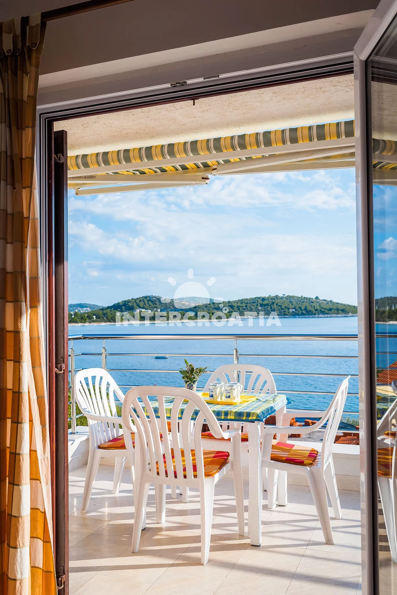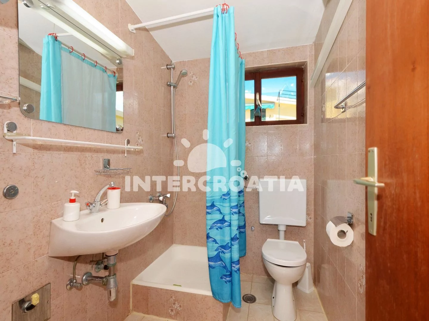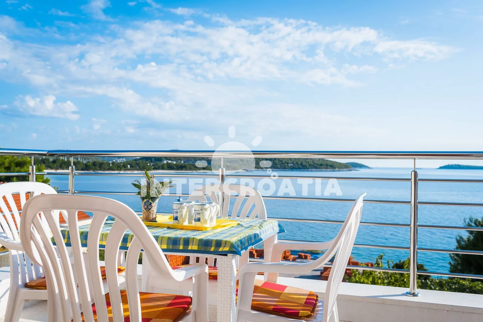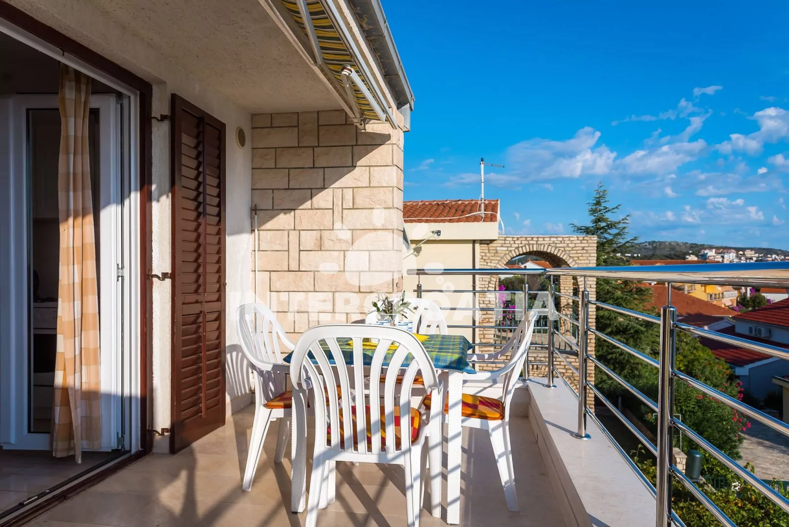 Apartmán s vlastním balkonem, dvěma ložnicemi a výhledem na moře je vhodný pro 4 osoby. Apartmán se nachází v druhém patře domu. Obývací pokoj je spojený s kuchyní. Kuchyňská linka je vybavena sporákem, troubou, rychlovarnou konvicí, nádobím a lednicí s mrazákem. Obývací pokoj s jídelním stolem pro 4 osoby, pohovkou, televizí se satelitním programem a vstupem na balkon. První ložnice s jedním dvoulůžkem. Druhá ložnice s dvěma jednolůžky. Koupelna se sprchovým koutem, umyvadlem a wc. Hosté mají k dispozici parkování u objektu zdarma.