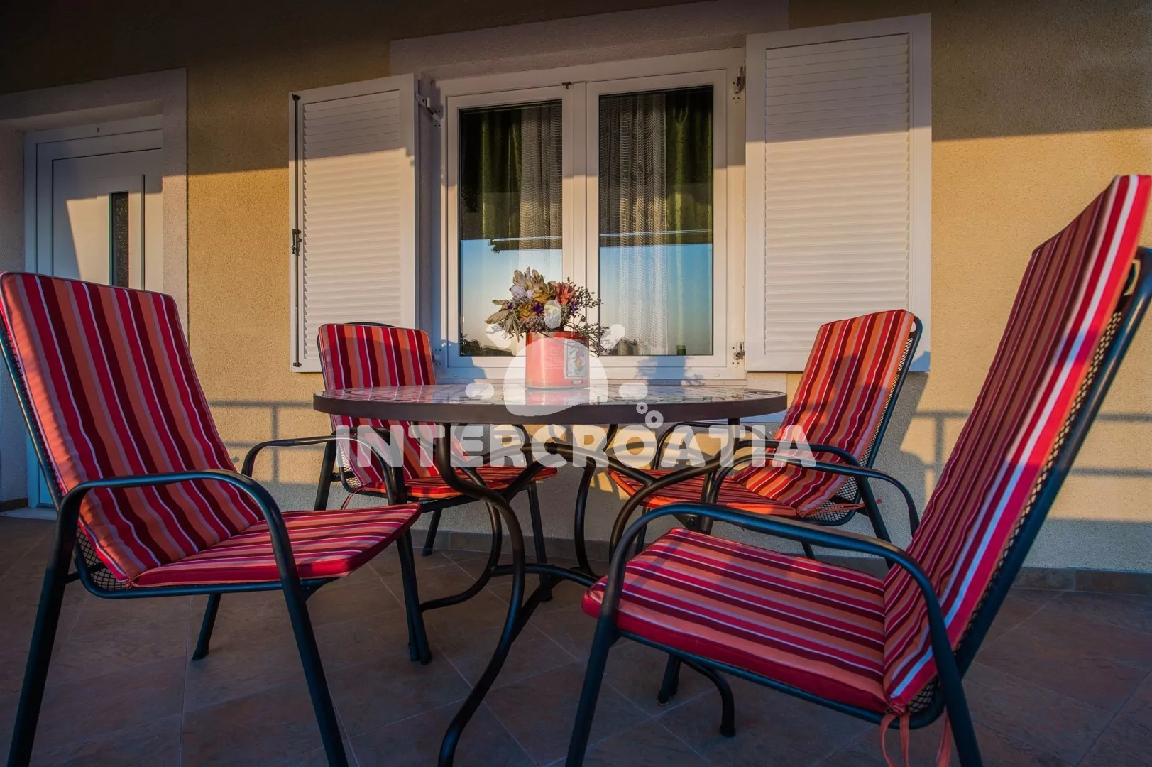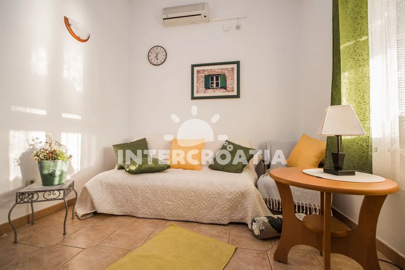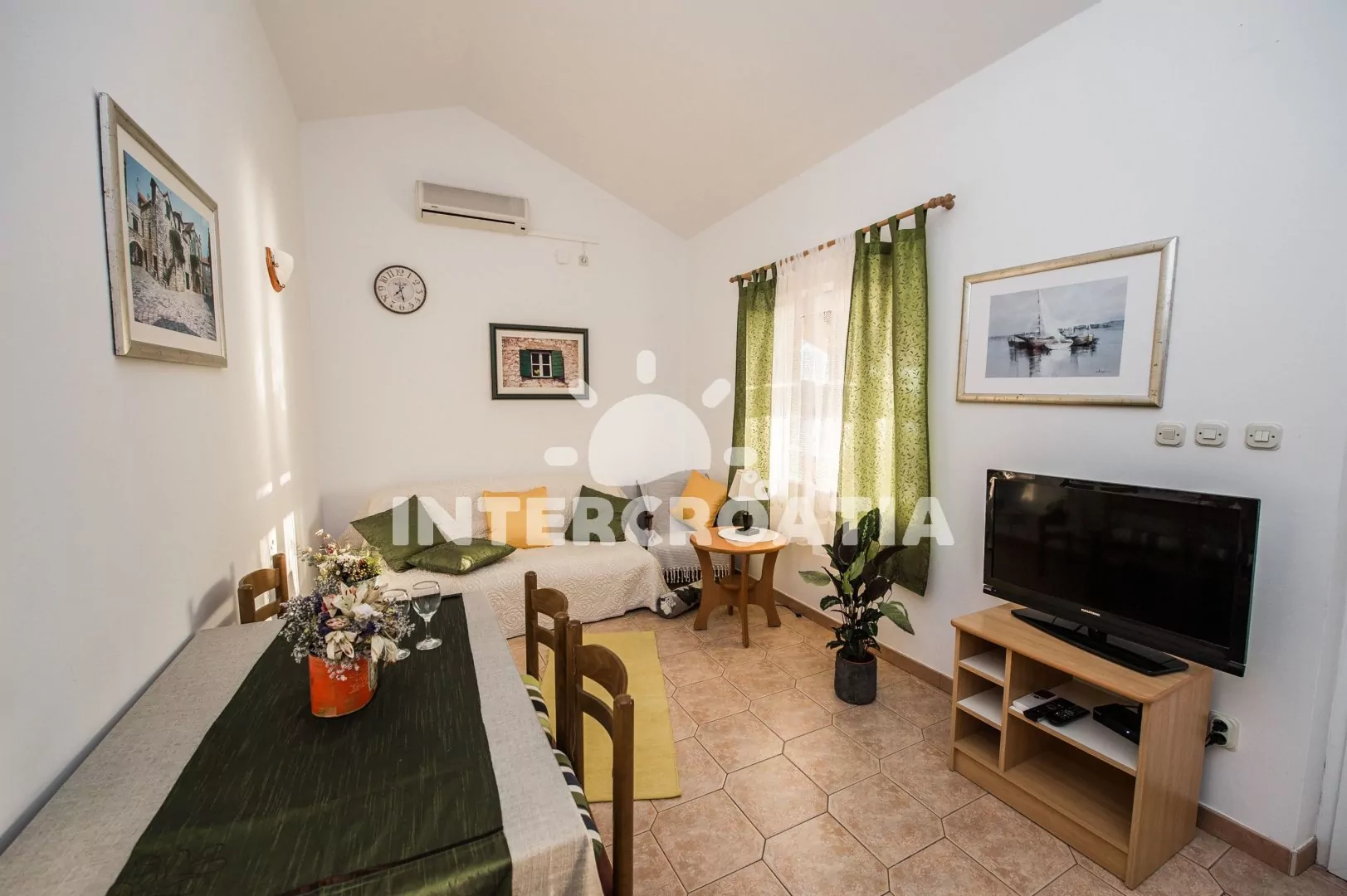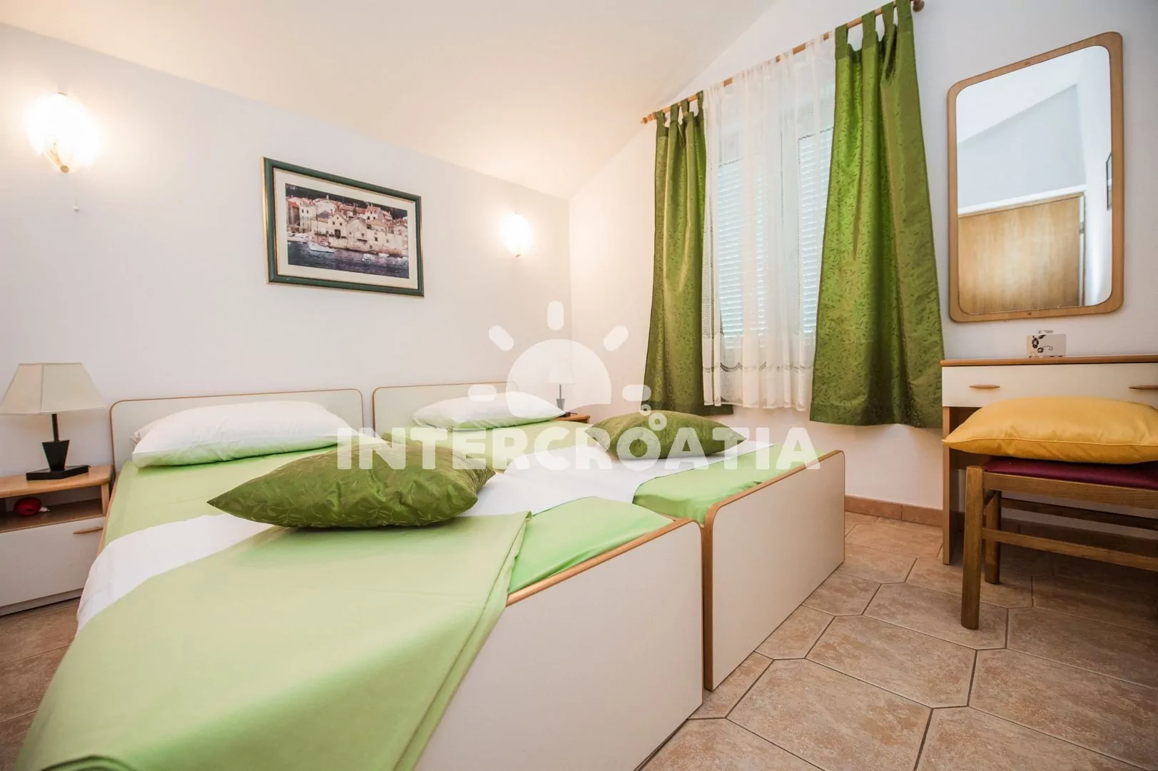 Apartmán v druhém patře vily s výhledem na moře a vlastní terasou je vhodný pro 2 až 4 osoby. Obývací pokoj je spojený s kuchyní. Kuchyňská linka je vybavena dvouplotýnkovým sporákem, kávovarem, nádobím a lednicí s mrazákem. Obývací pokoj s jídelním stolem pro 4 osoby, pohovkou (rozložitelná na extra lůžko pro 2 osoby), televizí se satelitním programem a klimatizací. Ložnice je vybavena jedním dvoulůžkem. Koupelna se sprchovým koutem, umyvadlem, fénem a wc. Hostům je k dispozici parkování u objektu zdarma.