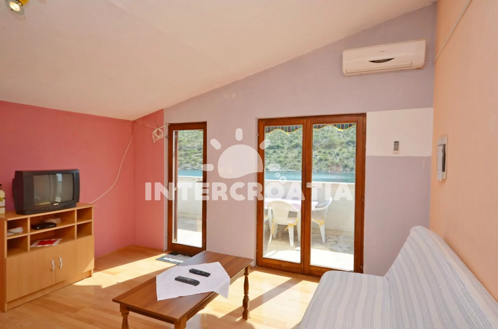 Apartmán (45 m2) s výhledem na moře, sdílenou terasou a venkovním posezením, nachází se v druhém patře domu a je vhodný pro 2 až 4 osoby. Obývací pokoj je spojený s kuchyní. Kuchyňská linka je…