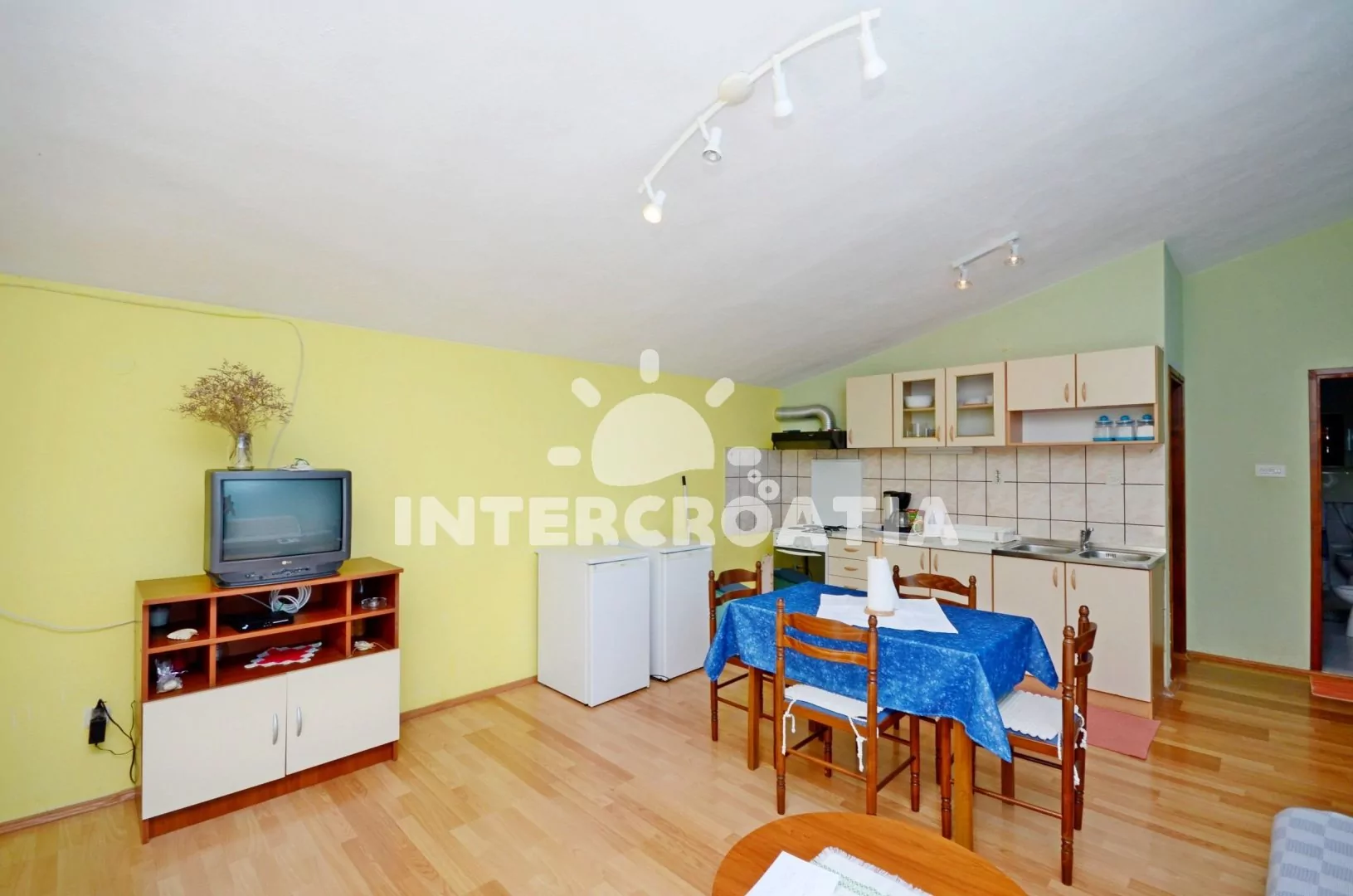 Apartmán (45 m2) s výhledem na moře, sdílenou terasou a venkovním posezením, nachází se v druhém patře domu a je vhodný pro 2 až 4 osoby. Obývací pokoj je spojený s kuchyní. Kuchyňská linka je vybavena sporákem, digestoří, troubou, rychlovarnou konvicí, kávovarem, nádobím a lednicí s mrazákem. Obývací pokoj s jídelním stolem pro 4 osoby, sedací soupravou, pohovkou (rozložitelná na extra lůžko pro 2 osoby), televizí se satelitním programem, klimatizací a vstupem na terasu. Ložnice s jedním dvoulůžkem. Koupelna s vanou, sprchovou zástěnou, umyvadlem, bidetem a wc. Hostům je k dispozici parkování u objektu zdarma.
