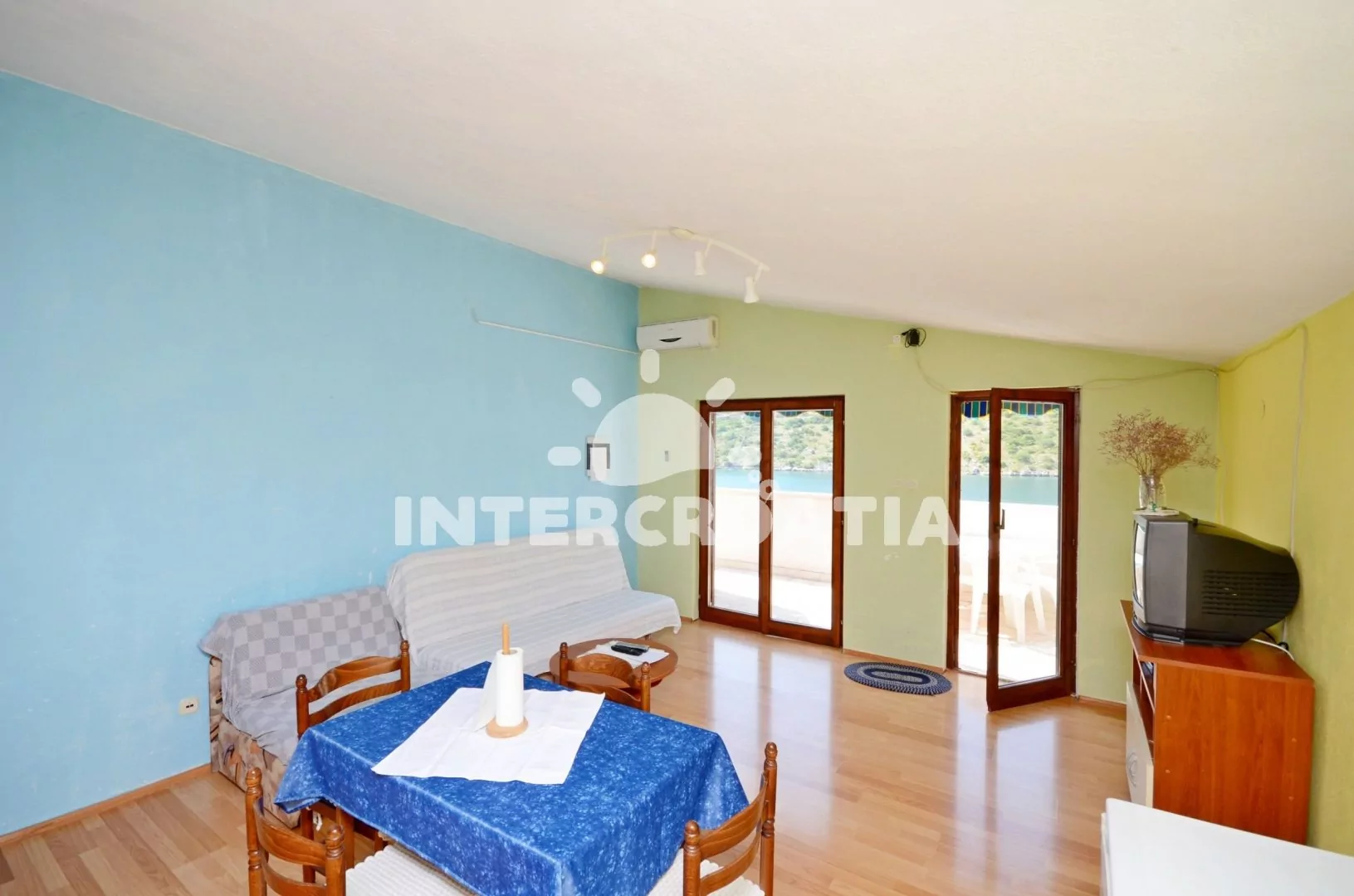 Apartmán (45 m2) s výhledem na moře, sdílenou terasou a venkovním posezením, nachází se v druhém patře domu a je vhodný pro 2 až 4 osoby. Obývací pokoj je spojený s kuchyní. Kuchyňská linka je…
