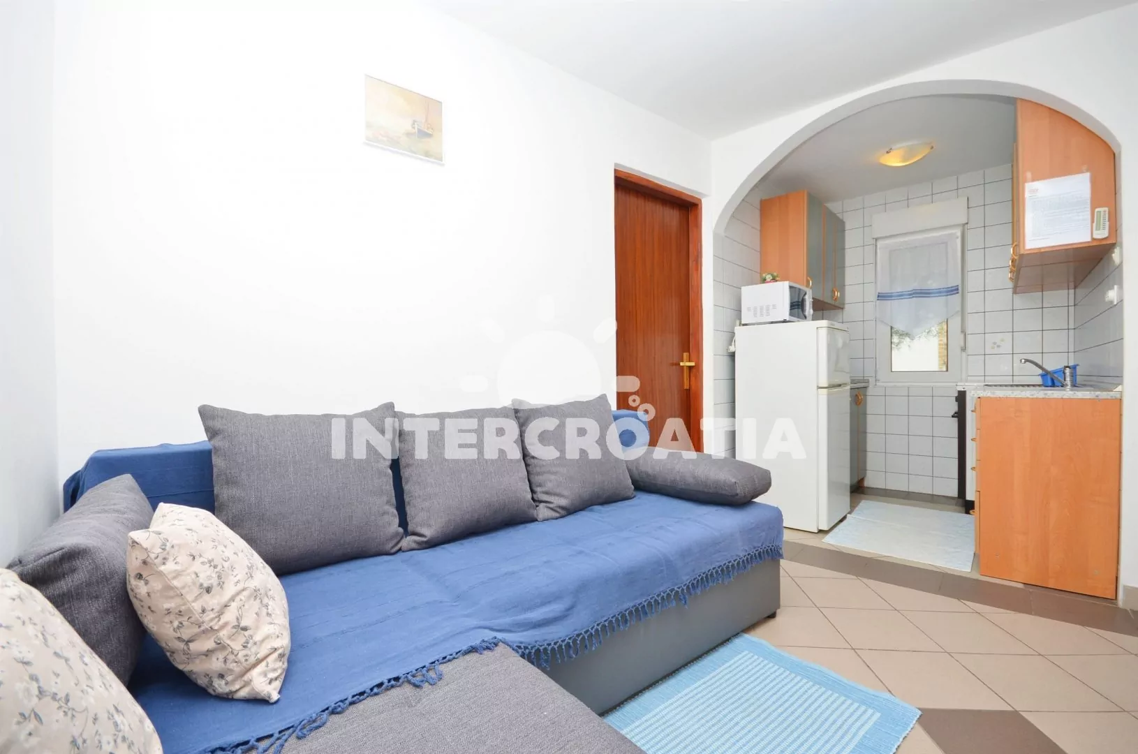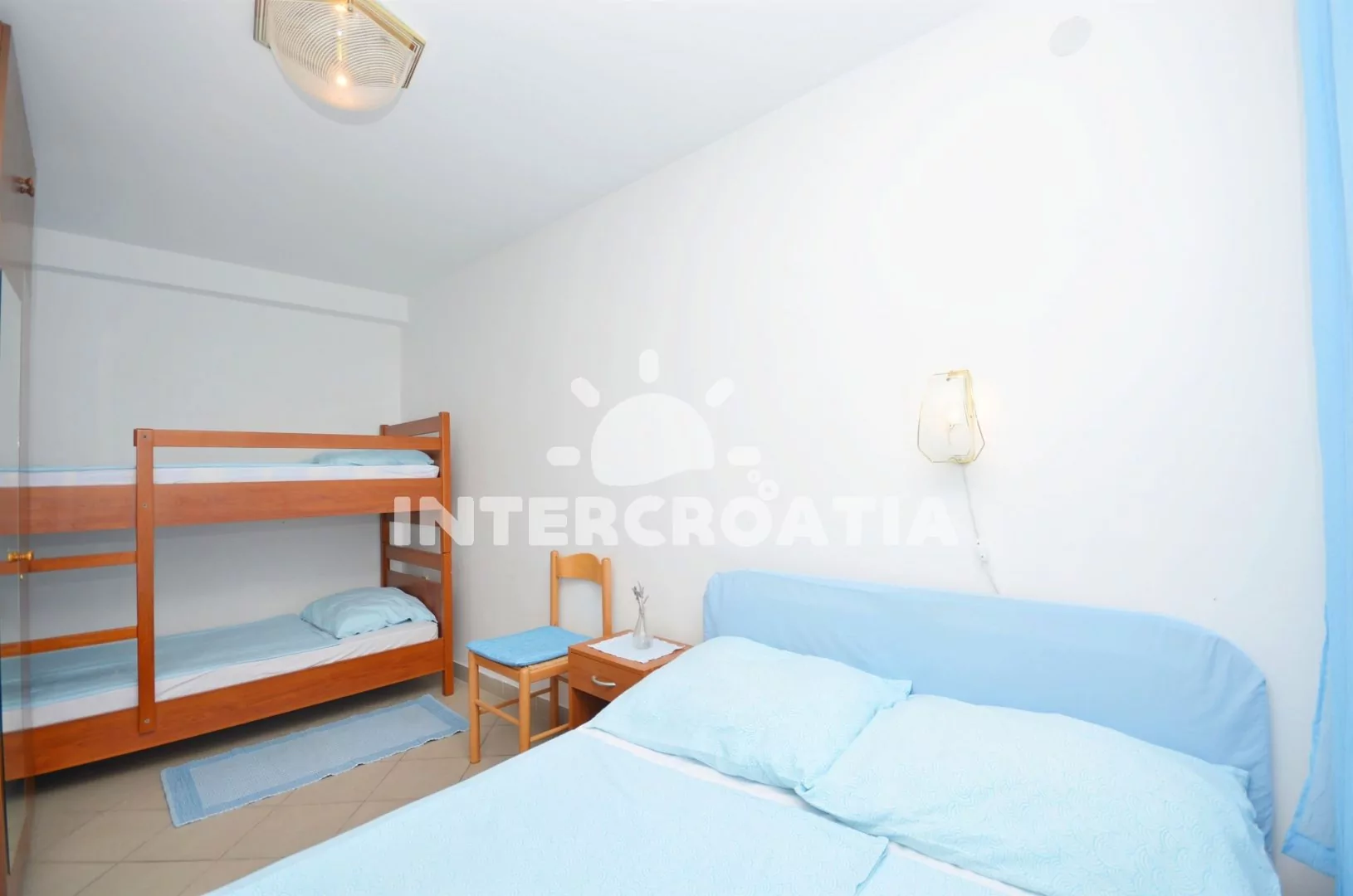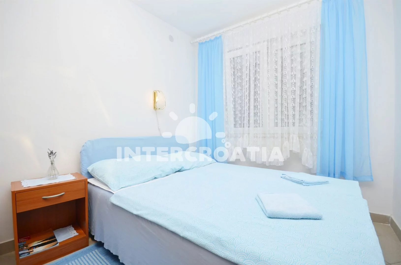 Apartmán se nachází v prvním patře domu. Obývací pokoj spojený s kuchyní. Kuchyňská linka se sporákem, troubou, mikrovlnnou troubou, lednicí s mrazákem, kávovarem, rychlovarnou konvicí a nádobím. Obývací pokoj s pohovkou, jídelním stolem, klimatizací, televizí, rádiem a kuchyňským koutem. Ložnice s dvoulůžkem a dvěma extra lůžky (patrová postel). Koupelna se sprchovým koutem, umyvadlem, toaletou a fénem. Terasa s částečným výhledem na moře. Hostům je k dispozici parkování u objektu zdarma.