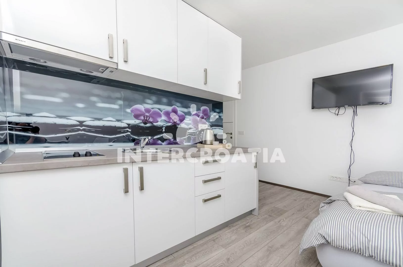Hezky zařízený apartmán typu studio s výhledem na moře se nachází v prvním patře domu a je vhodný pro 2 osoby. Obývací místnost je spojena s kuchyní. Kuchyňská linka je vybavena dvouplotýnkovým sporákem, digestoří, rychlovarnou konvicí, nádobím a lednicí s mrazákem. Obývací místnost s jídelním stolem, jedním dvoulůžkem, televizí se satelitním programem, klimatizací a vstupem na terasu. Koupelna se sprchovým koutem, umyvadlem, fénem a wc. Hostům je k dispozici parkování u objektu zdarma.