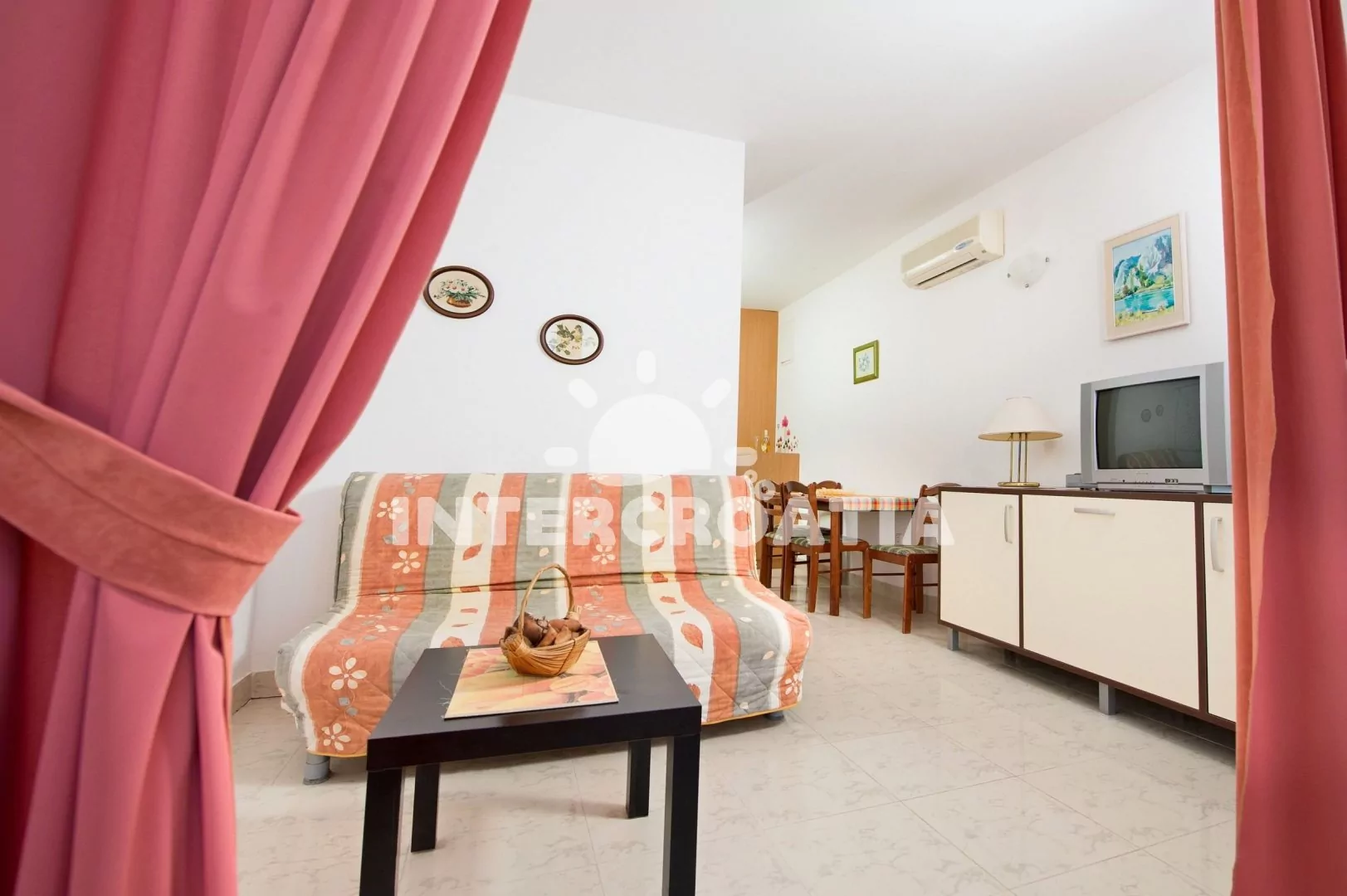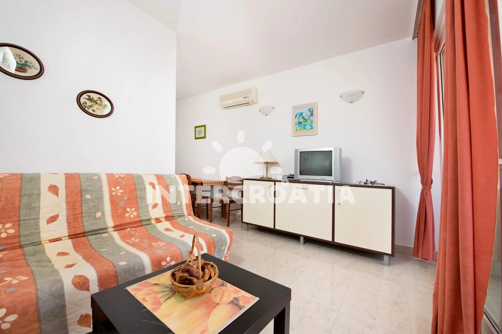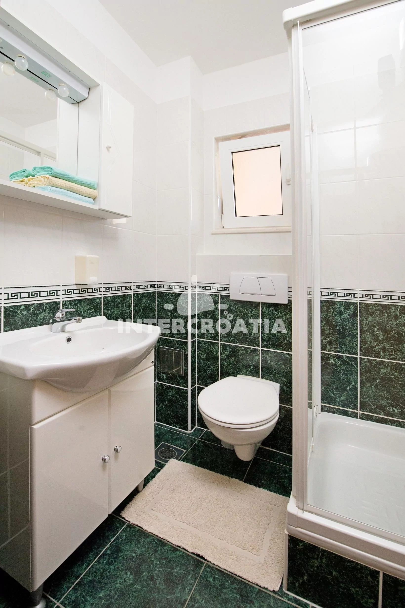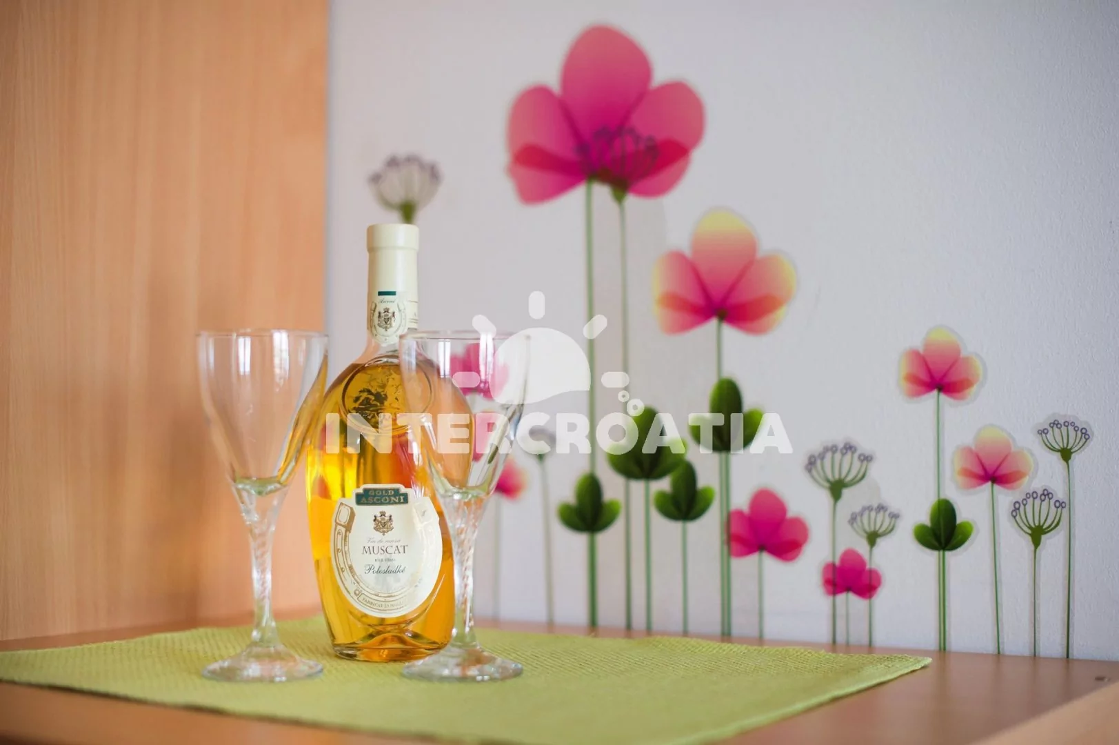 Apartmán s vlastním balkonem a výhledem na moře se nachází v prvním patře vily a je vhodný pro 2 až 4 osoby. Obývací pokoj je spojený s kuchyní. Kuchyňská linka je vybavena dvouplotýnkovým sporákem, digestoří, myčkou na nádobí, rychlovarnou konvicí, nádobím a lednicí s mrazákem. Obývací pokoj s jídelním stolem pro 4 osoby, pohovkou (rozložitelná na extra lůžko pro 2 osoby), televizí se satelitním programem, klimatizací a vstupem na balkon. Ložnice s jedním dvoulůžkem. Koupelna se sprchovým koutem, umyvadlem a wc. Hostům je k dispozici parkování u objektu zdarma.