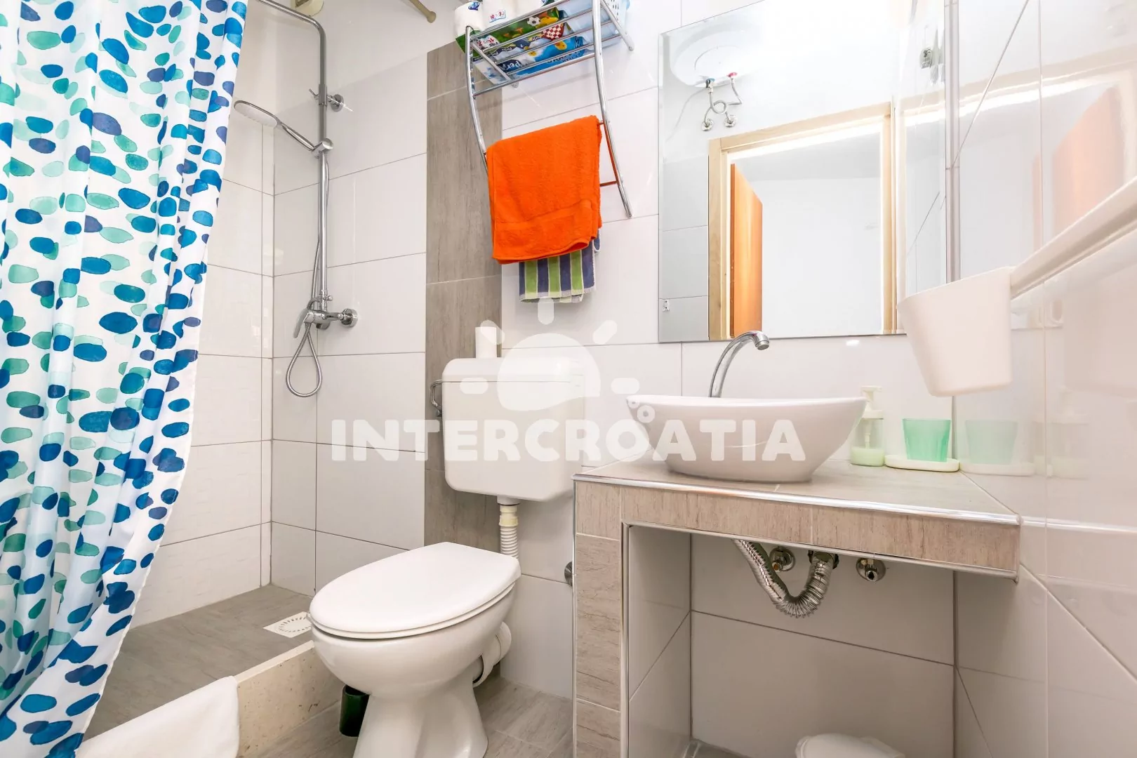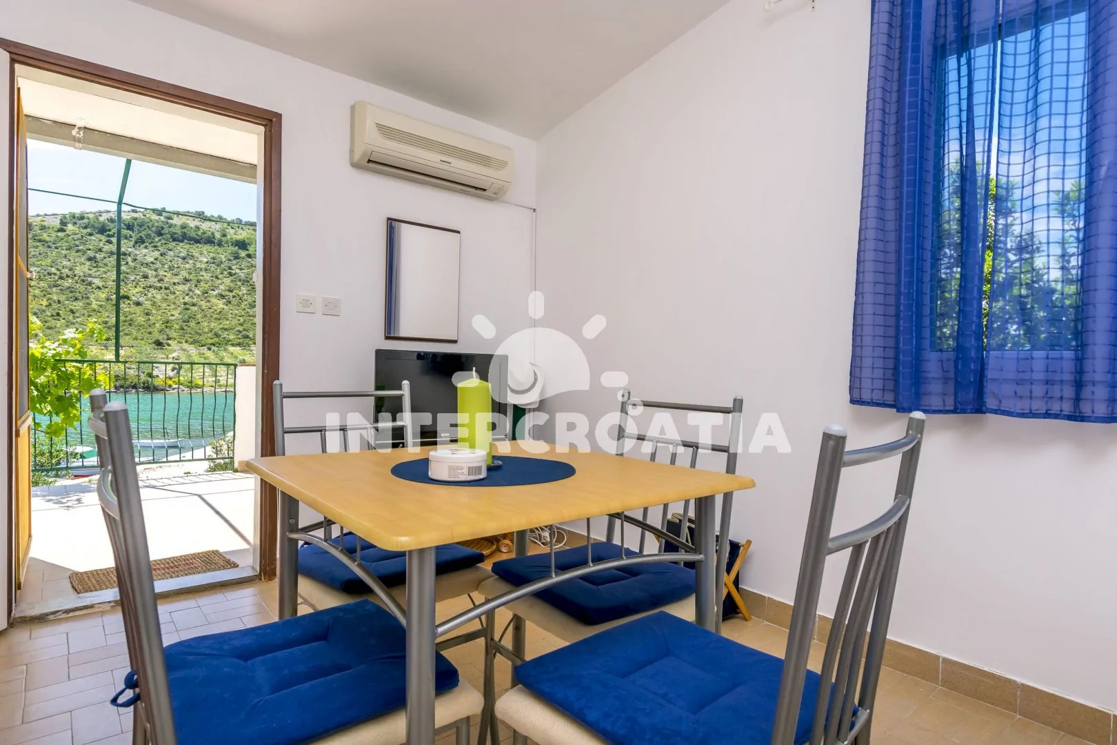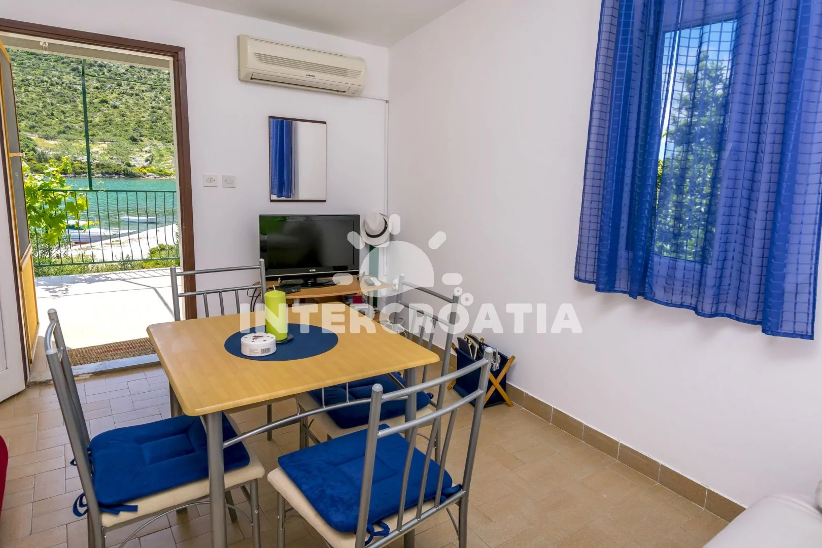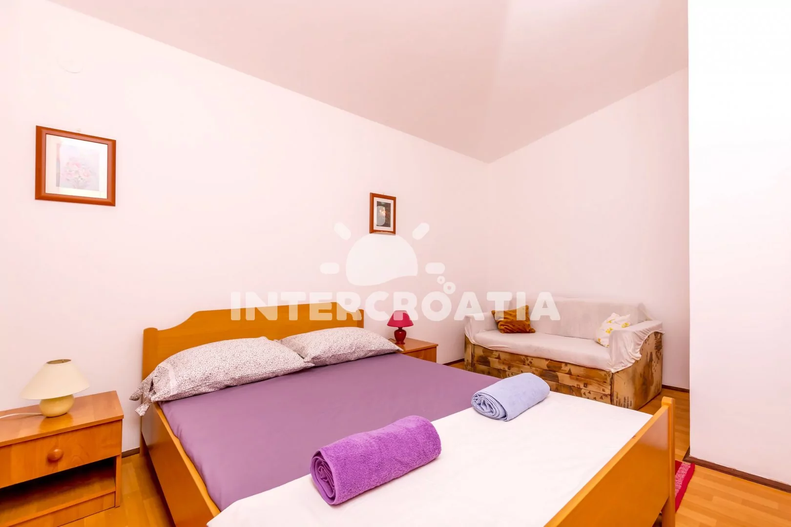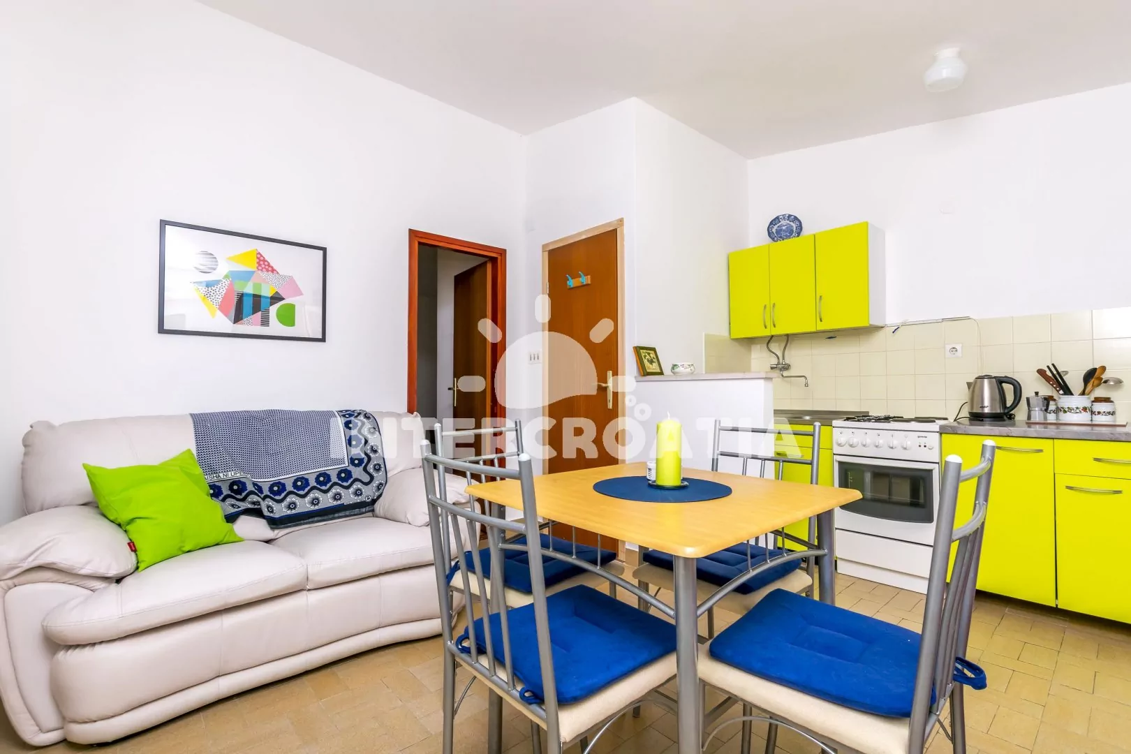 Apartmán (35 m2) s výhledem na moře a sdílenou terasou, se nachází v 1. patře domu a je vhodný pro 2 až 3 osoby. Obývací pokoj je spojený s kuchyní. Kuchyňská linka je vybavena varnou deskou, troubou, rychlovarnou konvicí, nádobím a lednicí s mrazákem. Obývací pokoj s jídelním stolem pro 4 osoby, pohovkou, televizí se satelitním programem, klimatizací a vstupem na terasu. Ložnice s jedním dvoulůžkem a pohovkou (rozložitelná na extra lůžko pro 1 osobu). Koupelna se sprchovým koutem, umyvadlem, fénem a wc. Hostům je k dispozici parkování u objektu zdarma.