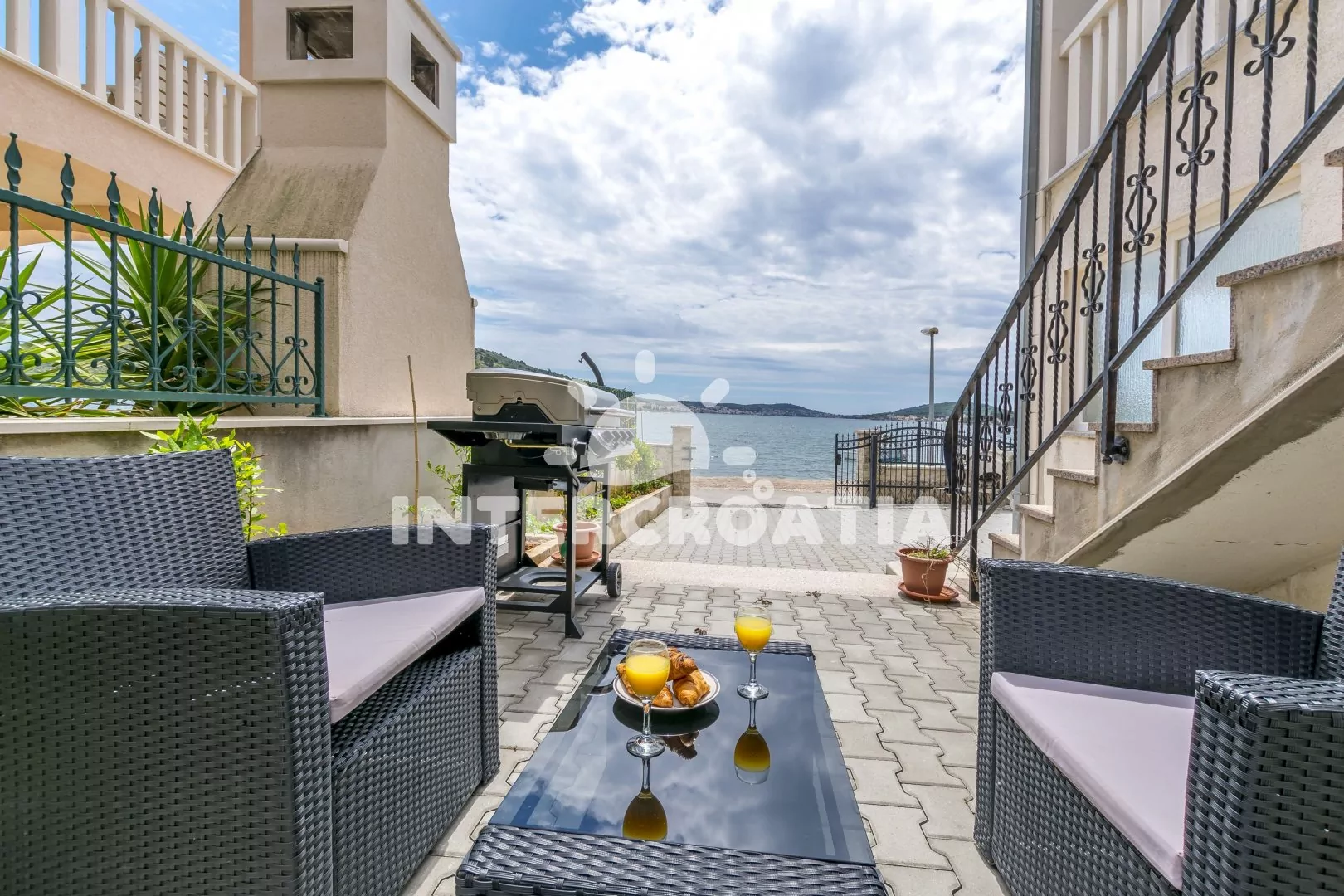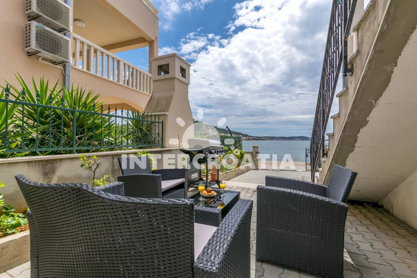 Perfektně umístěný apartmánový dům s výhledem na moře a přímo u oblázkové pláže. K dispozici společná terasa s posezením a grilem. Apartmány mají soukromé lodžie. Parkovací místa přímo na pozemku objektu.