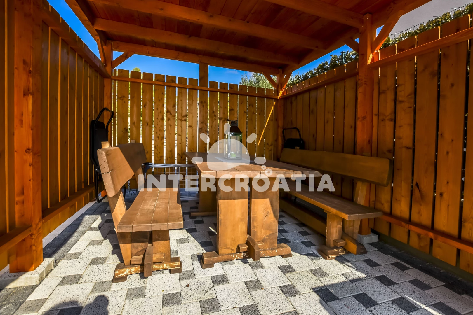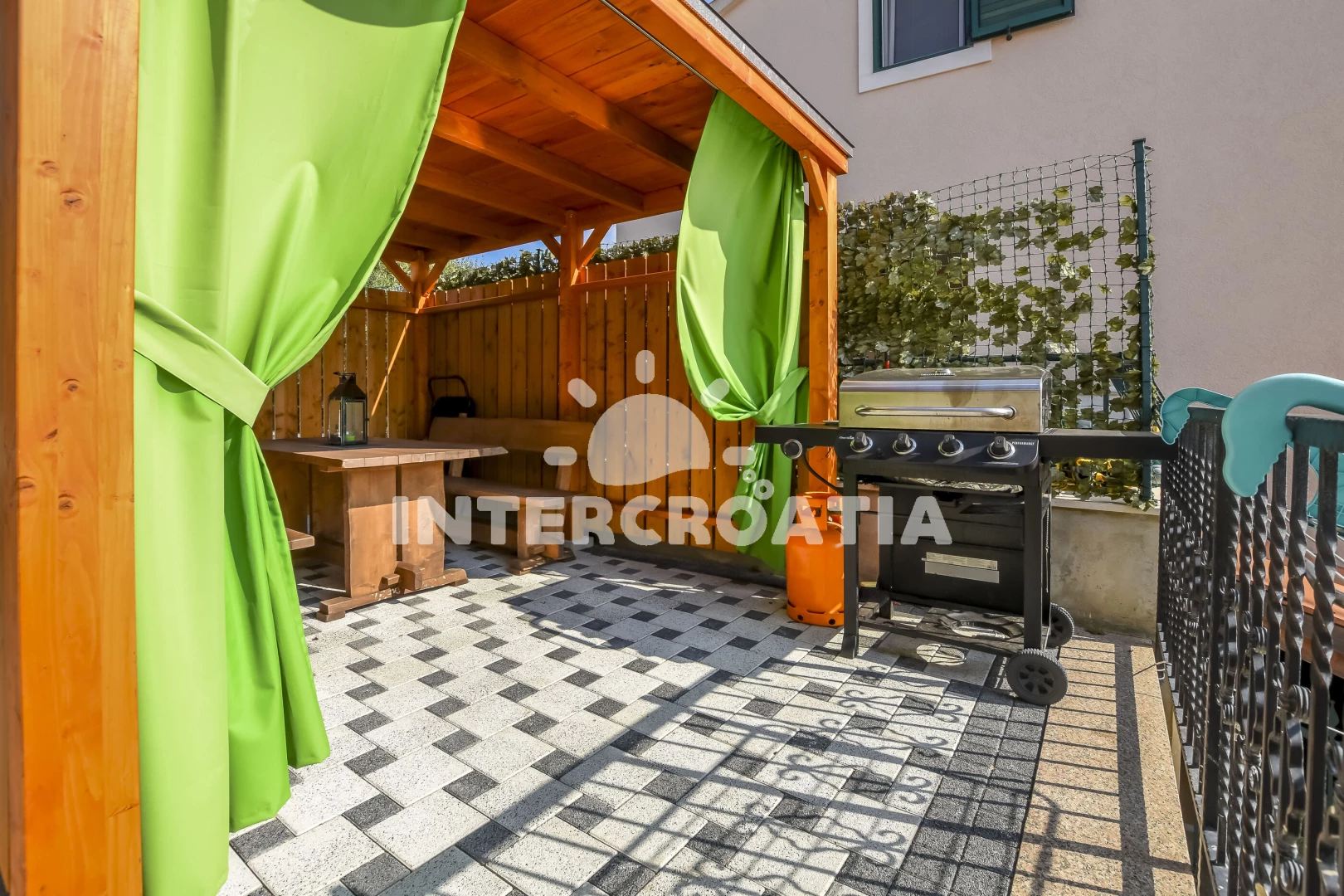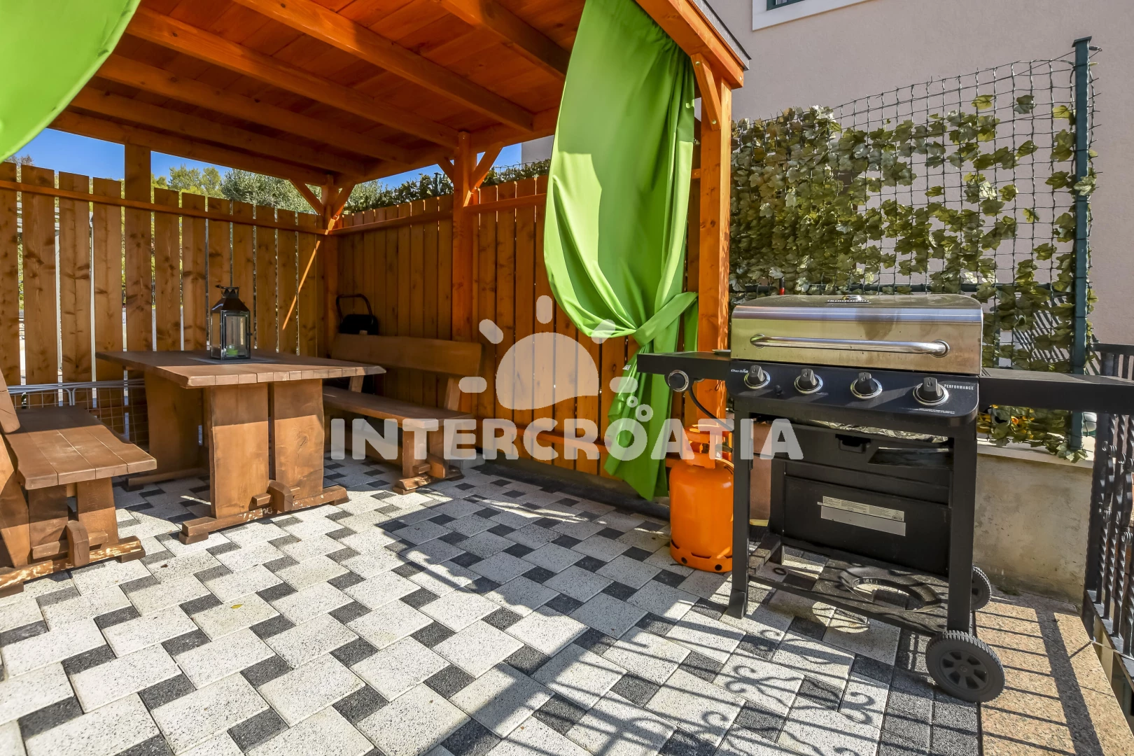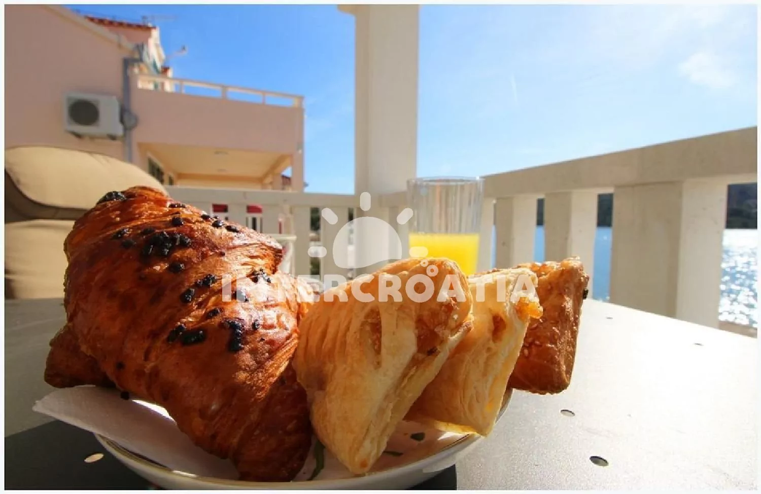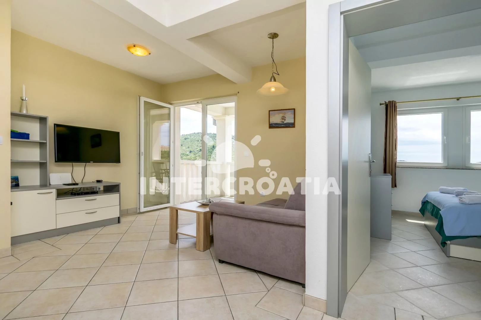 Apartmán (60 m2) s terasou a výhledem na moře, se nachází v 1. patře domu a je vhodný pro 2 až 4 osoby. Obývací pokoj je spojený s kuchyní. Kuchyňská linka je vybavena varnou deskou, digestoří, troubou, myčkou na nádobí, kávovarem, rychlovarnou konvicí, mikrovlnnou troubou, nádobím a lednicí s mrazákem. Obývací pokoj s pohovkou (rozložitelná na extra lůžko pro 2 osoby), televizí se satelitním programem, klimatizací a vstupem na terasu. Ložnice s jedním dvoulůžkem. Koupelna se sprchovým koutem, umyvadlem, fénem a wc. Hostům je k dispozici parkování u objektu zdarma.