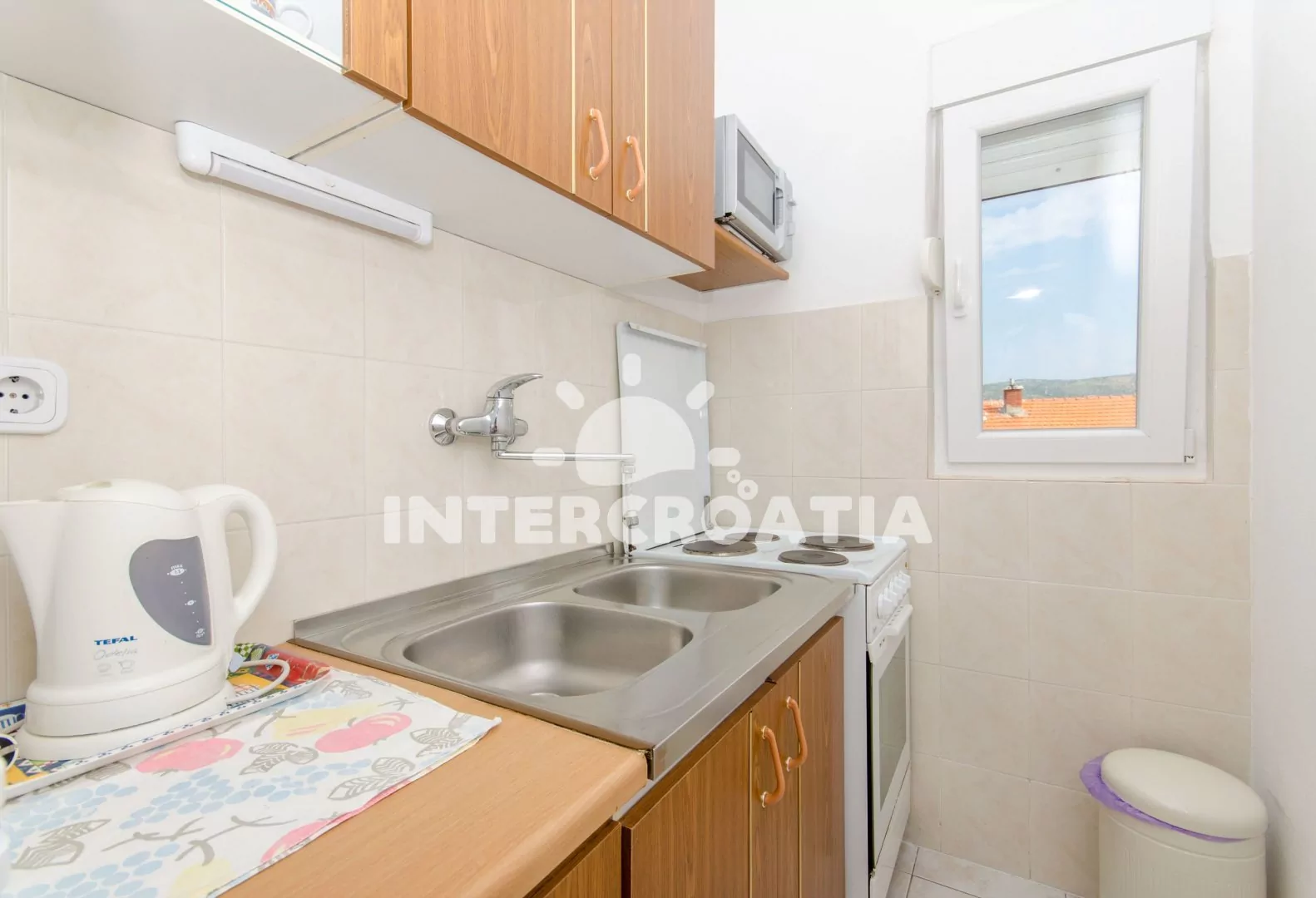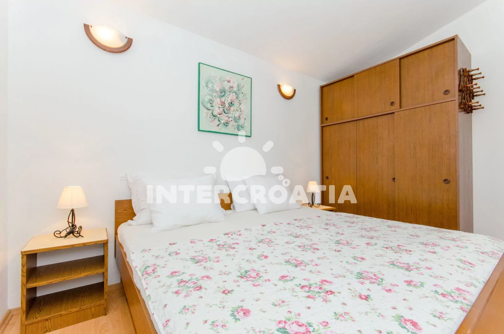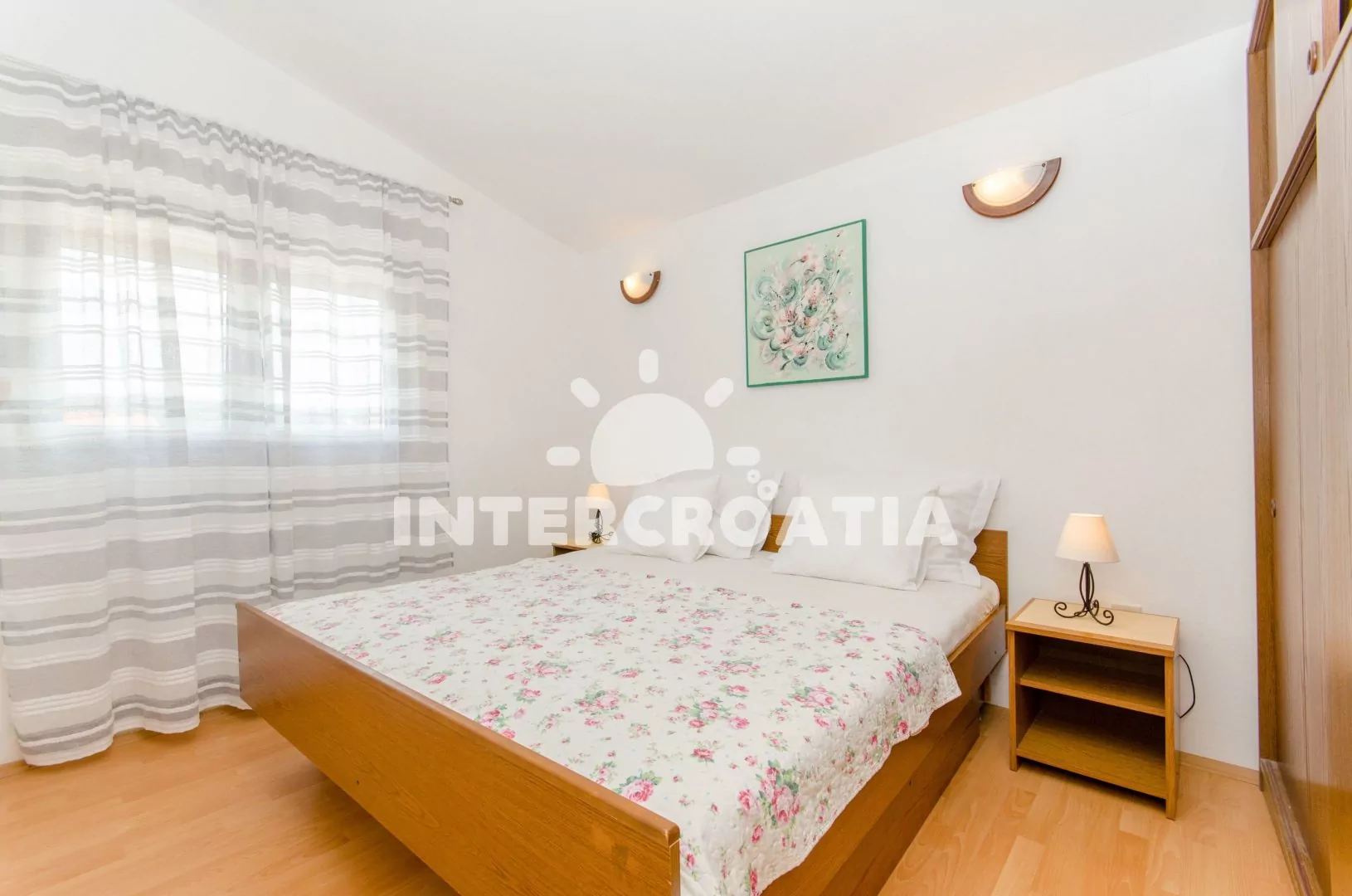 Apartmán (40 m2) s terasou, venkovním posezením a částečným výhledem na moře, se nachází v 2. patře domu a je vhodný pro 4 osoby. Obývací pokoj je spojený s kuchyní. Kuchyňská linka je vybavena sporákem s troubou, rychlovarnou konvicí, mikrovlnnou troubou, nádobím a lednicí s mrazákem. Obývací pokoj s jídelním stolem pro 4 osoby, pohovkou, televizí se satelitním programem, klimatizací a vstupem na terasu. První ložnice s dvoulůžkem. Druhá ložnice s dvoulůžkem a vstupem na terasu. Koupelna s vanou, sprchovou zástěnou, umyvadlem, fénem a wc. Hostům je k dispozici parkování u objektu zdarma.