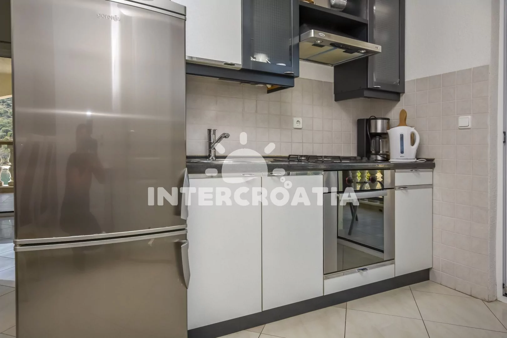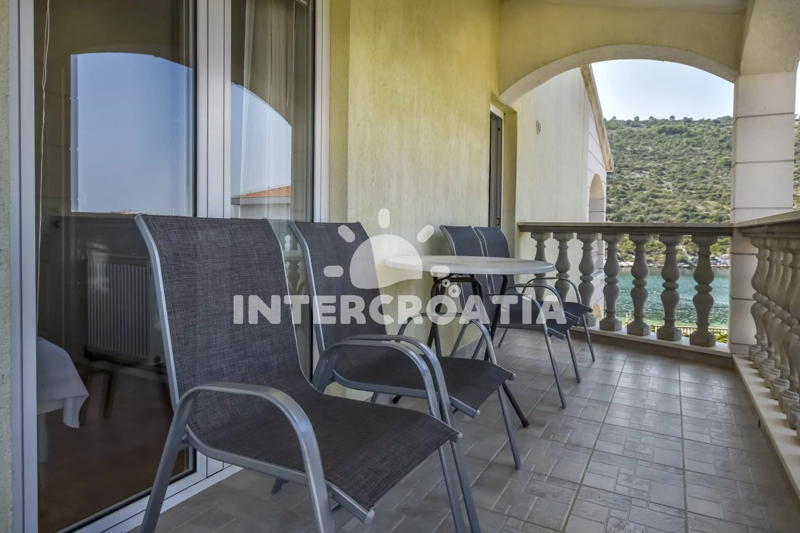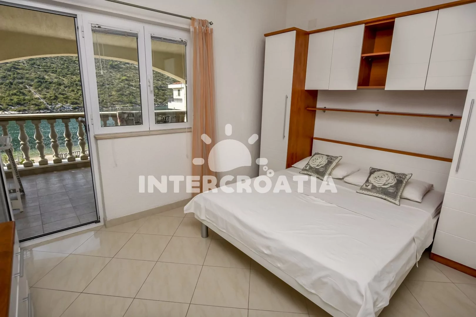 Apartmán (60 m2) s terasou, balkonem a výhledem na moře se nachází v 2. patře domu a je vhodný pro 4 osoby. Kuchyňská linka je vybavena varnou deskou, digestoří, vestavěnou troubou, rychlovarnou…