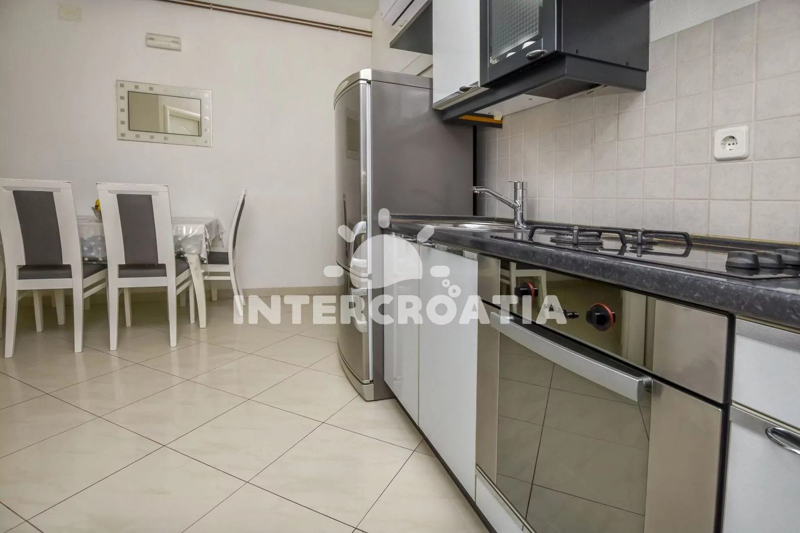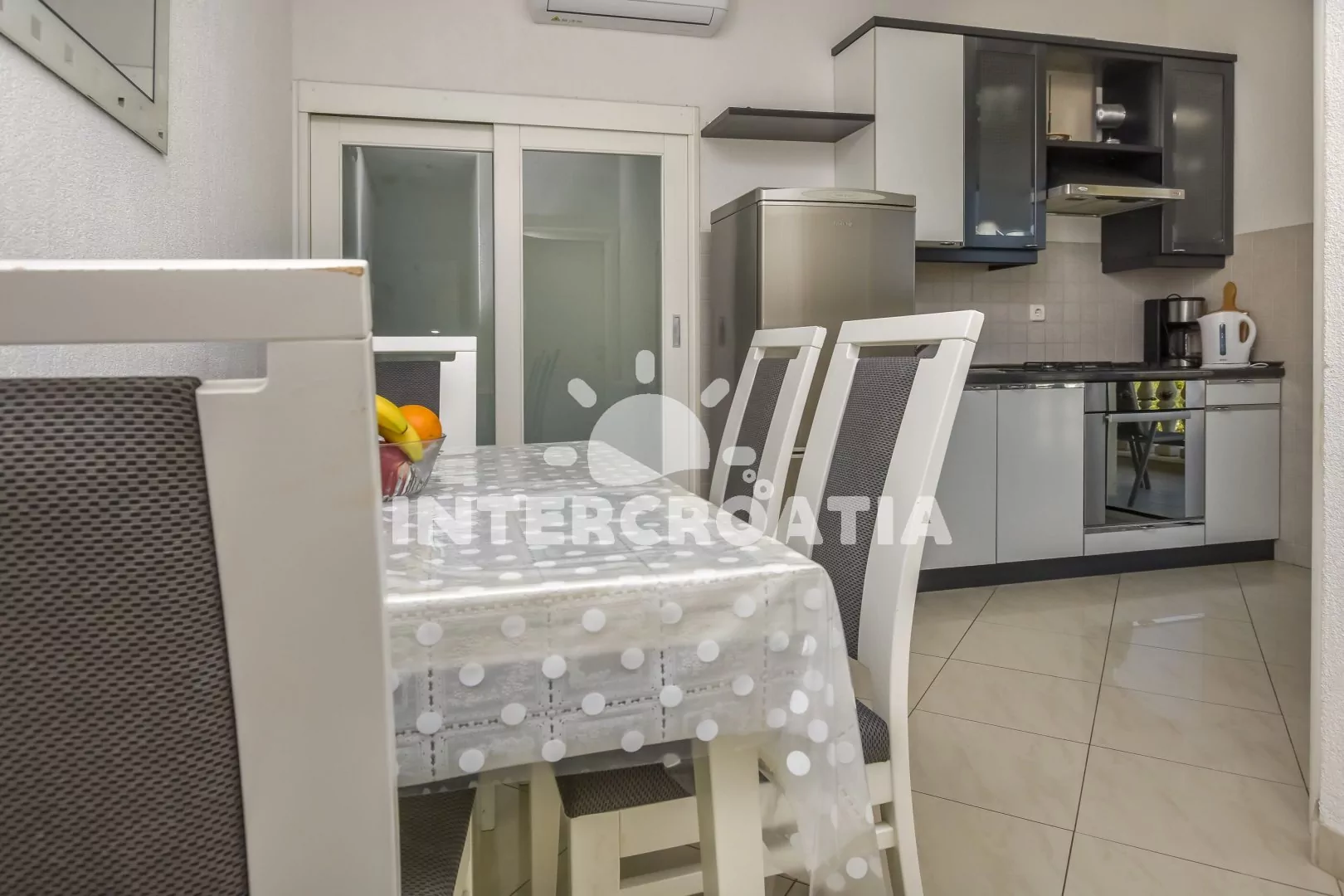 Apartmán (60 m2) s terasou, balkonem a výhledem na moře se nachází v 2. patře domu a je vhodný pro 4 osoby. Kuchyňská linka je vybavena varnou deskou, digestoří, vestavěnou troubou, rychlovarnou konvicí, kávovarem, nádobím a lednicí s mrazákem. Obývací část s jídelním stolem pro 4 osoby, televizí se satelitním programem a klimatizací. První ložnice s dvoulůžkem a vstupem na terasu. Druhá ložnice s dvoulůžkem a vstupem na balkon. Koupelna se sprchovým koutem, umyvadlem, fénem a wc. Hostům je k dispozici parkování u objektu zdarma.