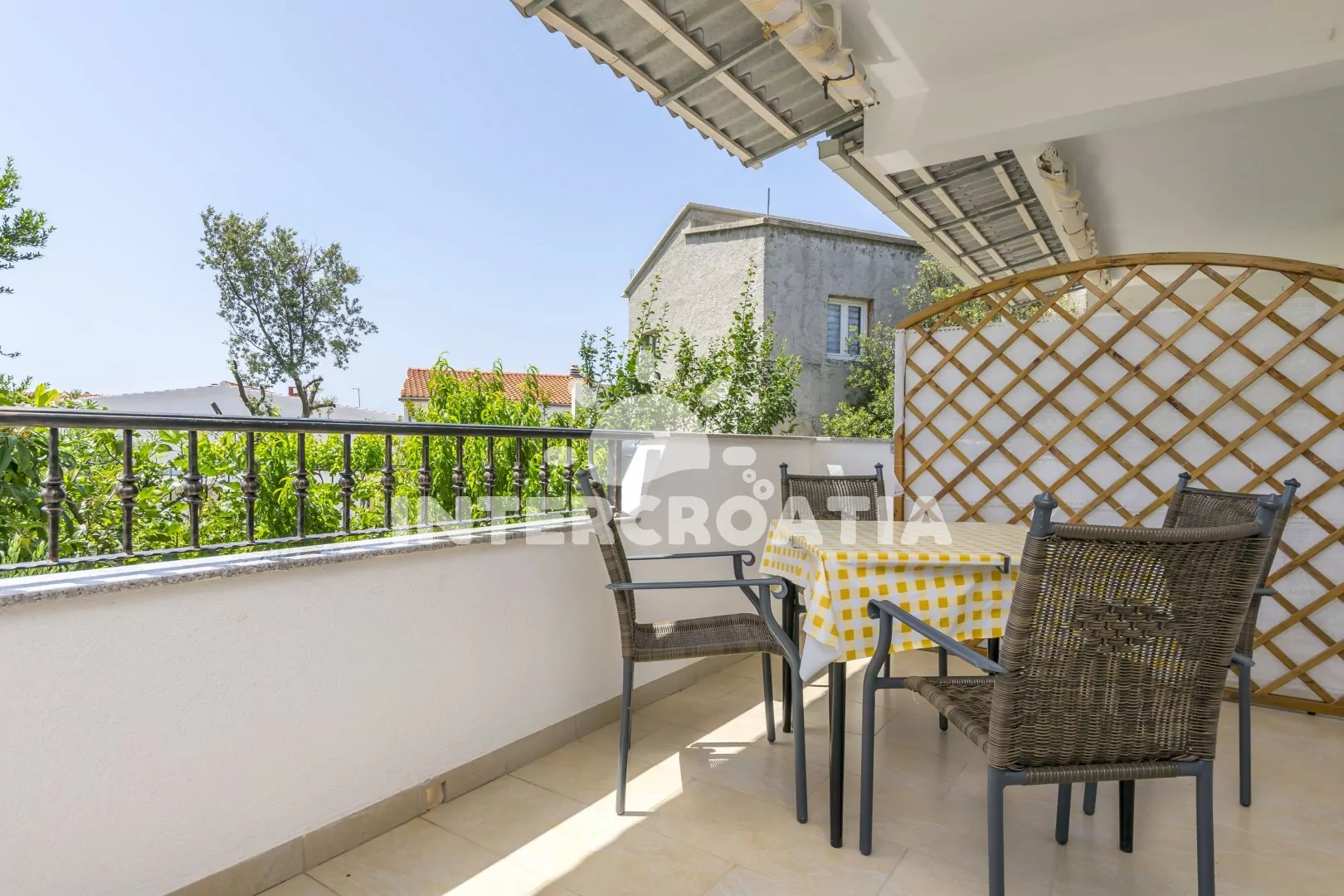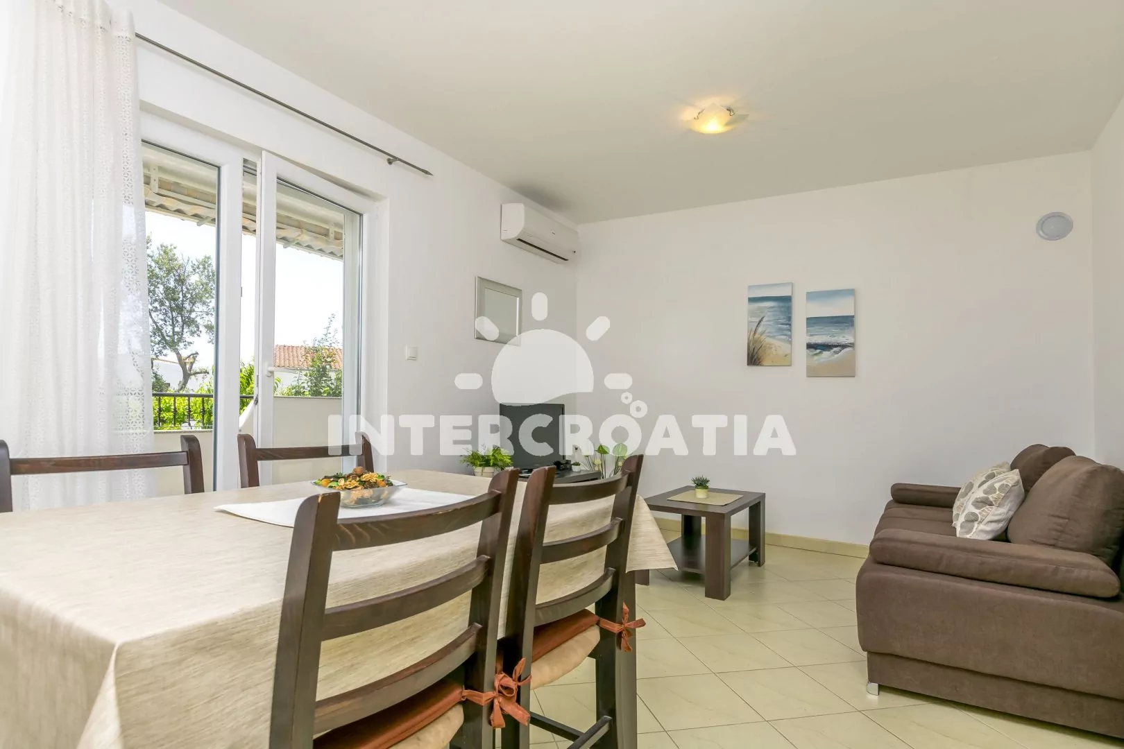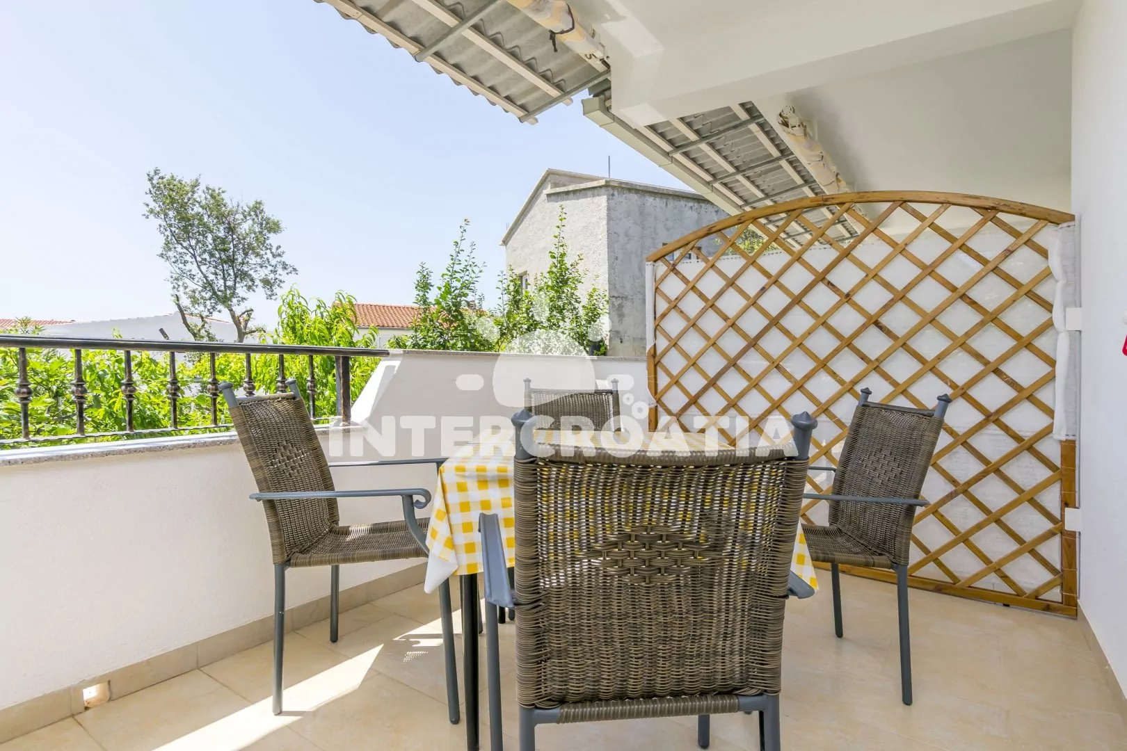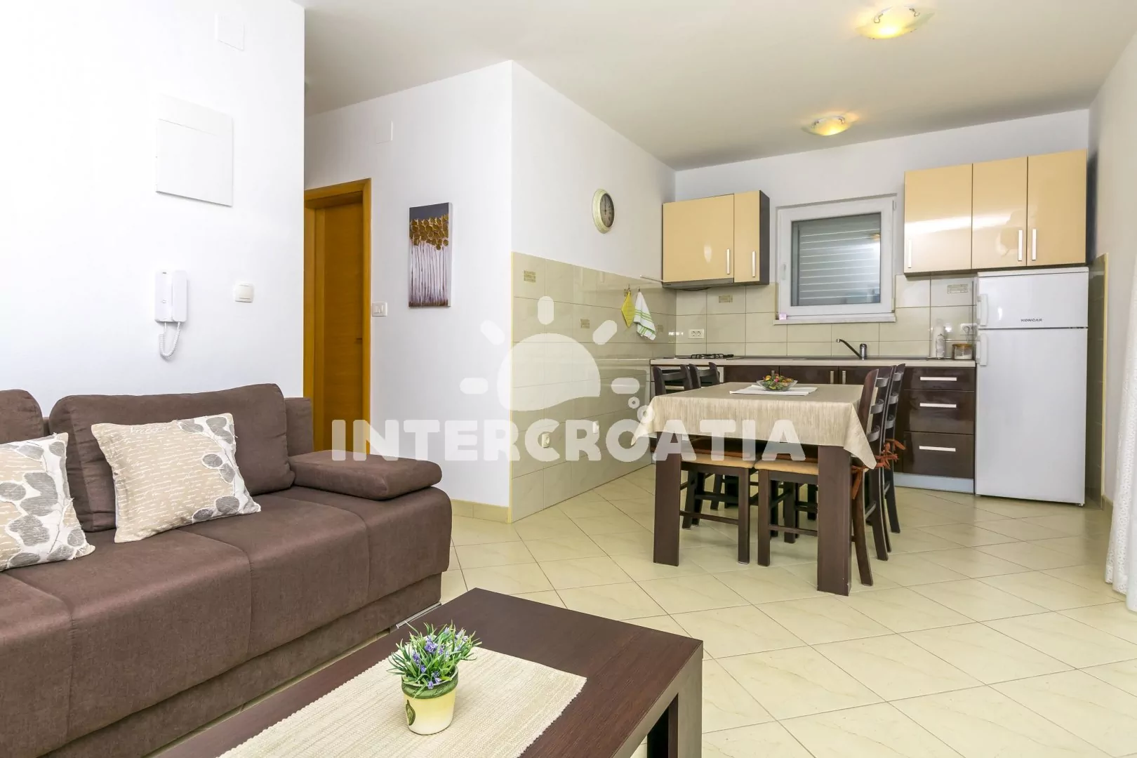 Apartmán (48 m2) s terasou a venkovním posezením se nachází ve zvýšeném přízemí domu a je vhodný pro 2 až 4 osoby. Obývací pokoj je spojený s kuchyní. Kuchyňská linka je vybavena varnou deskou, digestoří, vestavěnou troubou, rychlovarnou konvicí, nádobím a lednicí s mrazákem. Obývací pokoj s jídelním stolem pro 4 osoby, pohovkou (rozložitelná na extra lůžko pro 2 osoby), televizí se satelitním programem, klimatizací a vstupem na terasu. Ložnice s dvoulůžkem. Koupelna se sprchovým koutem, umyvadlem, fénem a wc. Hostům je k dispozici parkování u objektu zdarma.