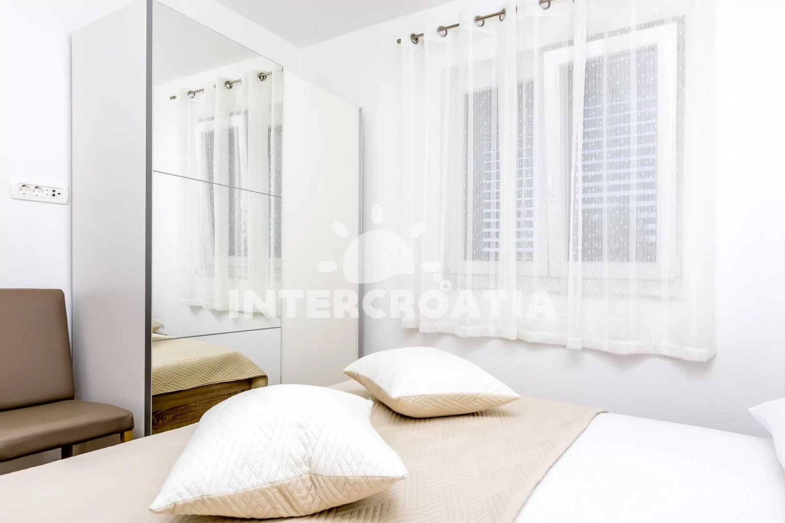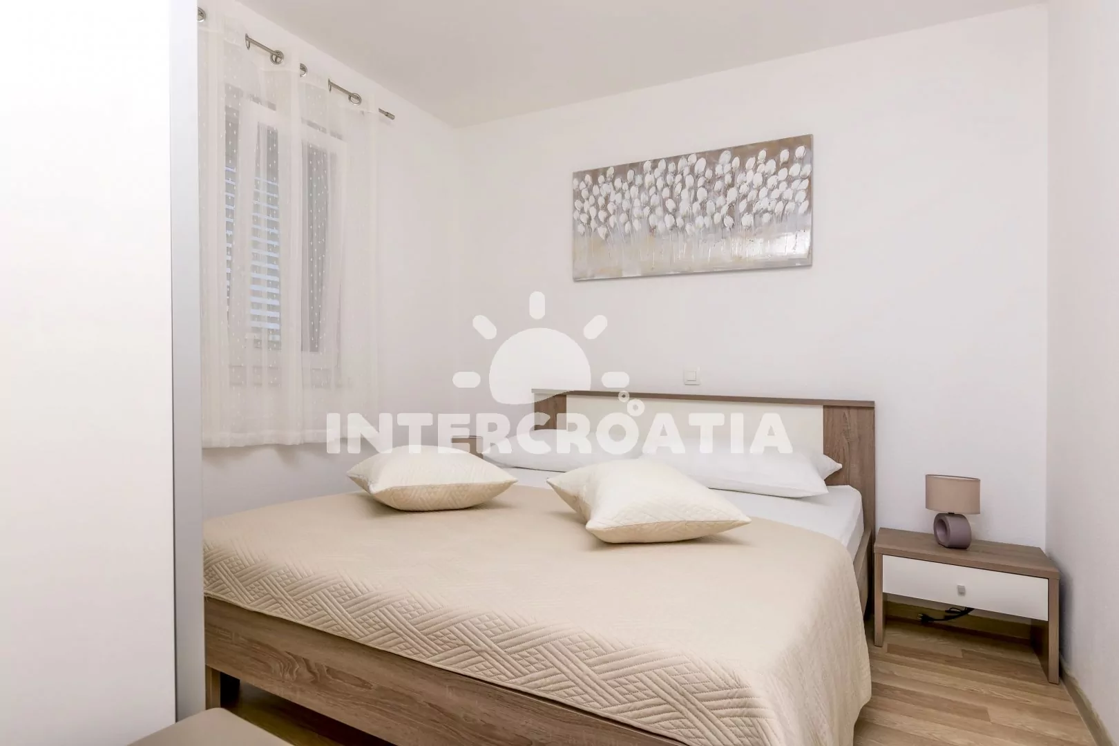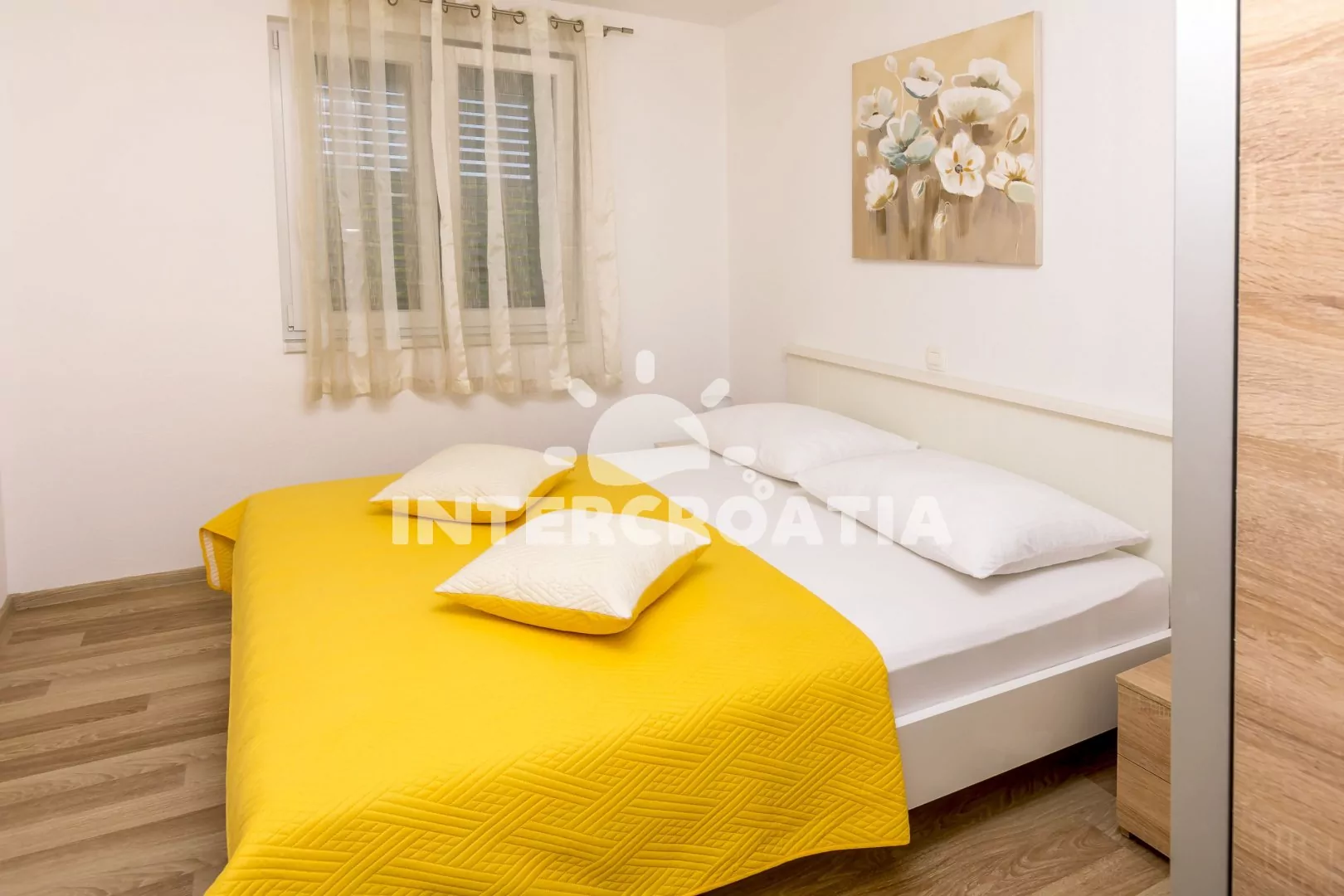 Apartmán (60 m2) s terasou a částečným výhledem na moře se nachází v 1. patře domu a je vhodný pro 4 až 6 osob. Obývací pokoj je spojený s kuchyní. Kuchyňská linka je vybavena sklokeramickou varnou deskou, digestoří, vestavěnou troubou, rychlovarnou konvicí, nádobím a lednicí s mrazákem. Obývací pokoj s jídelním stolem pro 4 osoby, pohovkou (rozložitelná na extra lůžko pro 2 osoby), televizí se satelitním programem, klimatizací a vstupem na terasu. První i druhá ložnice je vybavena vždy s jedním dvoulůžkem. Koupelna se sprchovým koutem, umyvadlem, fénem a wc. Hostům je k dispozici parkování u objektu zdarma.
