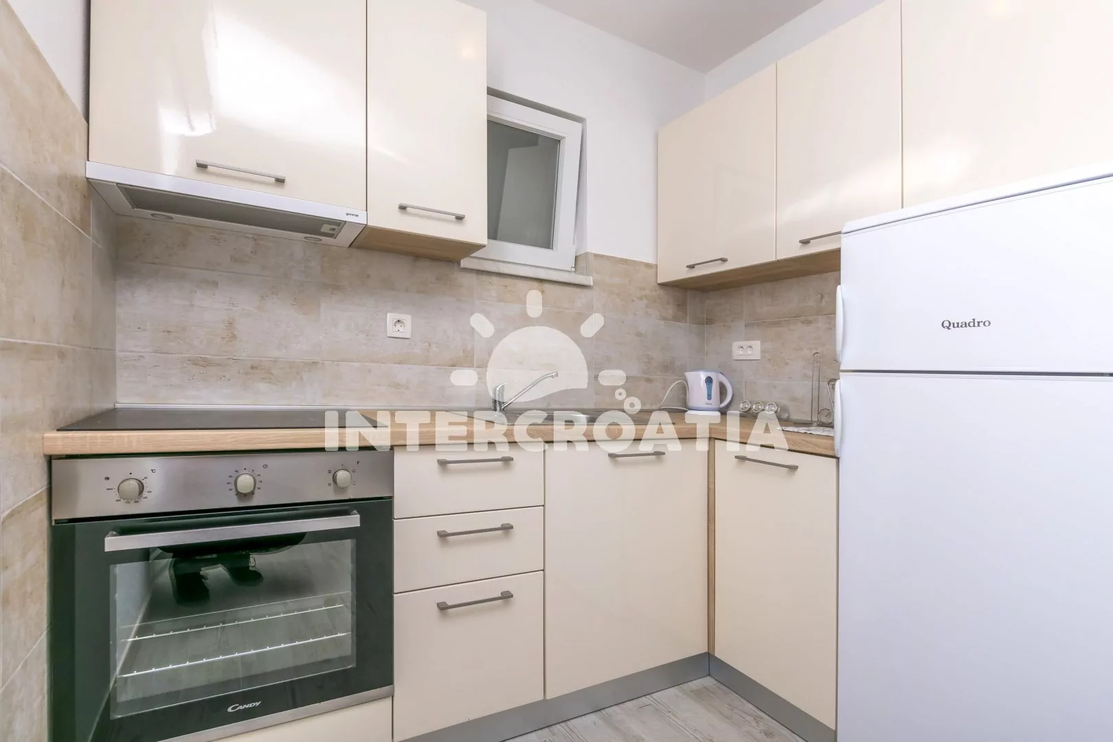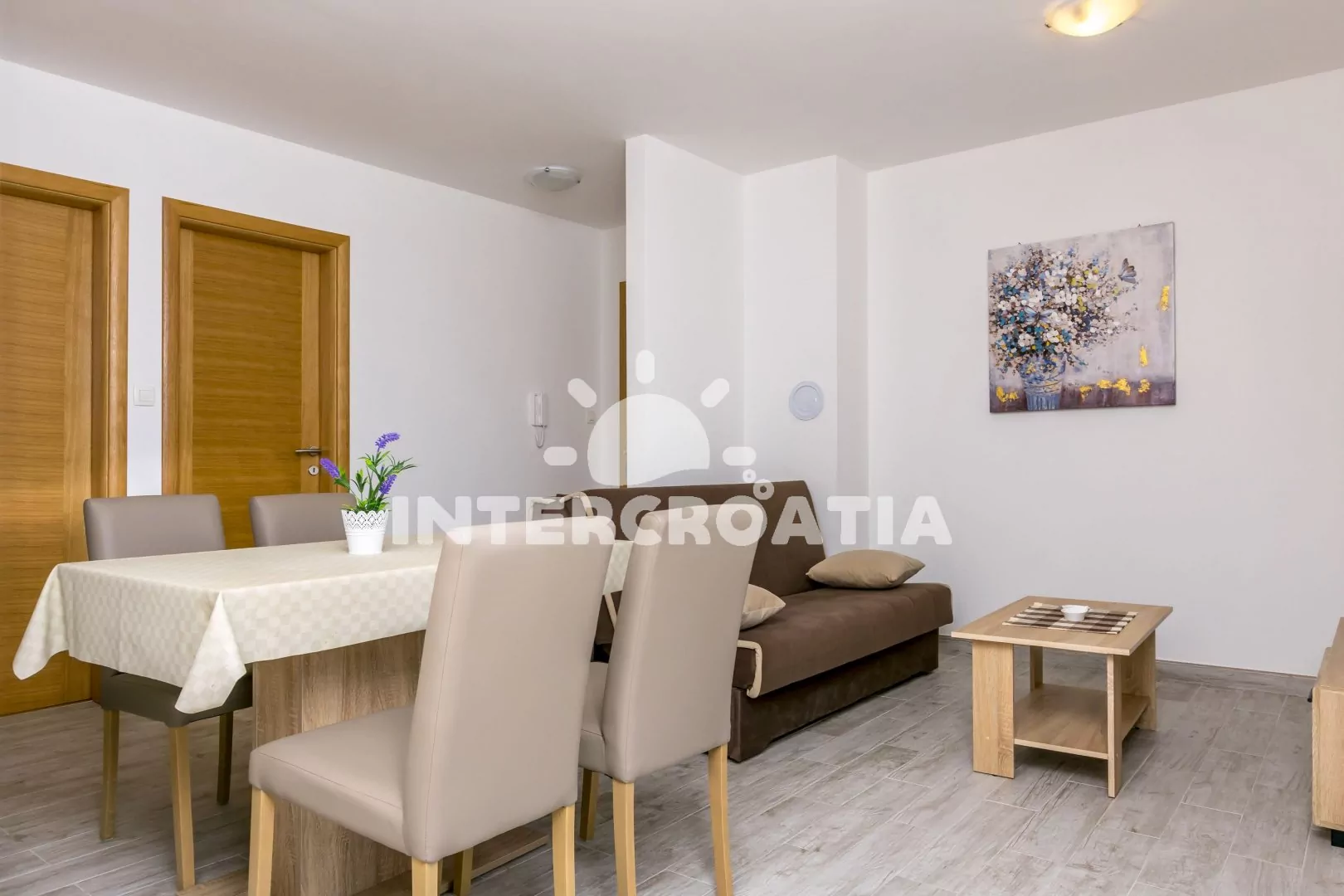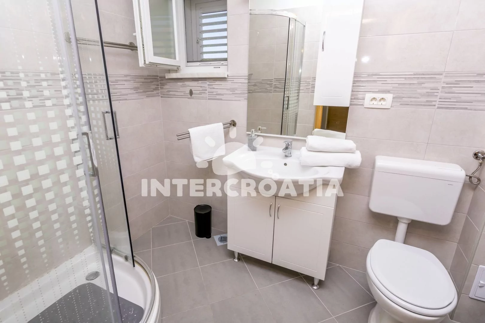 Apartmán (60 m2) s terasou a částečným výhledem na moře se nachází v 1. patře domu a je vhodný pro 4 až 6 osob. Obývací pokoj je spojený s kuchyní. Kuchyňská linka je vybavena sklokeramickou varnou deskou, digestoří, vestavěnou troubou, rychlovarnou konvicí, nádobím a lednicí s mrazákem. Obývací pokoj s jídelním stolem pro 4 osoby, pohovkou (rozložitelná na extra lůžko pro 2 osoby), televizí se satelitním programem, klimatizací a vstupem na terasu. První i druhá ložnice je vybavena vždy s jedním dvoulůžkem. Koupelna se sprchovým koutem, umyvadlem, fénem a wc. Hostům je k dispozici parkování u objektu zdarma.