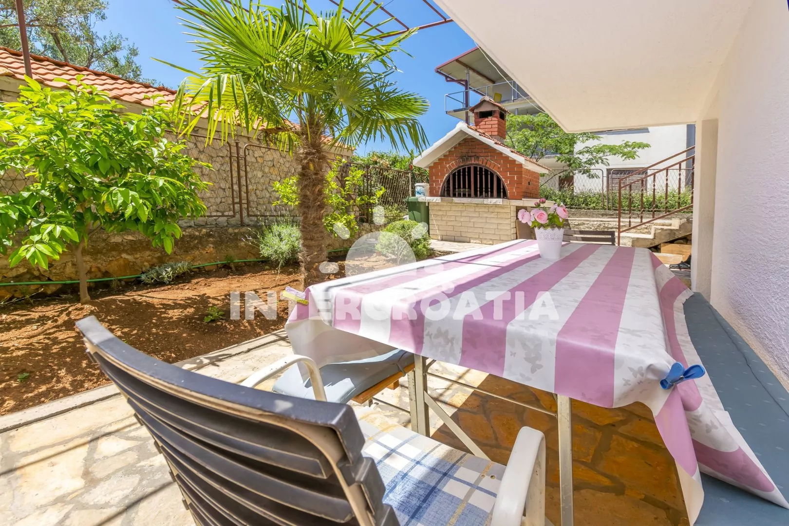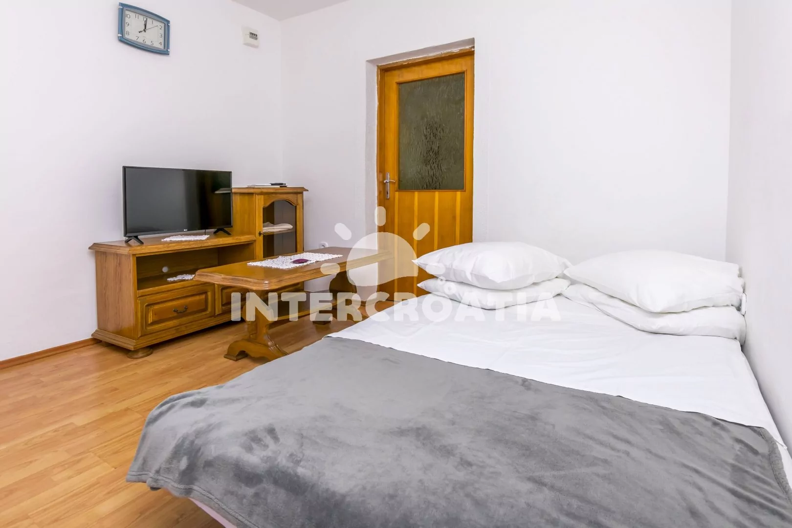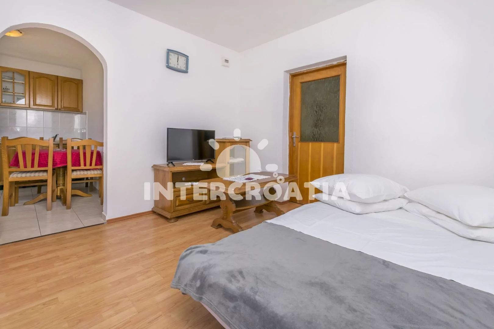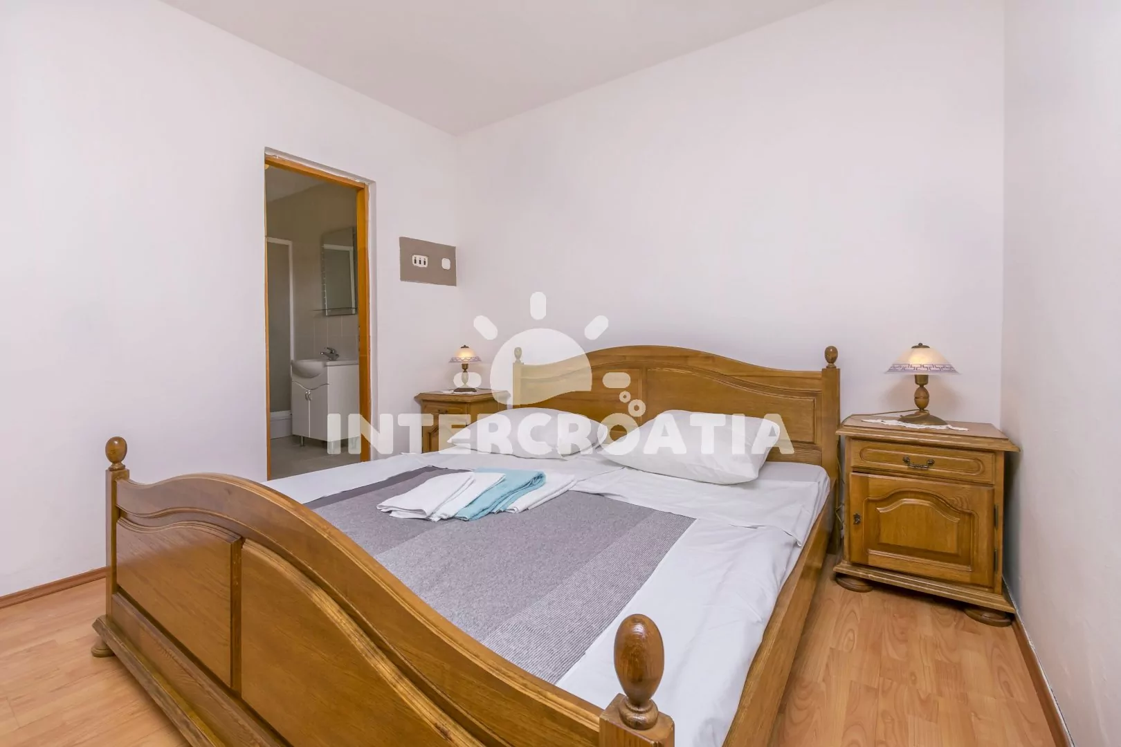 Apartmán (36 m2) se sdíleným balkonem, výhledem na moře a do klidné ulice se nachází v 1. patře domu a je vhodný pro 2 až 4 osoby. Obývací pokoj je spojený s kuchyní. Kuchyňská linka je vybavena sporákem s troubou, digestoří, rychlovarnou konvicí, nádobím a lednicí s mrazákem. Obývací pokoj s jídelním stolem pro 4 osoby, pohovkou (rozložitelná na extra lůžko pro 2 osoby, televizí se satelitním programem, klimatizací a vstupem na balkon. Ložnice s dvoulůžkem. Koupelna se sprchovým koutem, umyvadlem a wc. Hostům je k dispozici parkování u objektu zdarma.