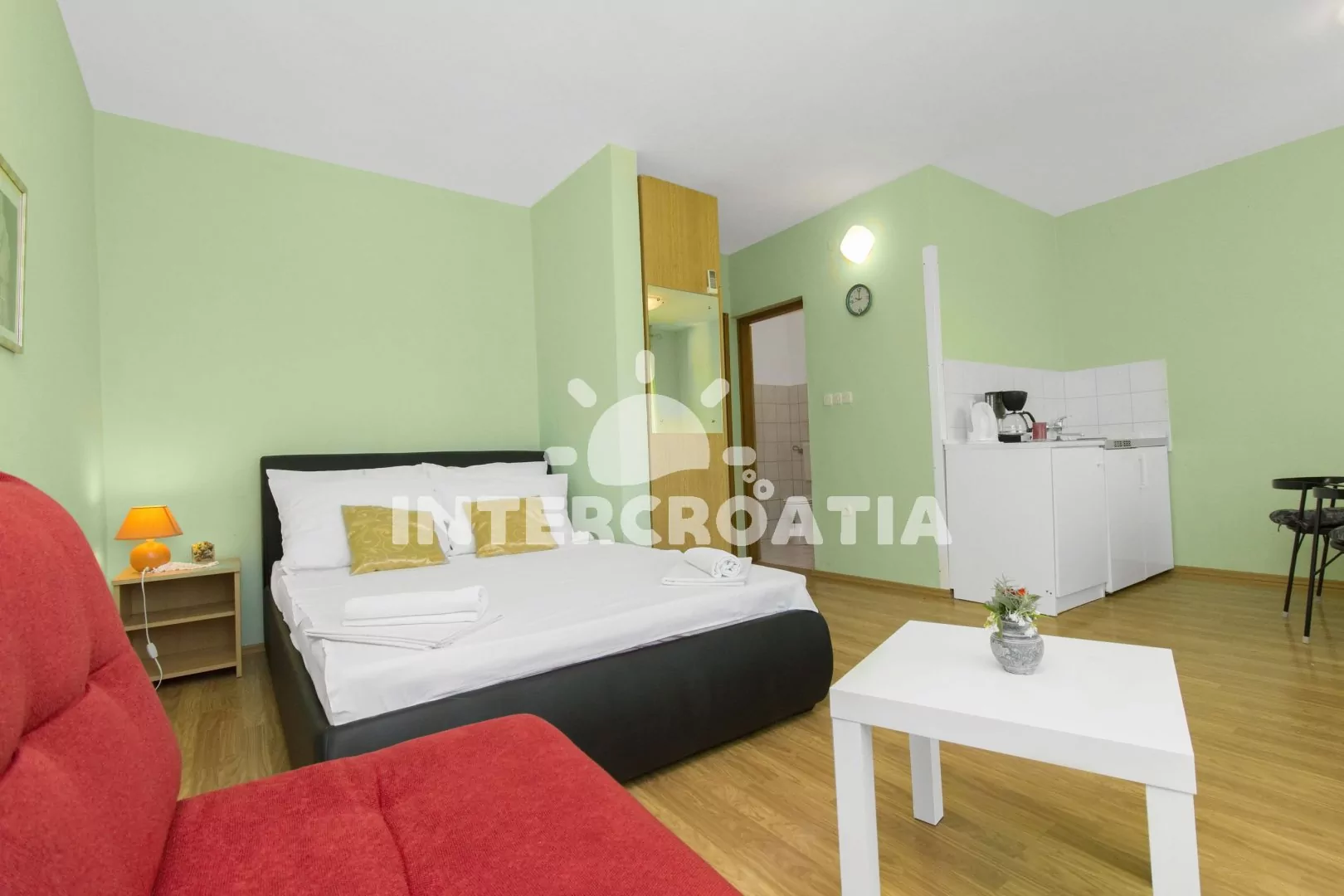 Apartmán (20 m2) typu studio s vlastním balkonem a výhledem do dvora se nachází v 1. patře domu. Obývací místnost je spojena s kuchyní. Kuchyňská linka je vybavena dvouplotýnkovým vařičem, rychlovarnou konvicí, nádobím a lednicí s mrazákem, kávovar a mikrovlnná trouba na požádání. Obývací místnost s jídelním stolem, pohovkou, televizí, dvoulůžkem, klimatizací a vstupem na balkon. Koupelna se sprchovým koutem, umyvadlem a wc. Hostům je k dispozici parkování u objektu zdarma.