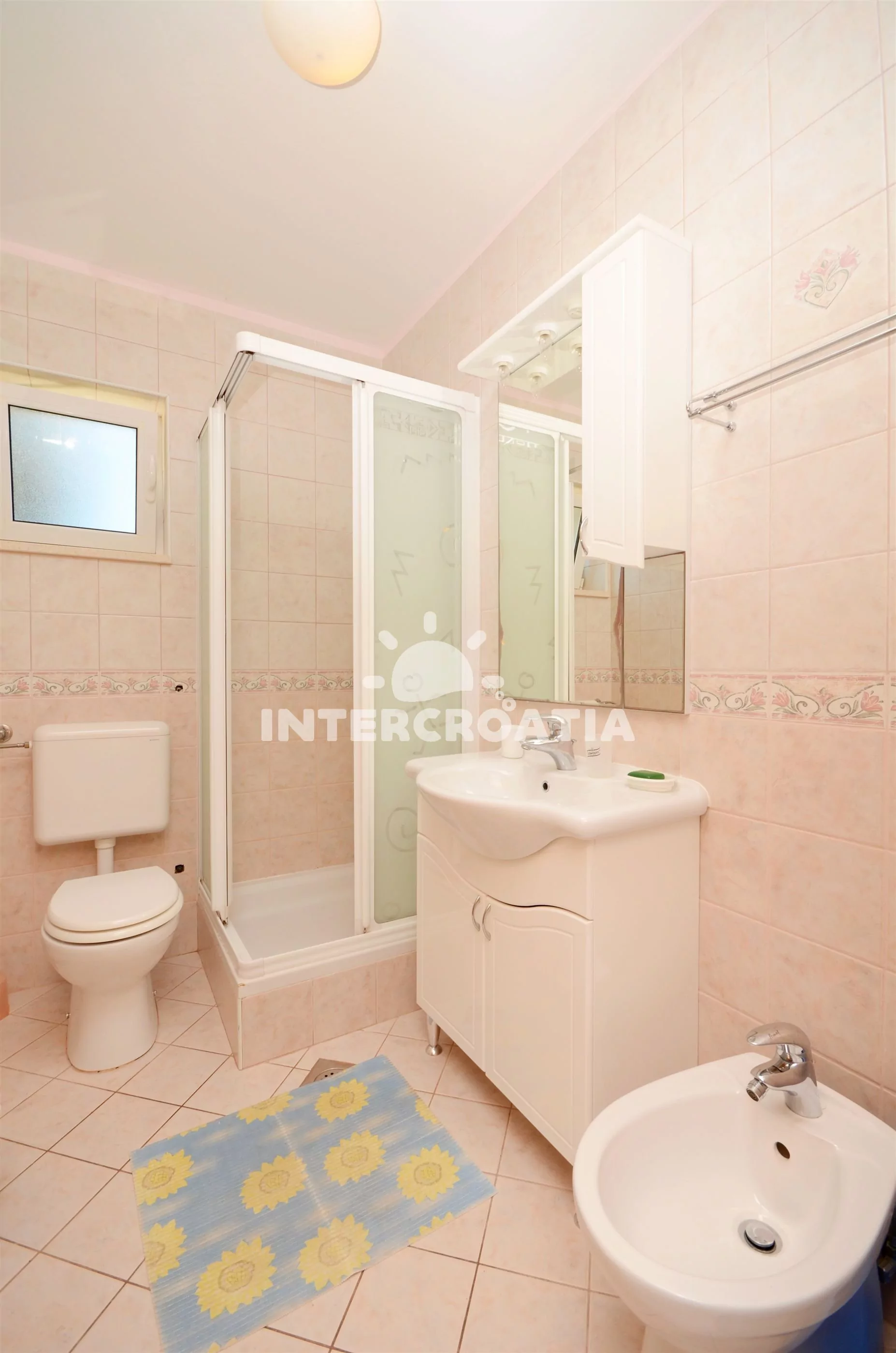 Apartmán (60 m2) s terasou, venkovním posezením a částečným výhledem na moře se nachází v 1. patře vily. Apartmán je vhodný pro 4 až 5 osob. Obývací pokoj je spojený s kuchyní. Kuchyňská linka je vybavena varnou deskou, nádobím a lednicí s mrazákem. Obývací pokoj s pohovkou (rozložitelná na extra lůžko pro 1 osobu), televizí se satelitním programem, radiem, klimatizací a vstupem na terasu. První ložnice s dvoulůžkem. Druhá ložnice s dvěma jednolůžky. Koupelna se sprchovým koutem, umyvadlem a wc. Hostům je k dispozici parkování u objektu zdarma.