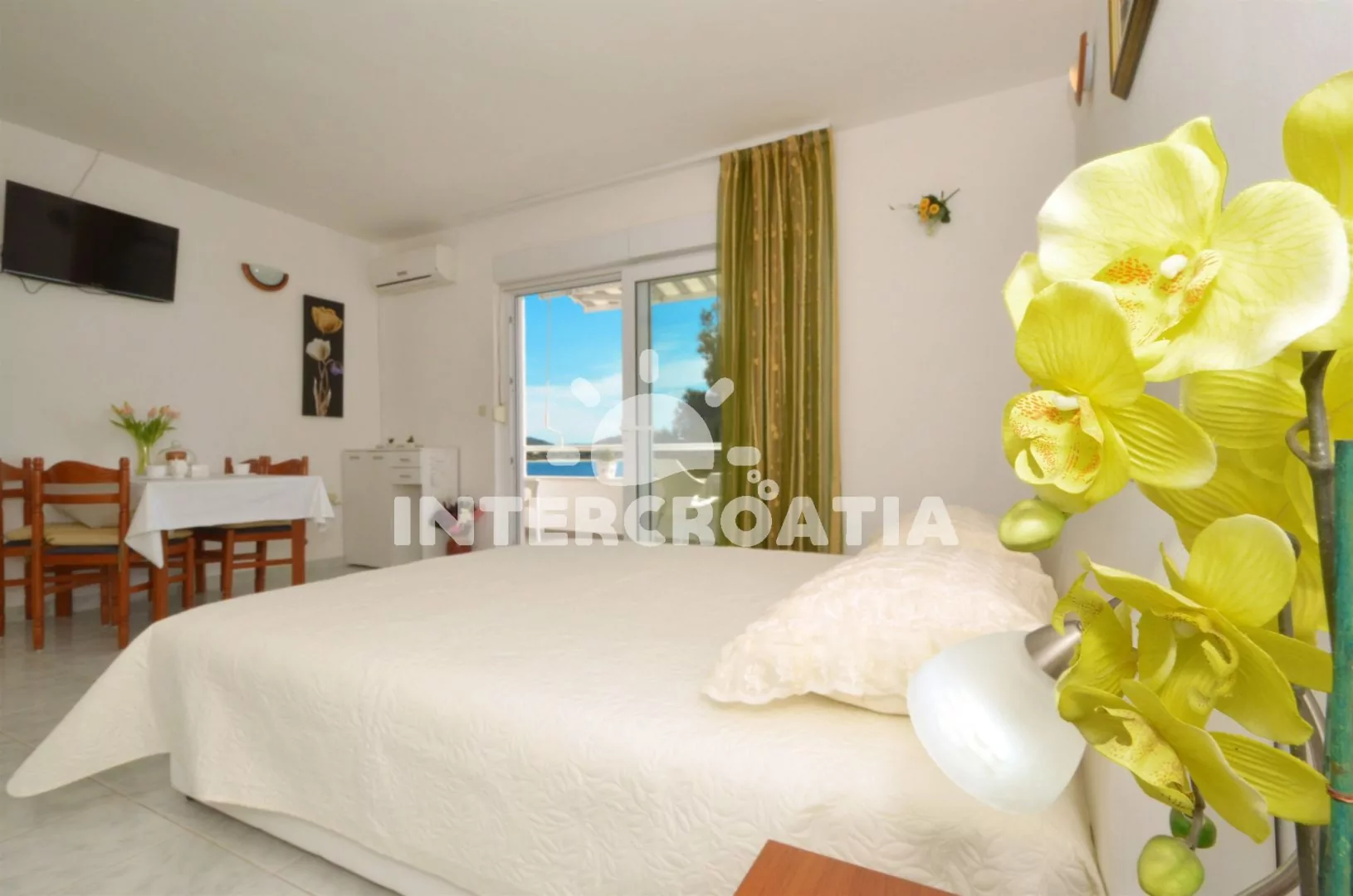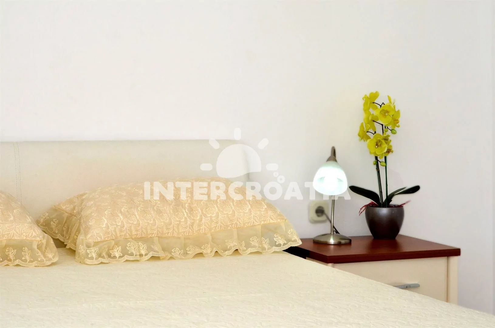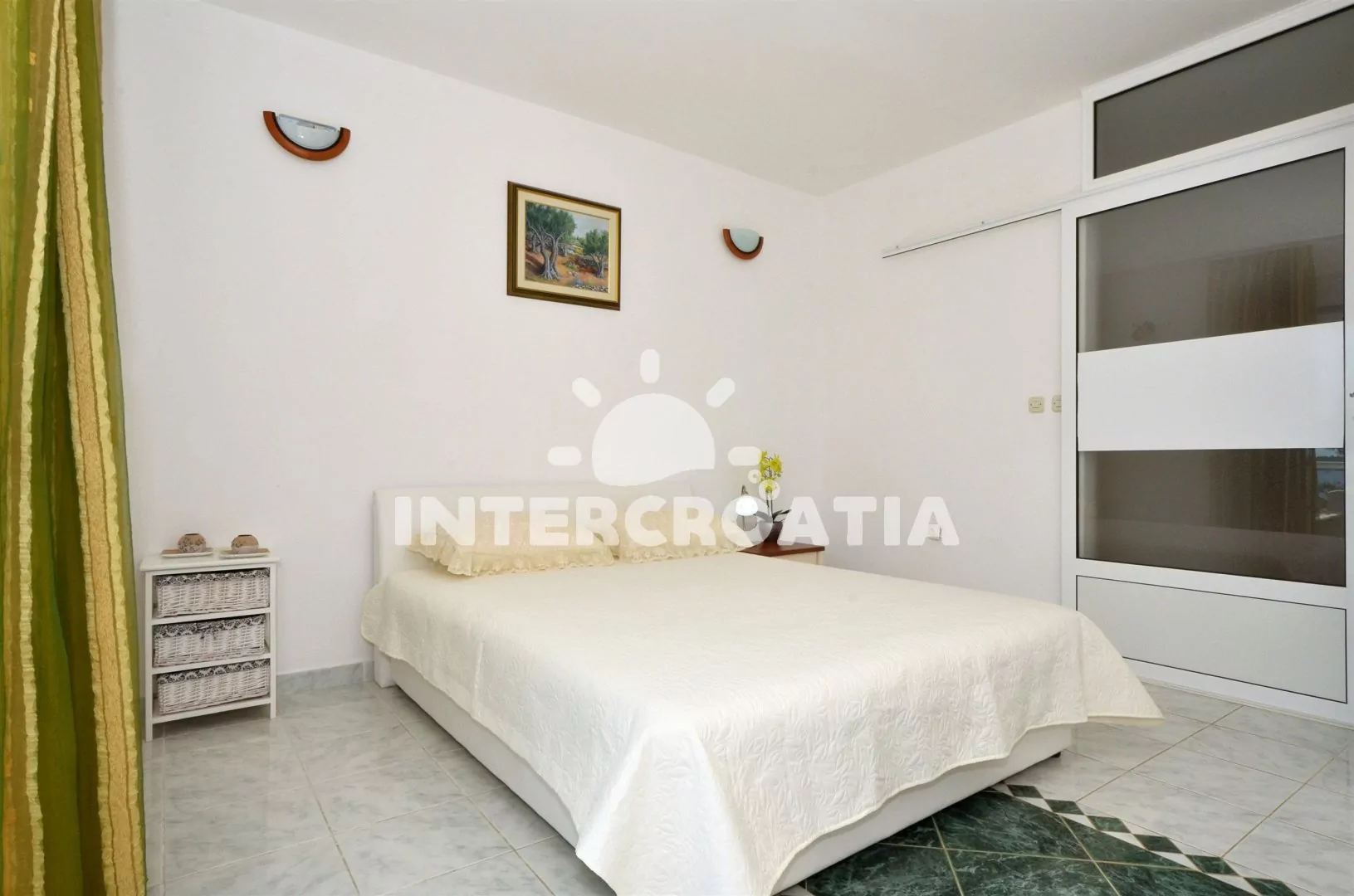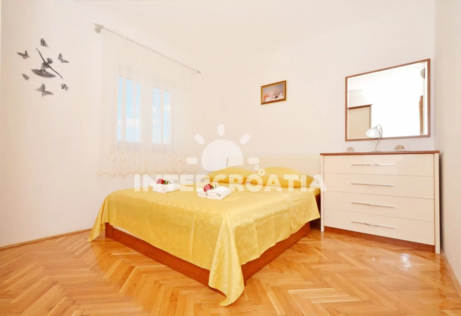 Apartmán (50 m2) s terasou a výhledem na moře se nachází v 1. patře domu a je vhodný pro 2 až 4 osoby. Obývací pokoj je spojený s kuchyní. Kuchyňská linka je vybavena varnou deskou, vestavěnou troubou, rychlovarnou konvicí, kávovarem, toustovačem, nádobím a lednicí s mrazákem. Obývací pokoj s jídelním stolem pro 4 osoby, televizí se satelitním programem, přistýlkou (lůžko pro 2 osoby), klimatizací a vstupem na terasu. Ložnice s jedním dvoulůžkem. Koupelna se sprchovým koutem, umyvadlem, pračkou a wc. Hostům je k dispozici parkování u objektu zdarma.