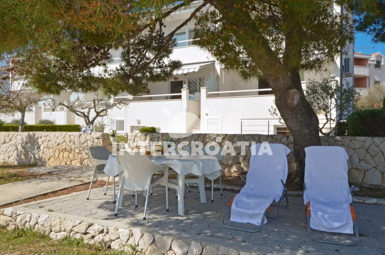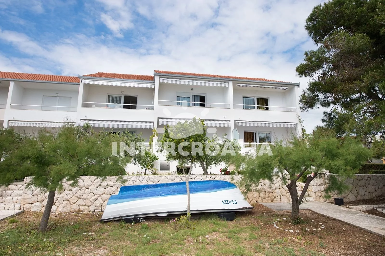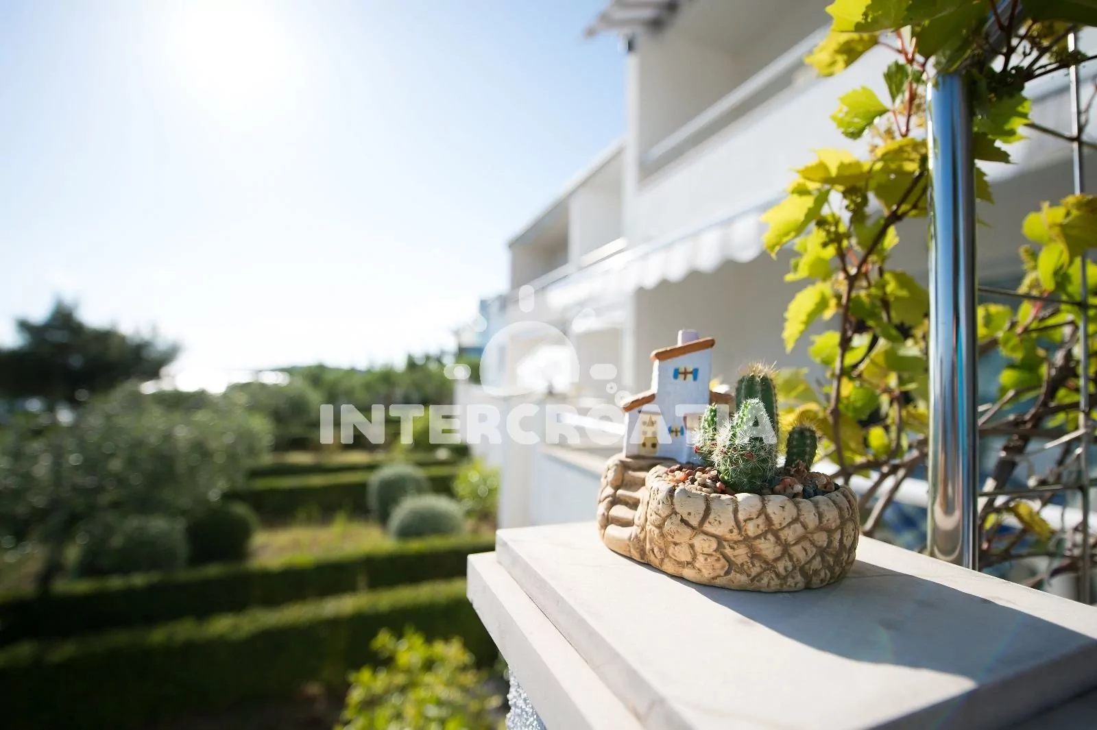 Apartmán (50 m2) s terasou a výhledem na moře se nachází v 1. patře domu. Apartmán má 1 ložnici a je vhodný pro 3 až 5 osob. Obývací pokoj je spojený s kuchyní. Kuchyňská linka je vybavena dvouplotýnkovým vařičem, digestoří, vestavěnou troubou, rychlovarnou konvicí, kávovarem, nádobím a lednicí s mrazákem. Obývací pokoj s jídelním stolem pro 4 osoby, přistýlkou (lůžko pro 2 osoby), televizí se satelitním programem, klimatizací a vstupem na terasu. Ložnice s dvoulůžkem a jedním jednolůžkem. Koupelna se sprchovým koutem, umyvadlem, fénem, pračkou a wc. Hostům je k dispozici parkování u objektu zdarma.