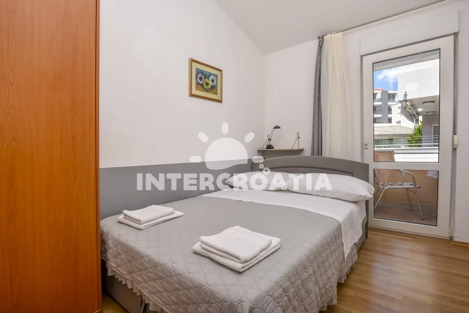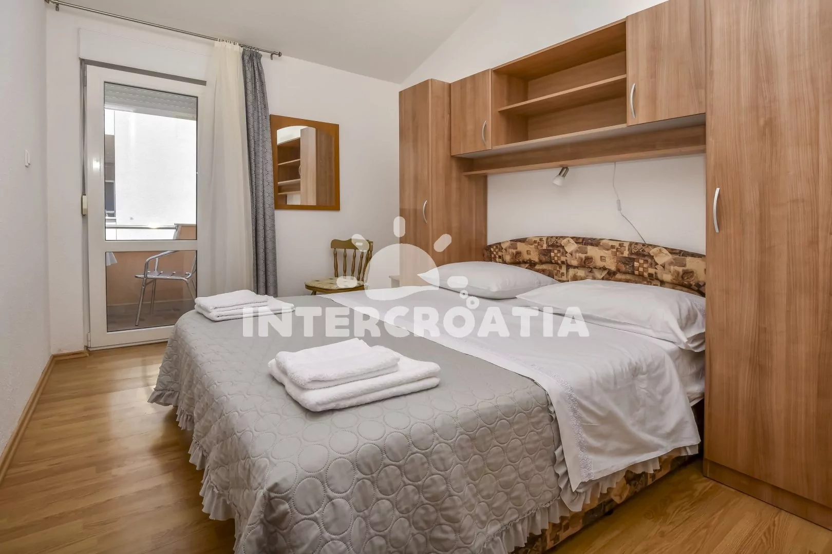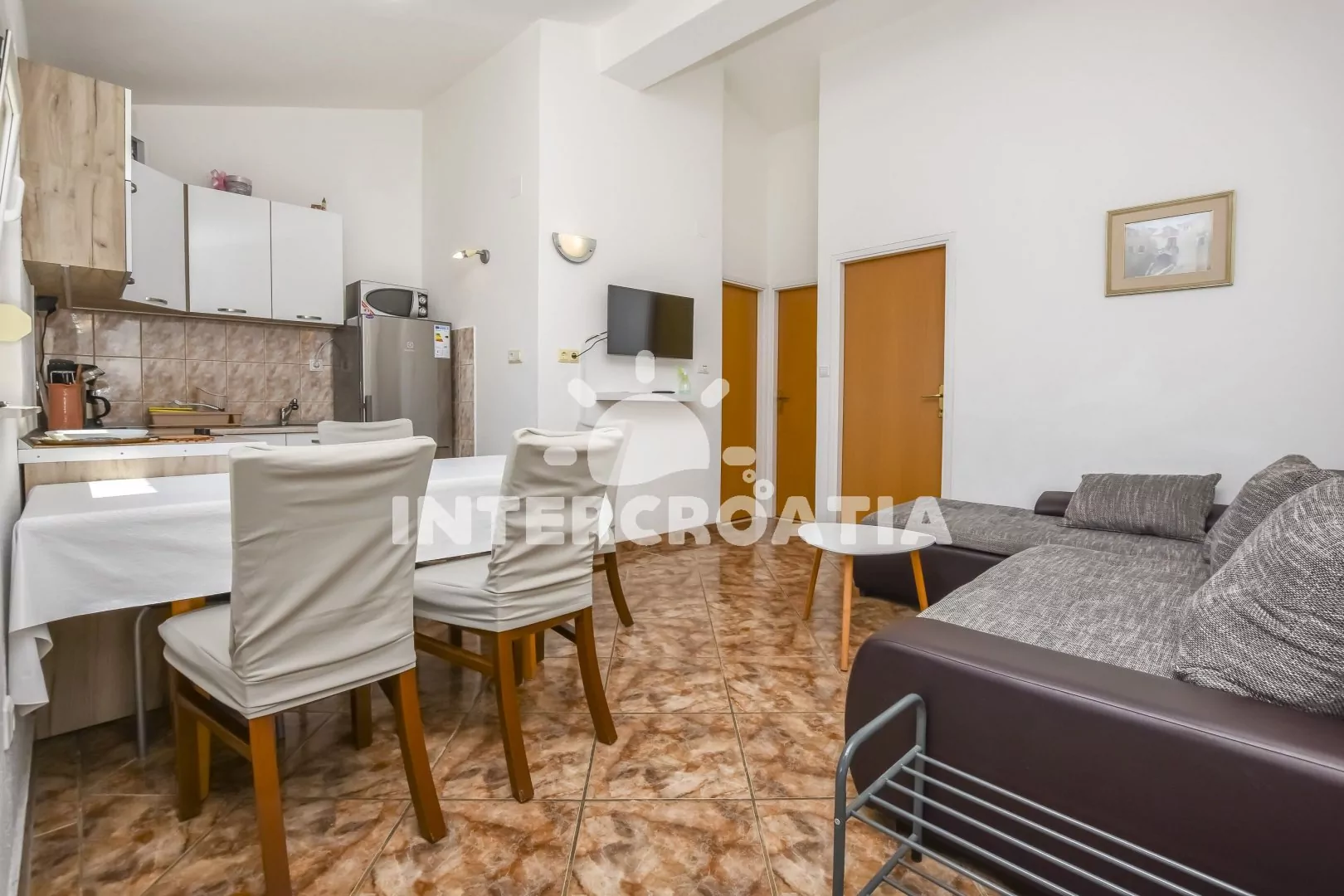 Apartmán (40 m2) s terasou a částečným výhledem na moře se nachází v 1. patře domu. Apartmán má dvě ložnice a je vhodný pro 4 osoby. Obývací pokoj je spojený s kuchyní. Kuchyňská linka je vybavena dvouplotýnkovou varnou deskou, troubou, myčkou na nádobí, rychlovarnou konvicí, kávovarem, mikrovlnnou troubou, nádobím a lednicí s mrazákem. Obývací pokoj s jídelním stolem pro 4 osoby, rohovou pohovkou, televizí se satelitním programem a klimatizací. První i druhá ložnice je vybavena vždy s jedním dvoulůžkem a vstupem na balkon. Koupelna se sprchovým koutem, umyvadlem, fénem a wc. Hostům je k dispozici parkování u objektu zdarma.