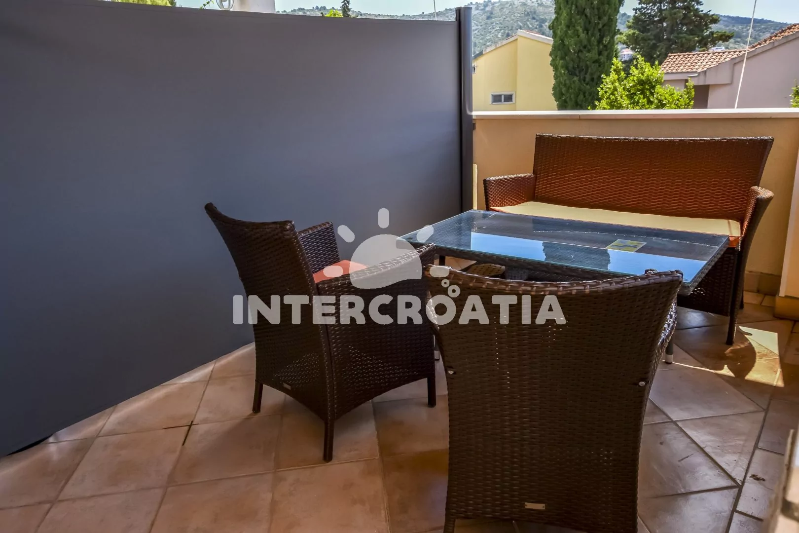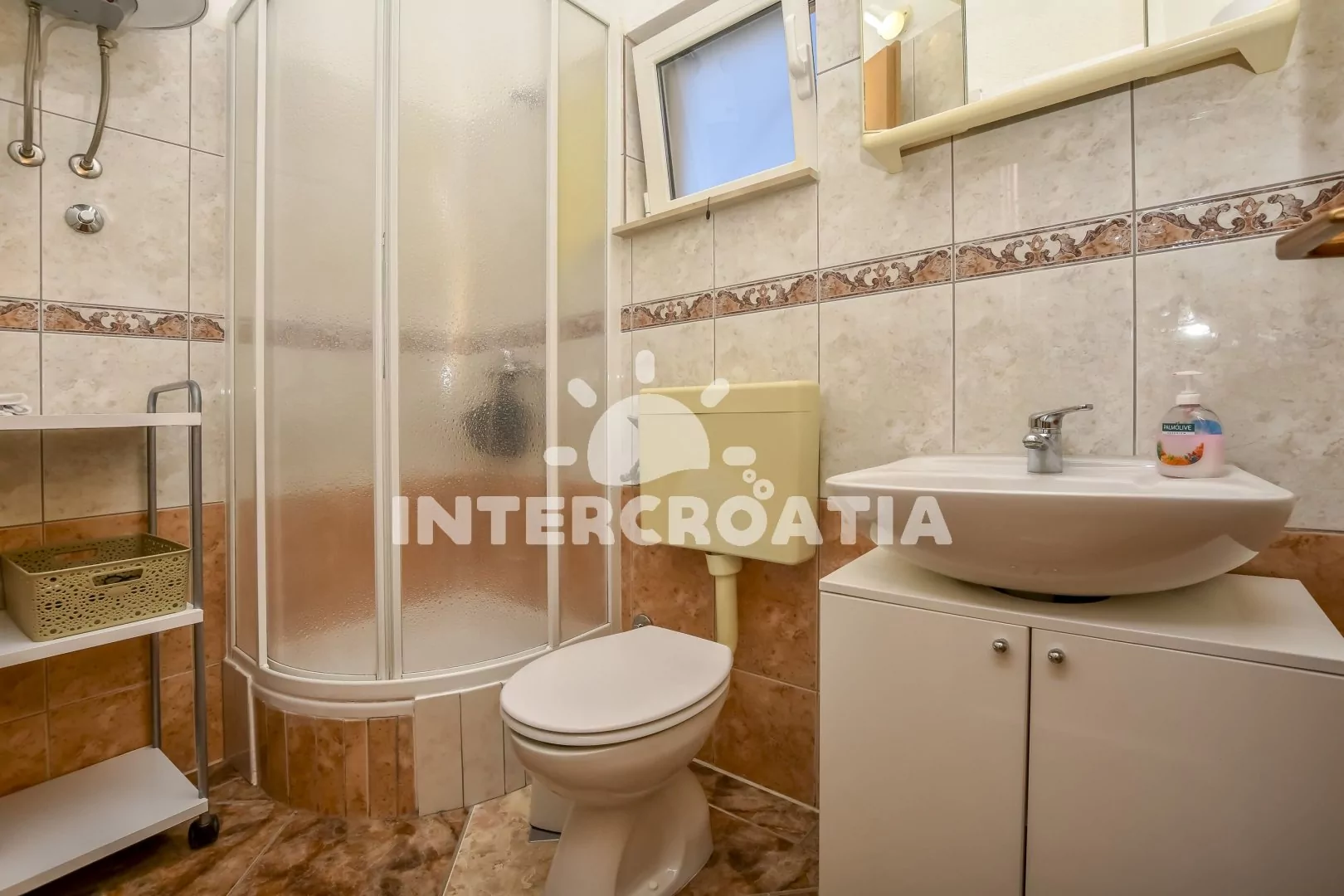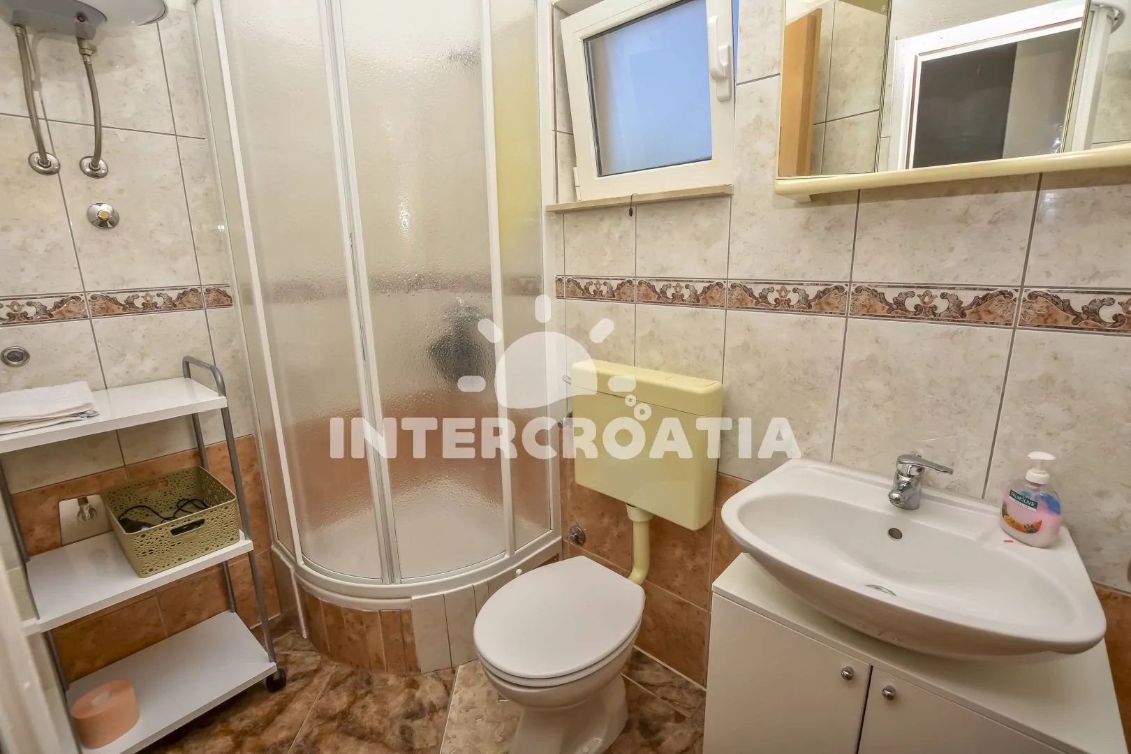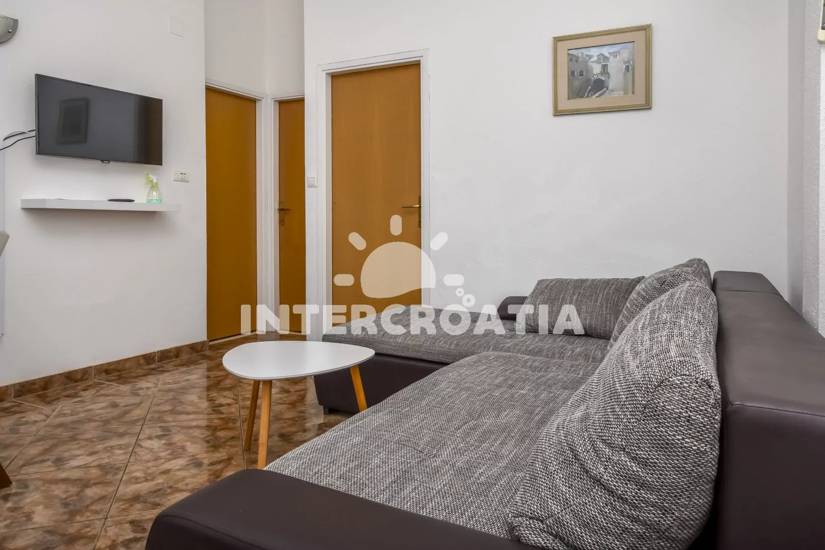 Apartmán (40 m2) s terasou a částečným výhledem na moře se nachází v 1. patře domu. Apartmán má dvě ložnice a je vhodný pro 4 osoby. Obývací pokoj je spojený s kuchyní. Kuchyňská linka je vybavena dvouplotýnkovou varnou deskou, troubou, myčkou na nádobí, rychlovarnou konvicí, kávovarem, mikrovlnnou troubou, nádobím a lednicí s mrazákem. Obývací pokoj s jídelním stolem pro 4 osoby, rohovou pohovkou, televizí se satelitním programem a klimatizací. První i druhá ložnice je vybavena vždy s jedním dvoulůžkem a vstupem na balkon. Koupelna se sprchovým koutem, umyvadlem, fénem a wc. Hostům je k dispozici parkování u objektu zdarma.