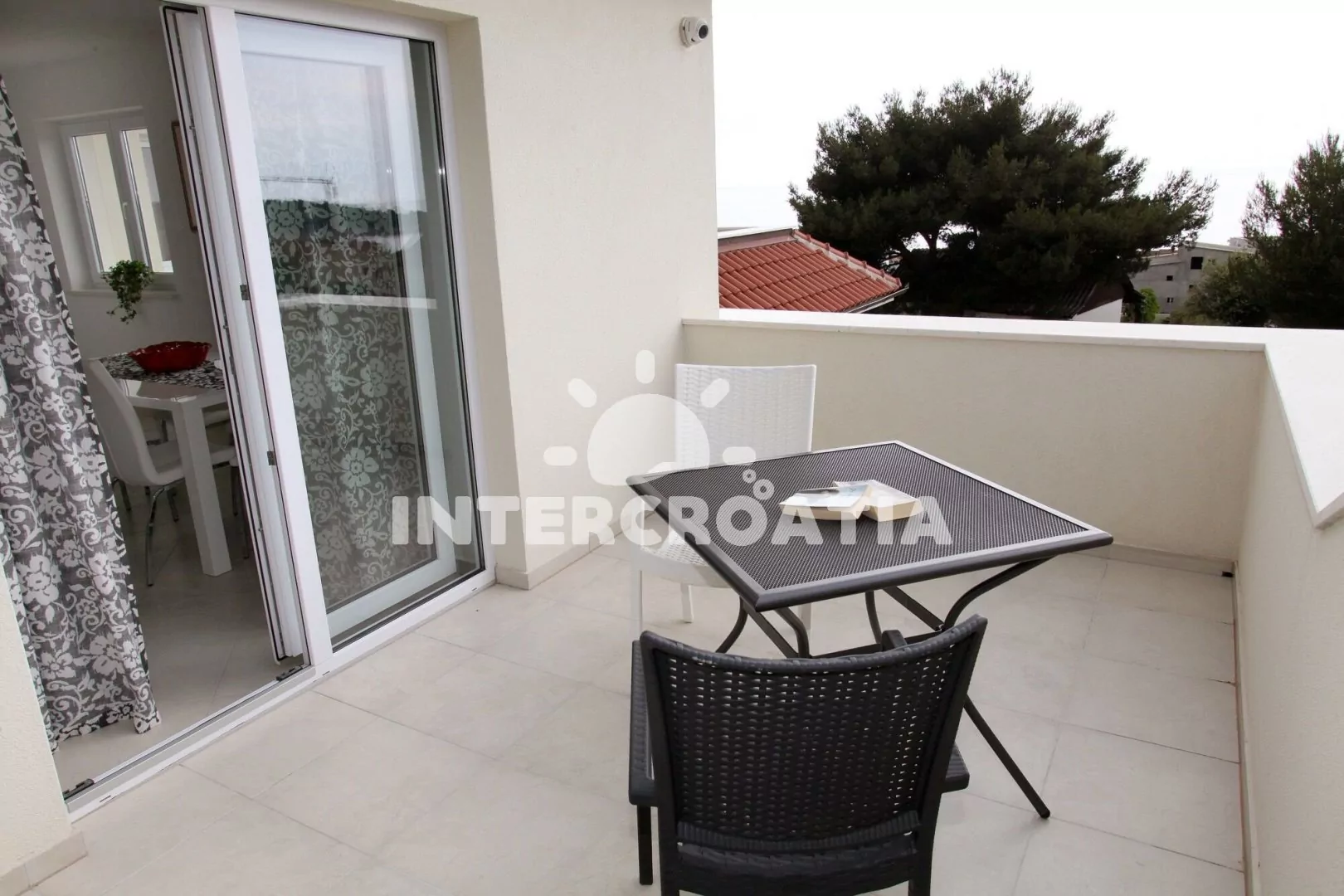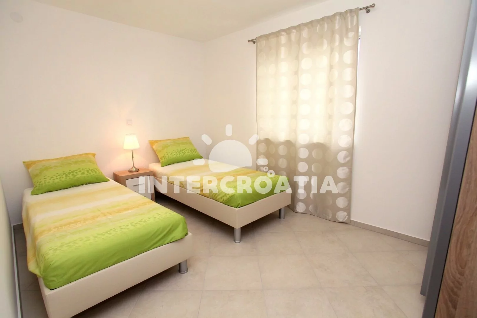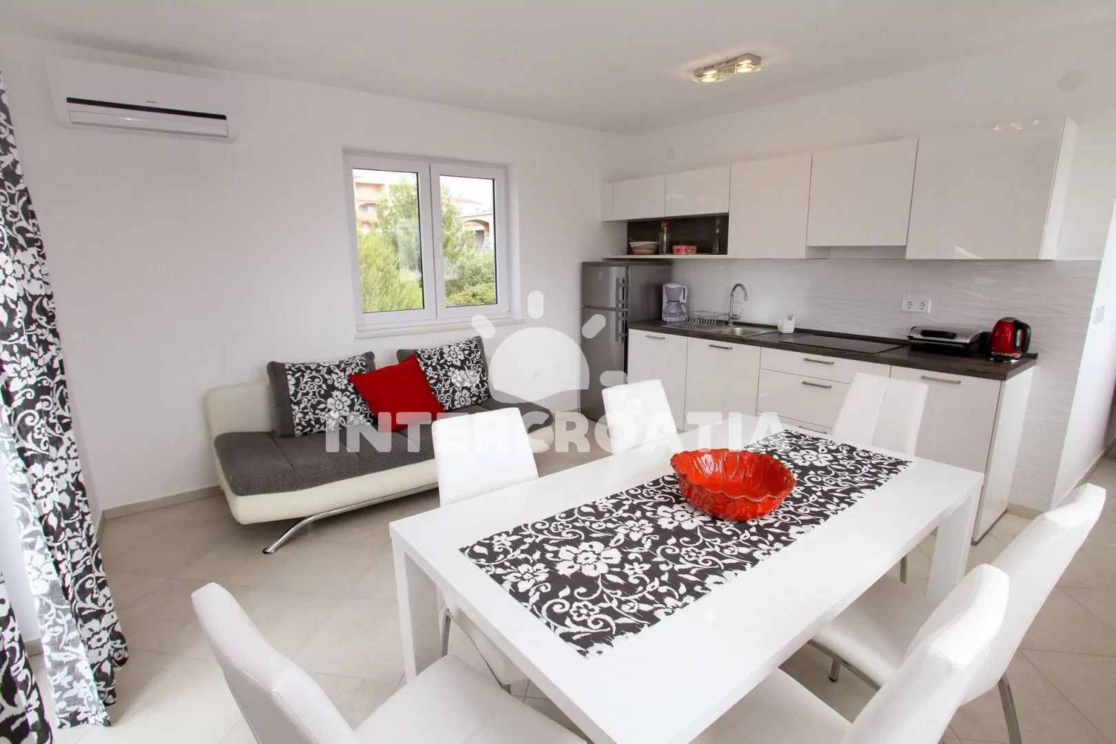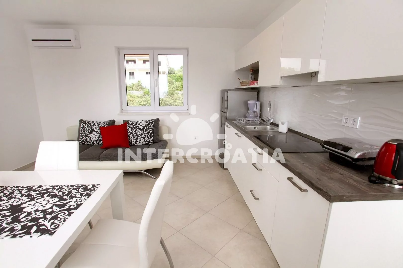 Apartmán (50 m2) s vlastní terasou a výhledem na moře se nachází v 1. patře vily. Apartmán má 2 ložnice a je vhodný pro 4 až 6 osob. Obývací pokoj je spojený s kuchyní. Kuchyňská linka je vybavena varnou deskou, rychlovarnou konvicí, kávovarem, myčkou na nádobí, nádobím a lednicí s mrazákem. Obývací pokoj s jídelním stolem pro 6 osob, pohovkou (rozložitelná na extra lůžko pro 2 osoby), televizí se satelitním programem, klimatizací a vstupem na terasu. První ložnice s dvoulůžkem. Druhá ložnice s dvěma jednolůžky. Koupelna se sprchovým koutem, umyvadlem, fénem a wc. Hostům je k dispozici parkování u objektu zdarma.